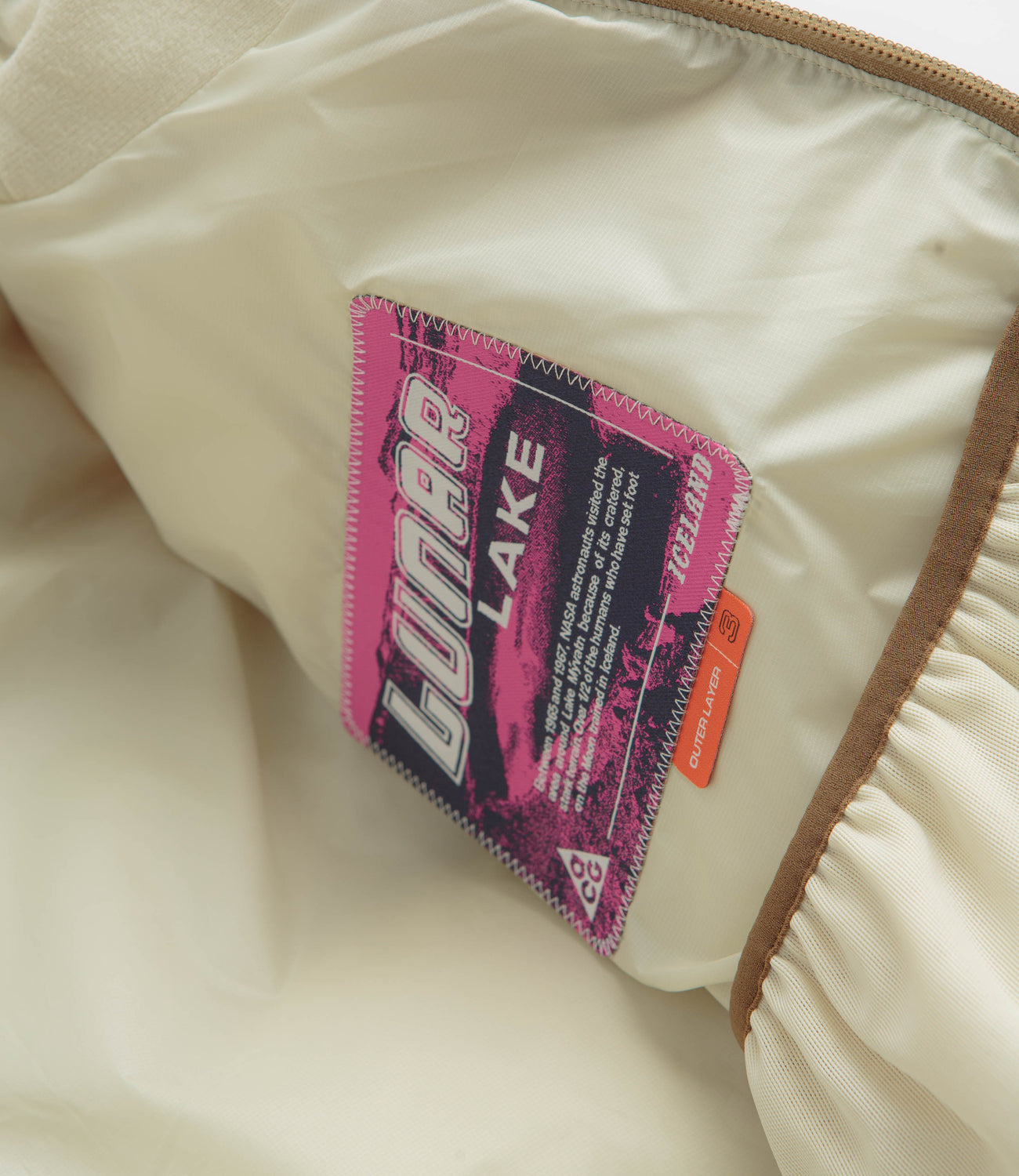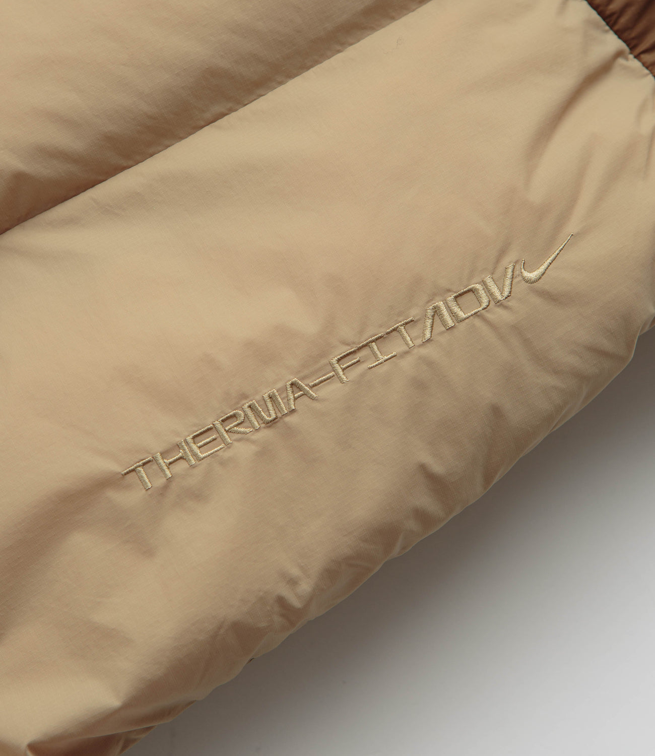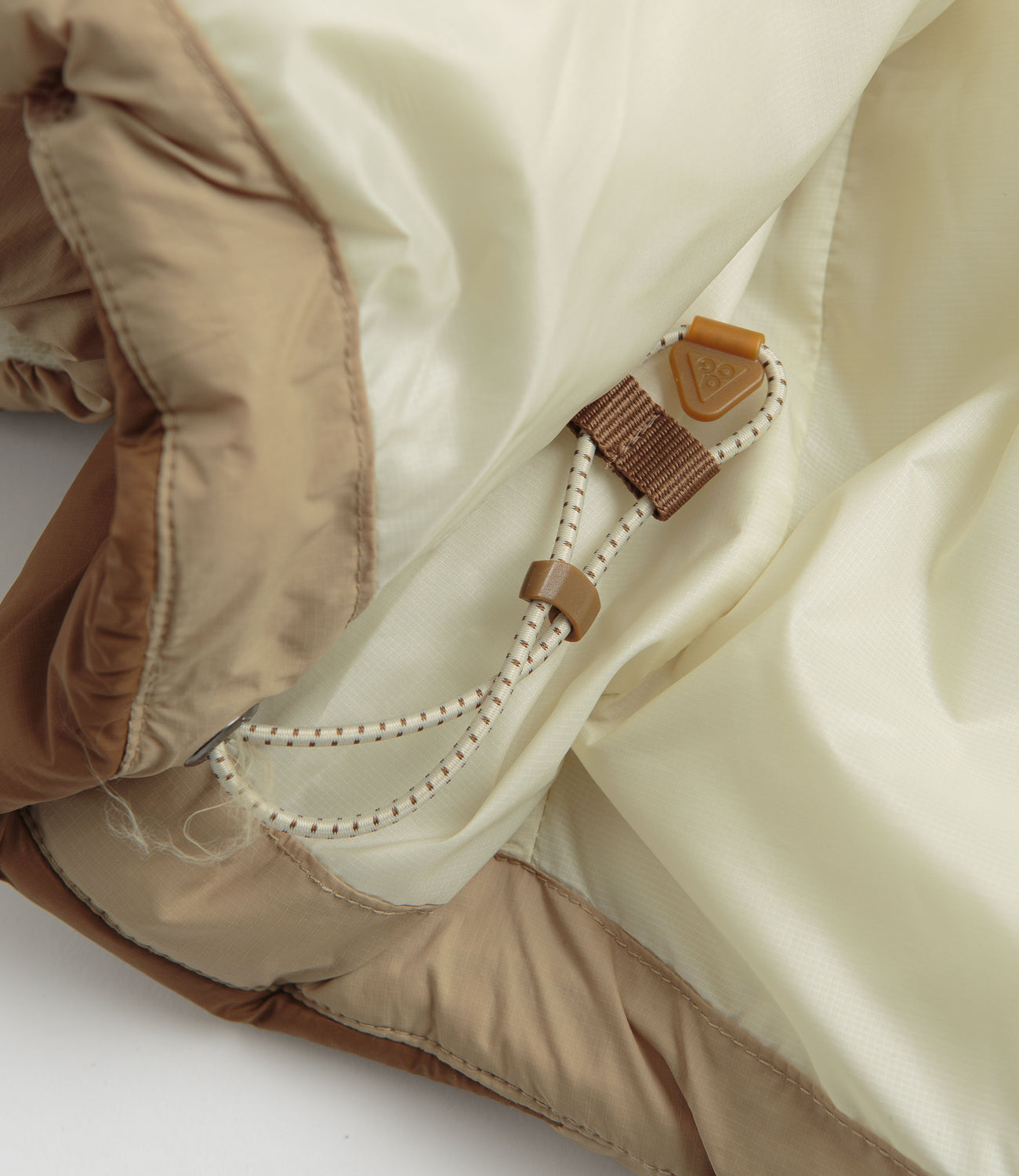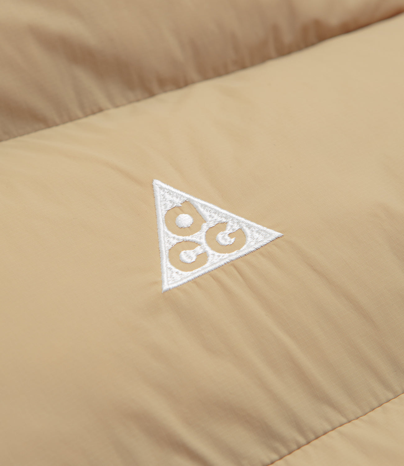 Nike ACG Lunar Lake Puffer Jacket in Parachute Beige and Summit White. Packable and designed with recycled PrimaLoft® insulation, this regular fitting Nike ACG jacket is made from 100% nylon with a water-repellent shell. Featuring a panelled hood, a full length zipper fastening, elasticated cuffs and two front pockets, this khaki beige Nike ACG jacket is finished with an adjustable hem, an ACG carabiner clip and embroidered branding.