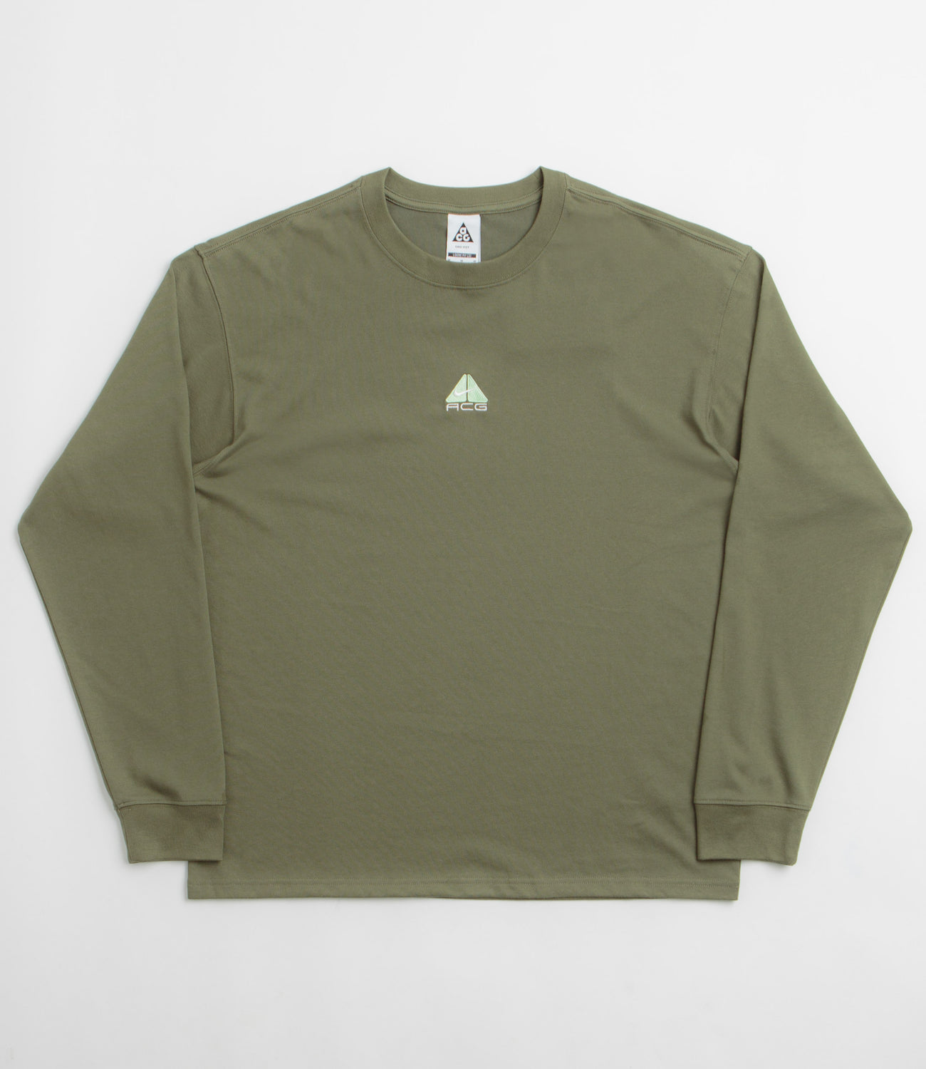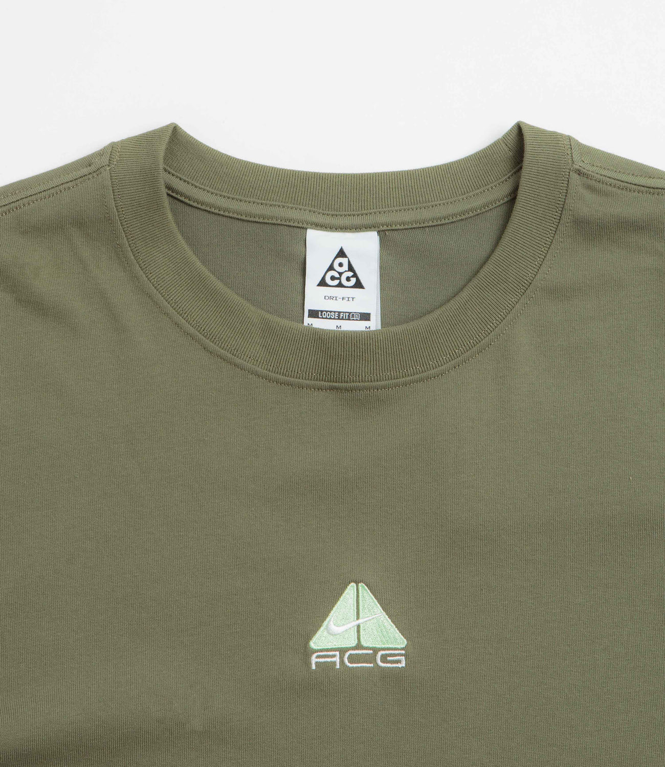 Nike ACG Lungs Long Sleeve T-Shirt in Medium Olive. Relaxed fitting with Dri-FIT technology, this relaxed fitting Nike ACG t-shirt is made from a polyester-cotton blend. Featuring a rib knit collar and ribbed cuffs, this olive green Nike ACG t-shirt is finished with embroidered logo branding.