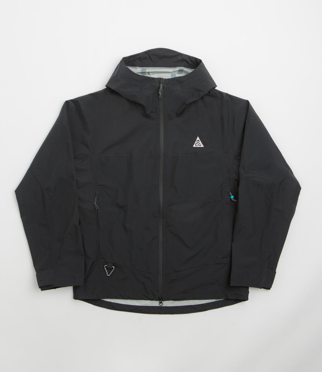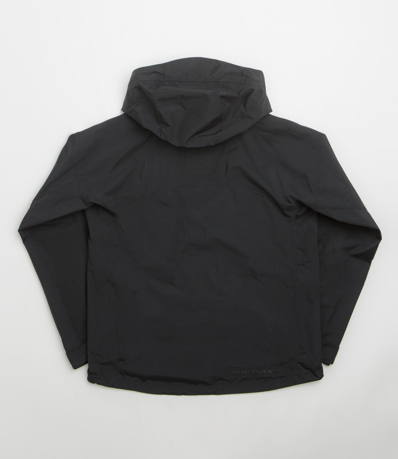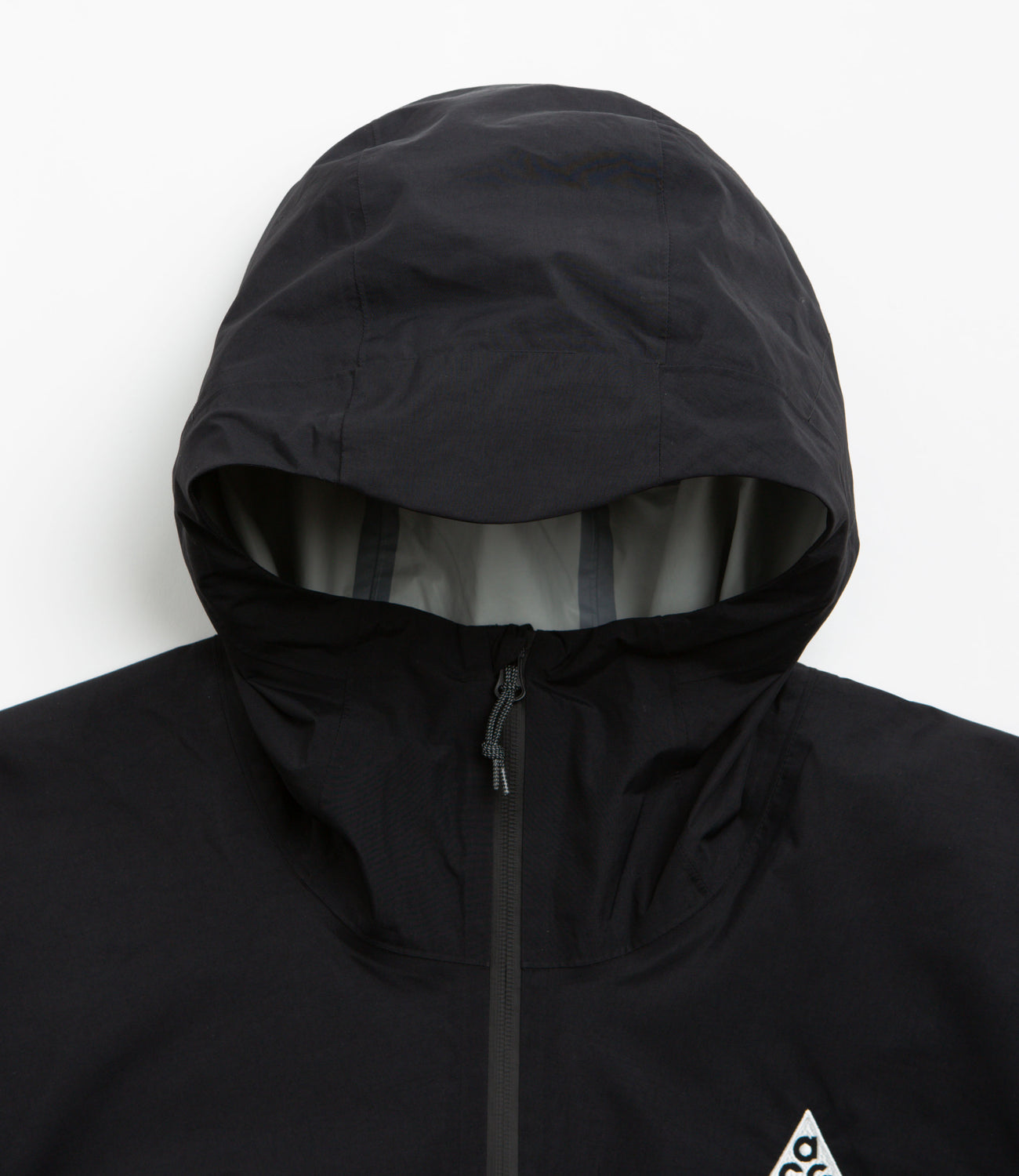 Nike ACG Morpho Rain Jacket in Black and Summit White. Made from 100% recycled nylon with Storm-FIT ADV technology, this Nike ACG jacket is designed with self-storing functionality. Featuring a bungee-cord adjustable hood, a full length zipper fastening and adjustable cuffs, this black Nike ACG jacket also features fully sealed seams. Finished with two front pockets, a single chest pocket, embroidered logos and an ACG carabiner clip.