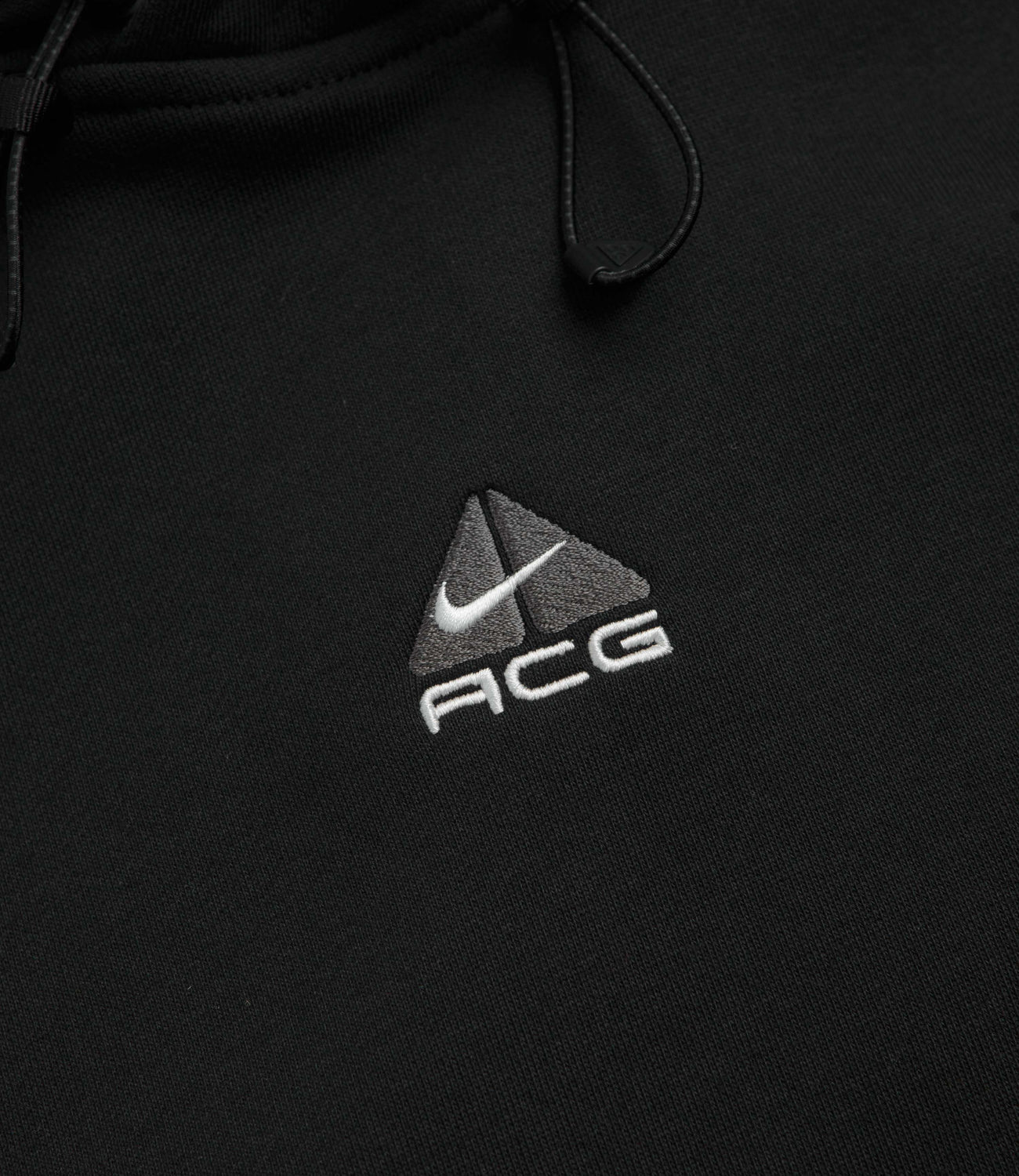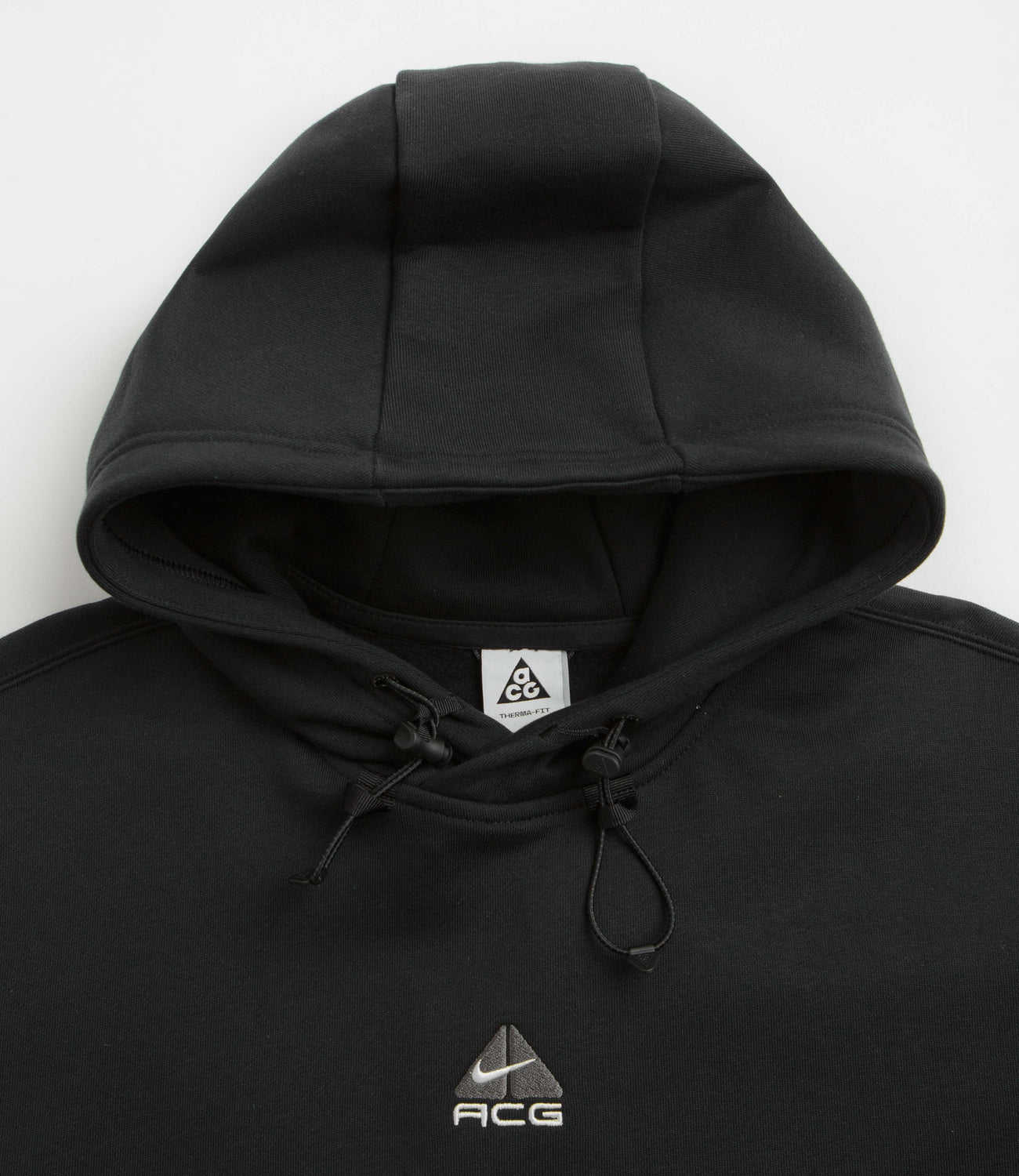 Nike ACG Therma-FIT Fleece Hoodie in Black, Anthracite and Summit White. Made from at latest 75% sustainable fabric, this Nike ACG hoodie is tailored to an oversized fitting with Therma-FIT technology. French terry lined with a bungee-cord hood, dropped shoulders, ribbed cuffs and a woven elastic hem, this black Nike ACG sweater is finished with a kangaroo front pocket and with an embroidered ACG centre chest logo.