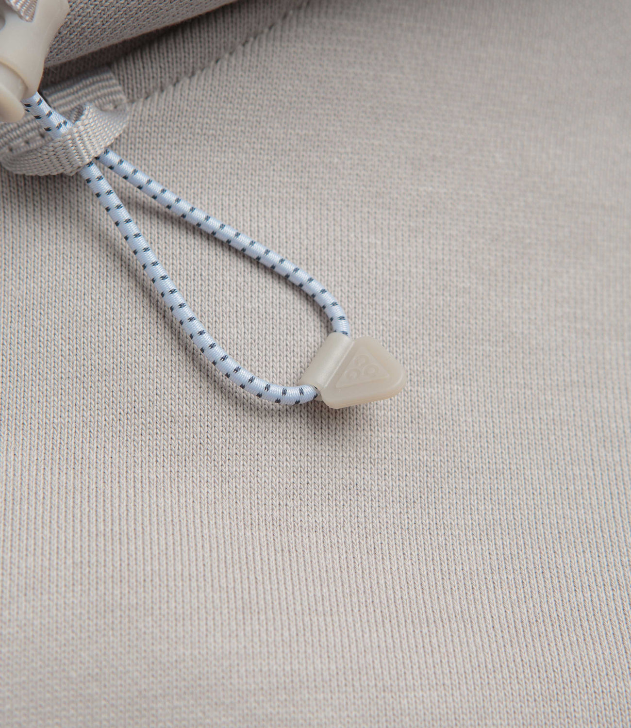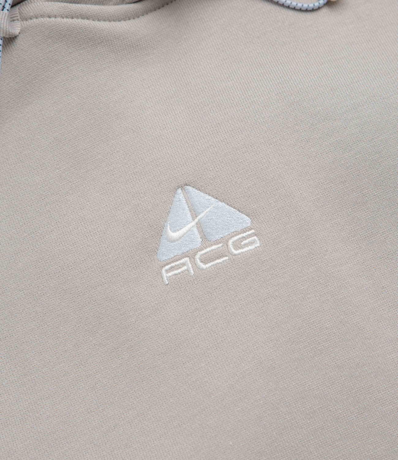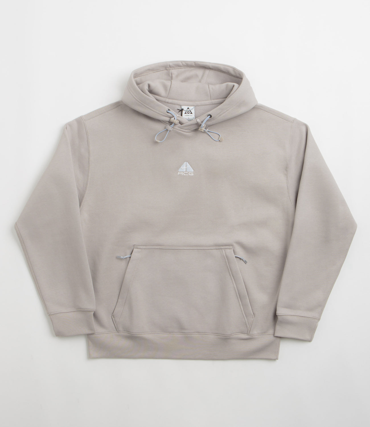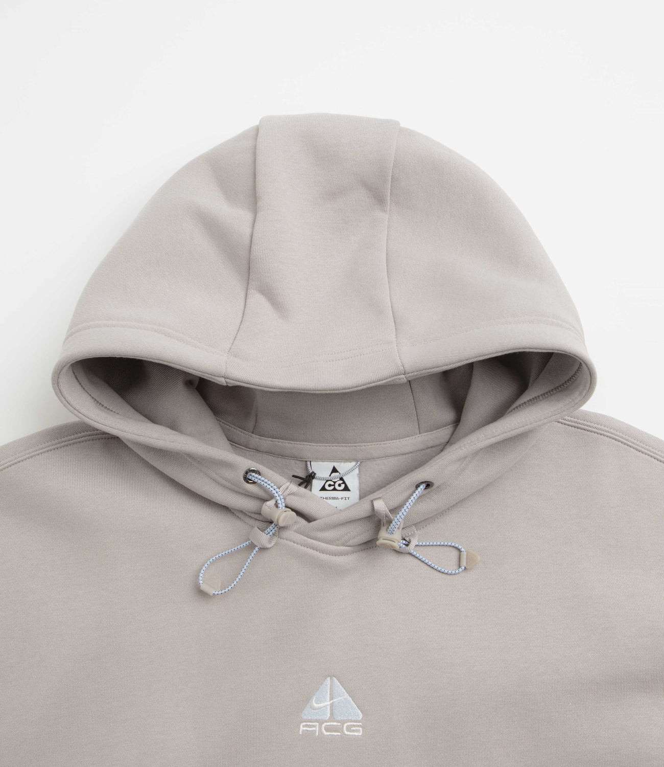 Nike ACG Therma-FIT Fleece Hoodie in College Grey, Football Grey and Summit White. Oversized and made from at least 75% sustainable fabric, this Nike ACG hoodie is designed with Therma-FIT technology. Featuring a bungee-cord adjustable hood, ribbed cuffs and zippered front pockets, this grey Nike ACG hoodie is finished with embroidered logo branding.