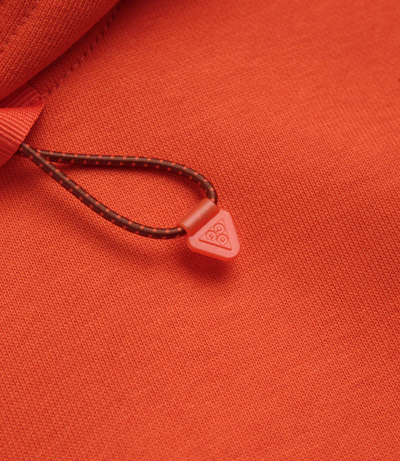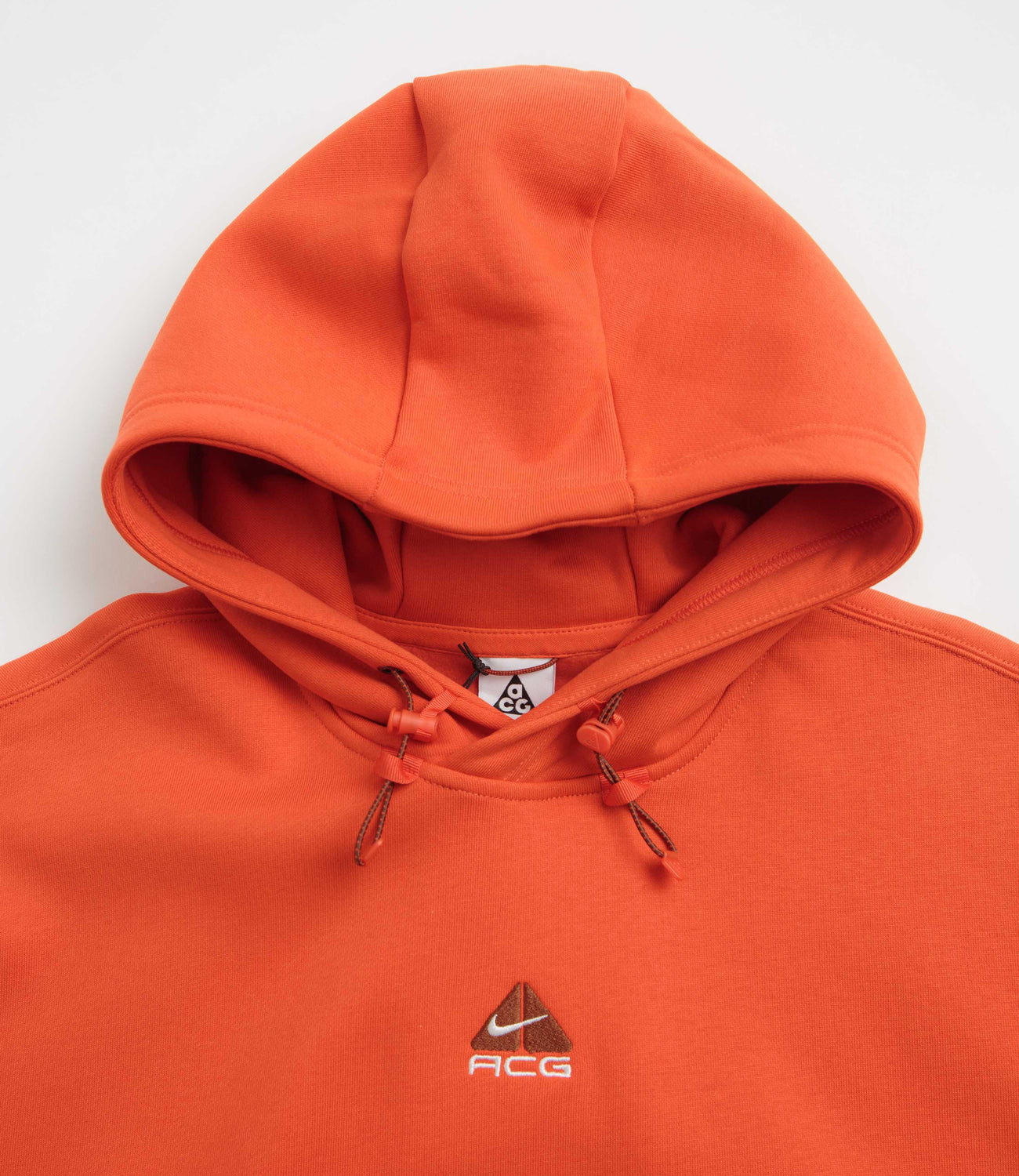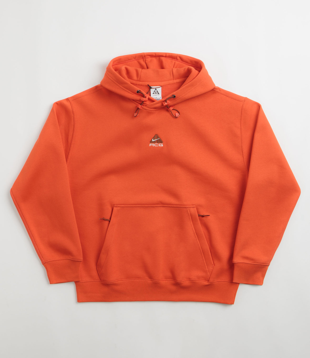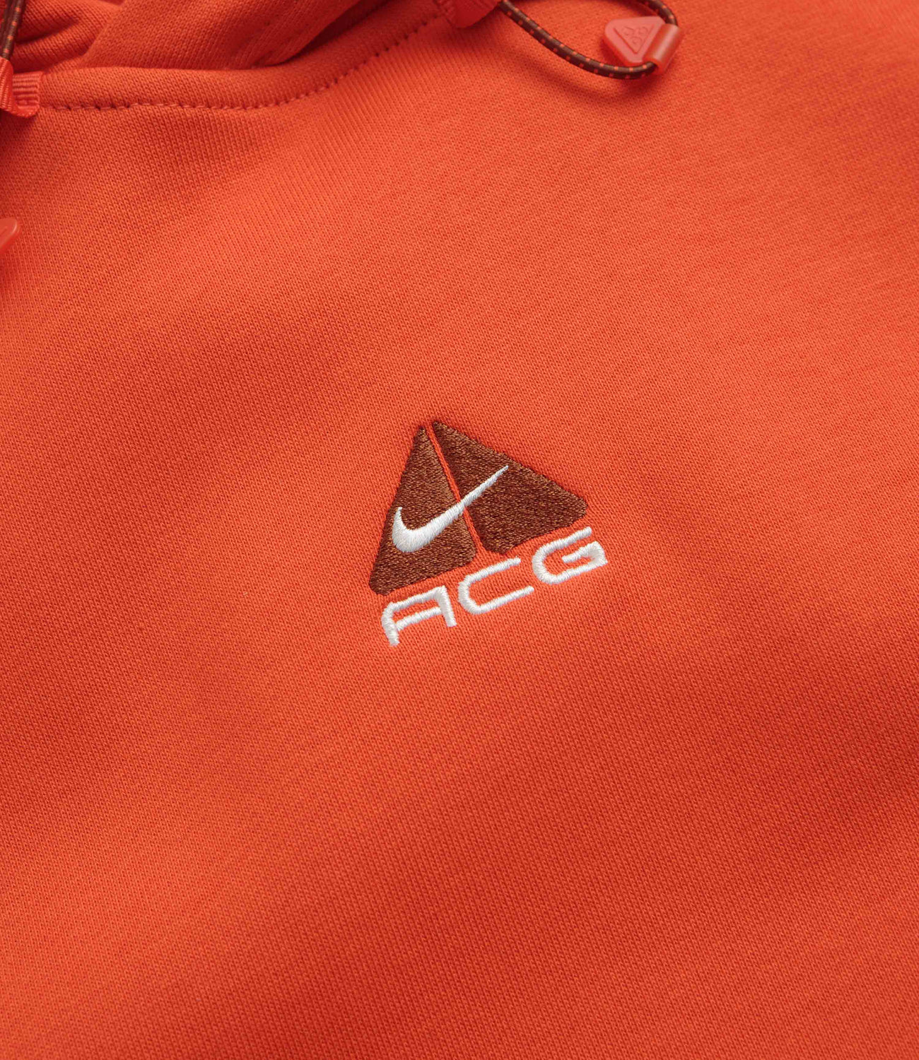 Nike ACG Therma-FIT Fleece Hoodie in Picante Red, Cinnamon and Summit White. Made from at least 75% sustainable fabric with a French terry lining, this oversized Nike ACG hoodie is designed with Therma-FIT technology. Finished in red with a bungee-cord hood, dropped shoulders, ribbed cuffs, a zippered kangaroo front pocket and embroidered logo branding.