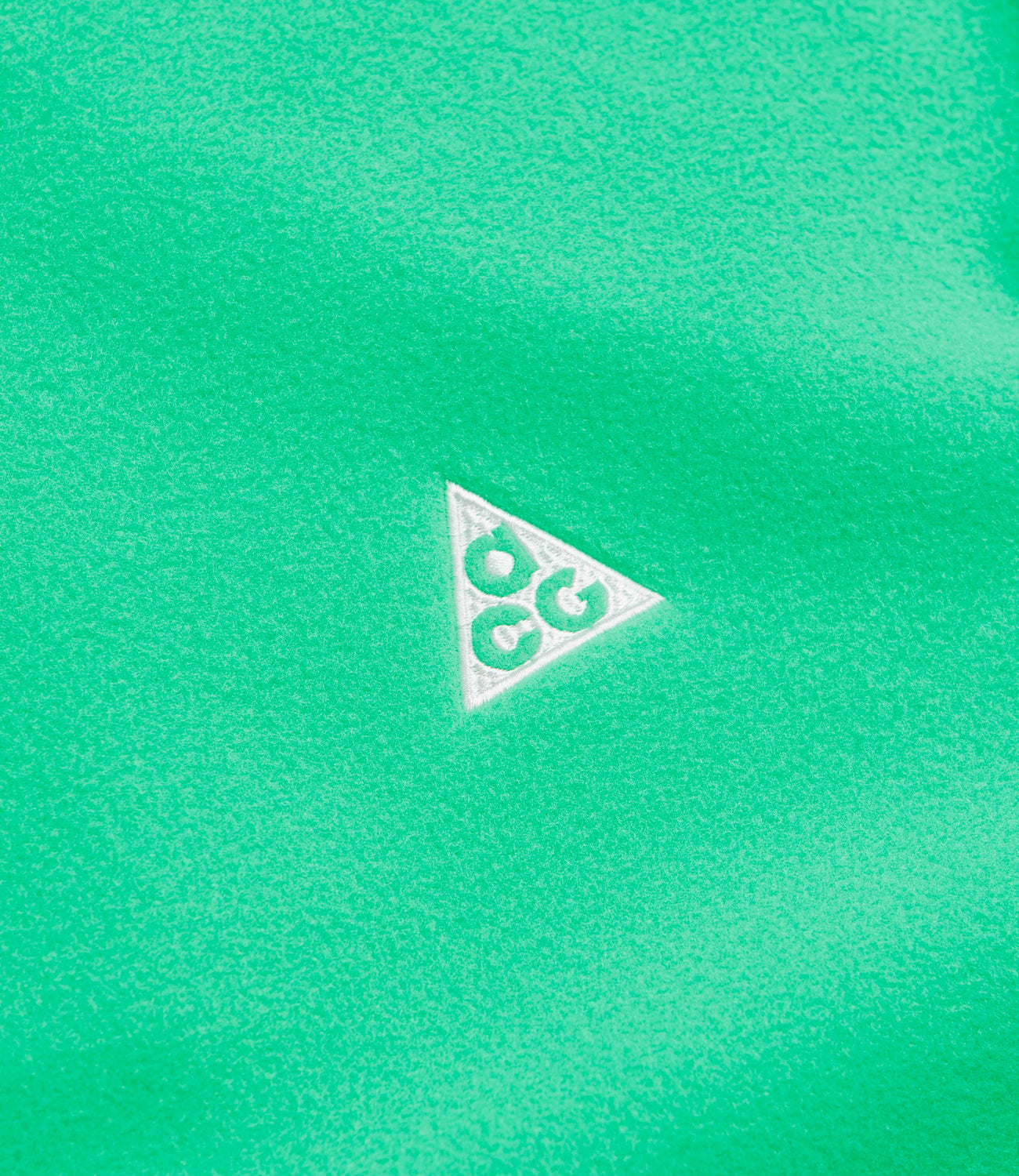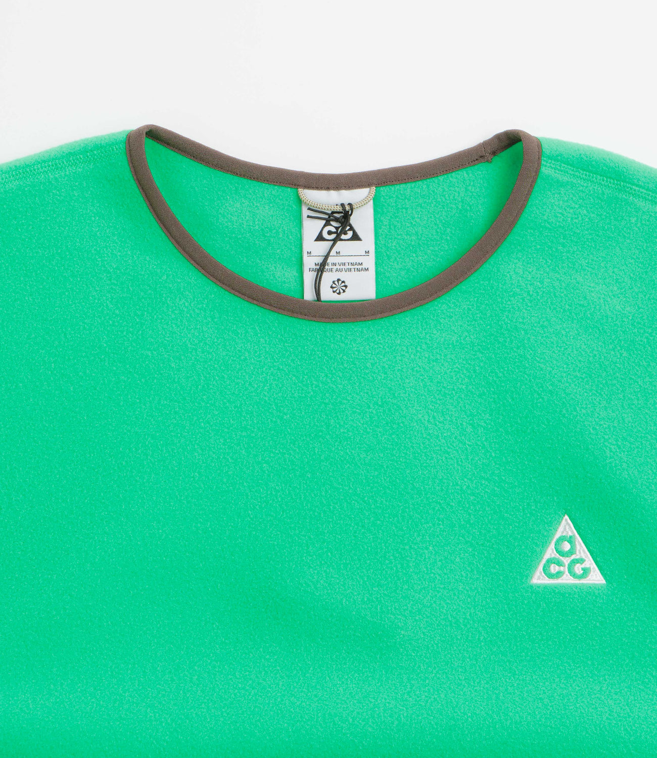 Nike ACG Wolf Tree Crewneck Sweatshirt in Green Shock, Mosswood Brown and Summit White. Designed with panelled details, this regular fitting Nike ACG sweatshirt is made from 100% polyester fleece. Featuring Therma-FIT technology, a rib knit collar and a bungee-cord hem, this green Nike ACG sweater is finished with elasticated cuffs and embroidered branding.