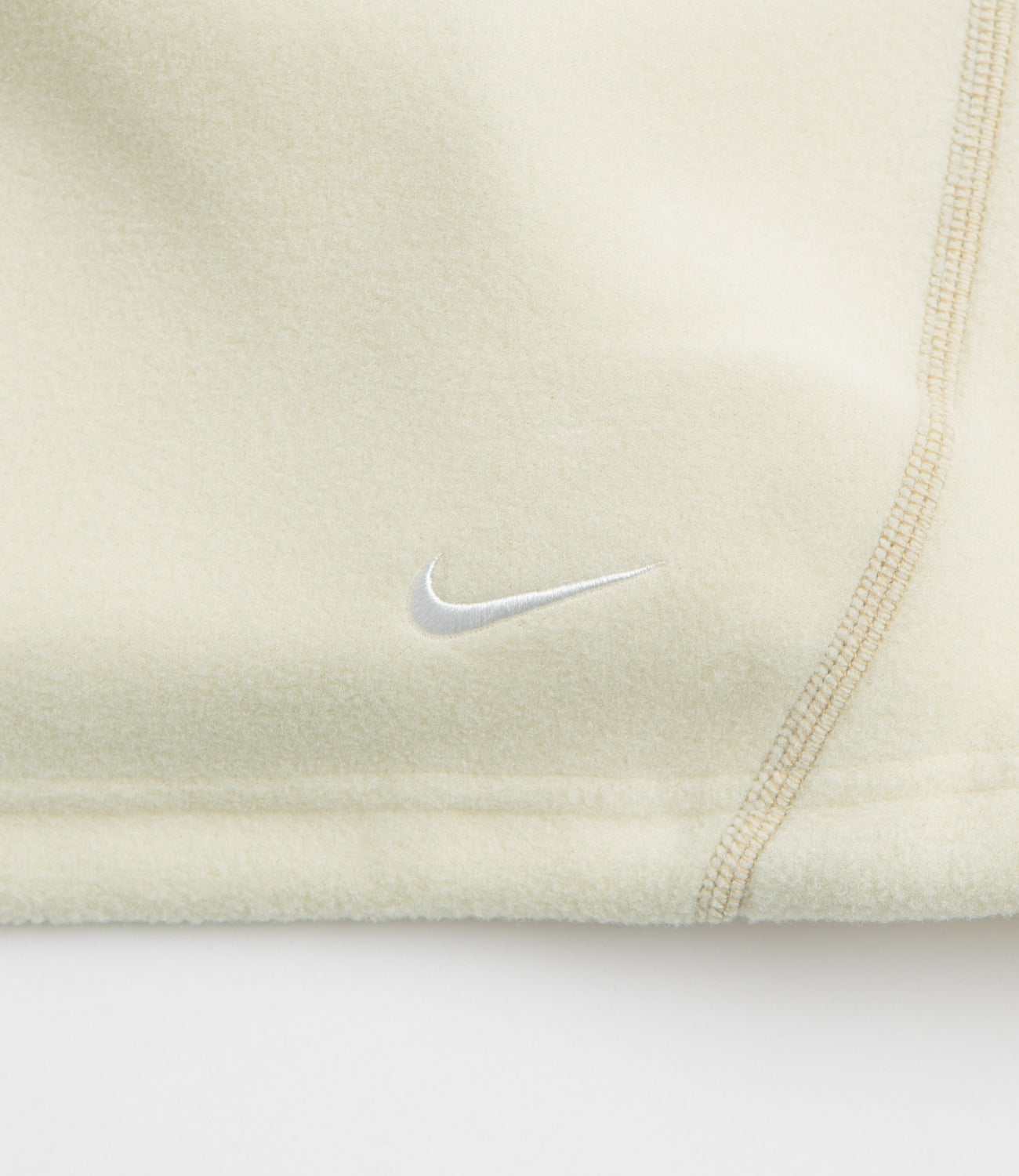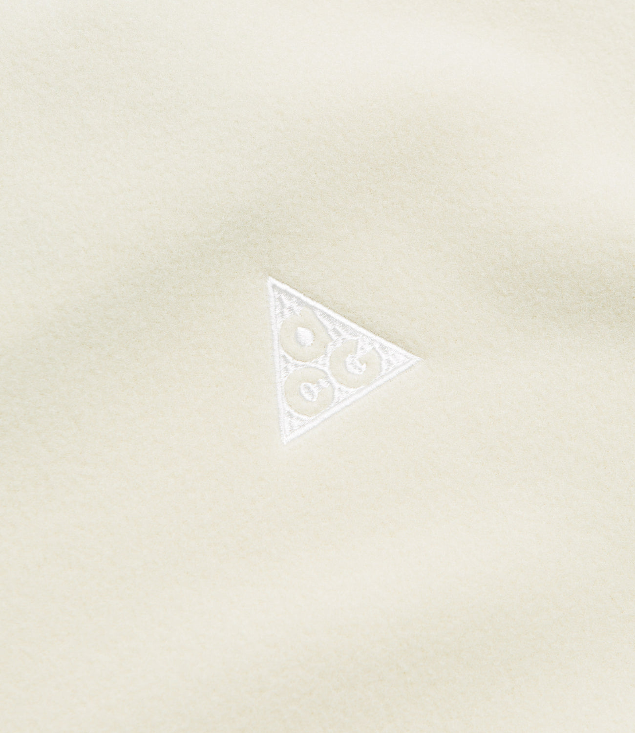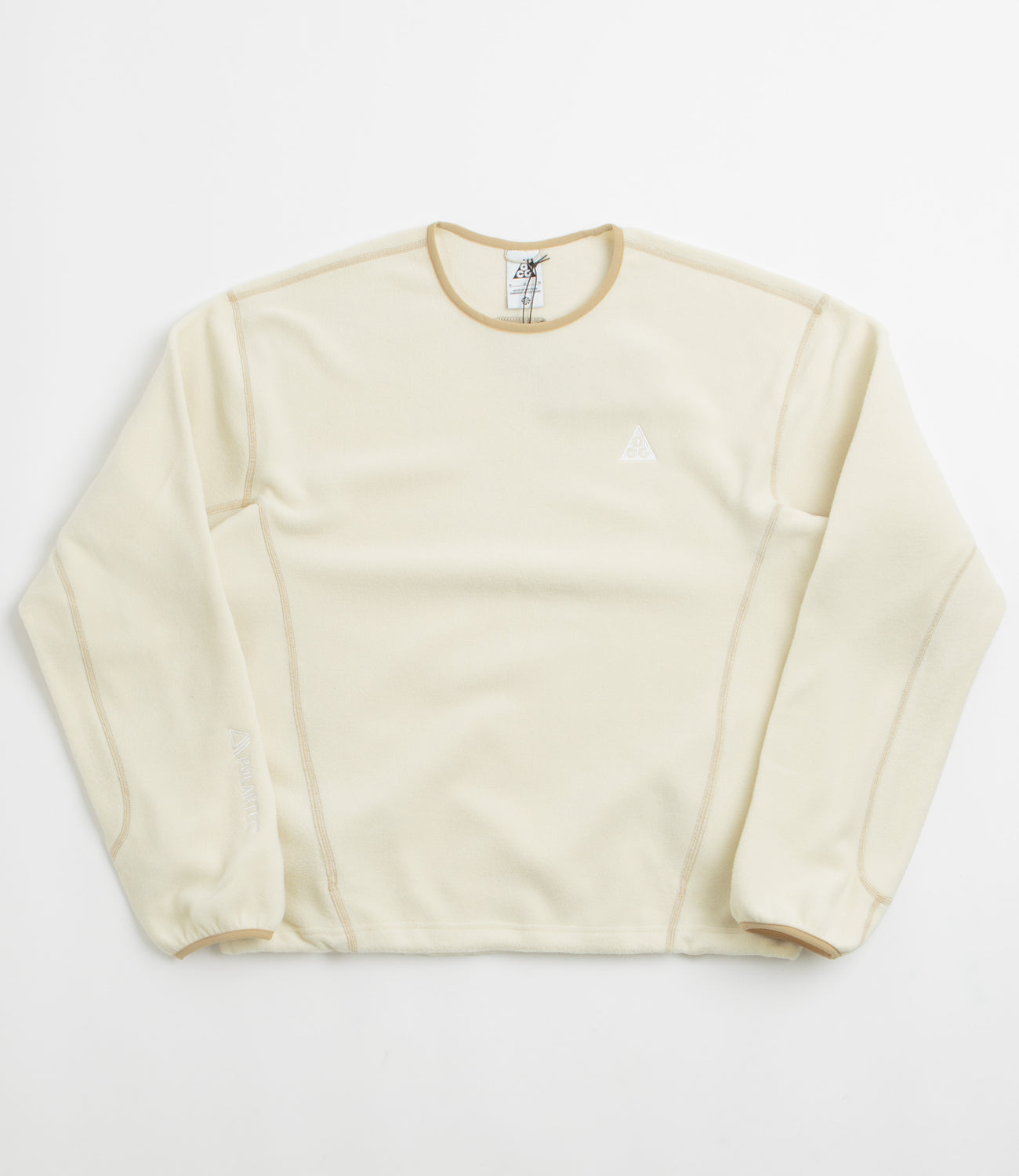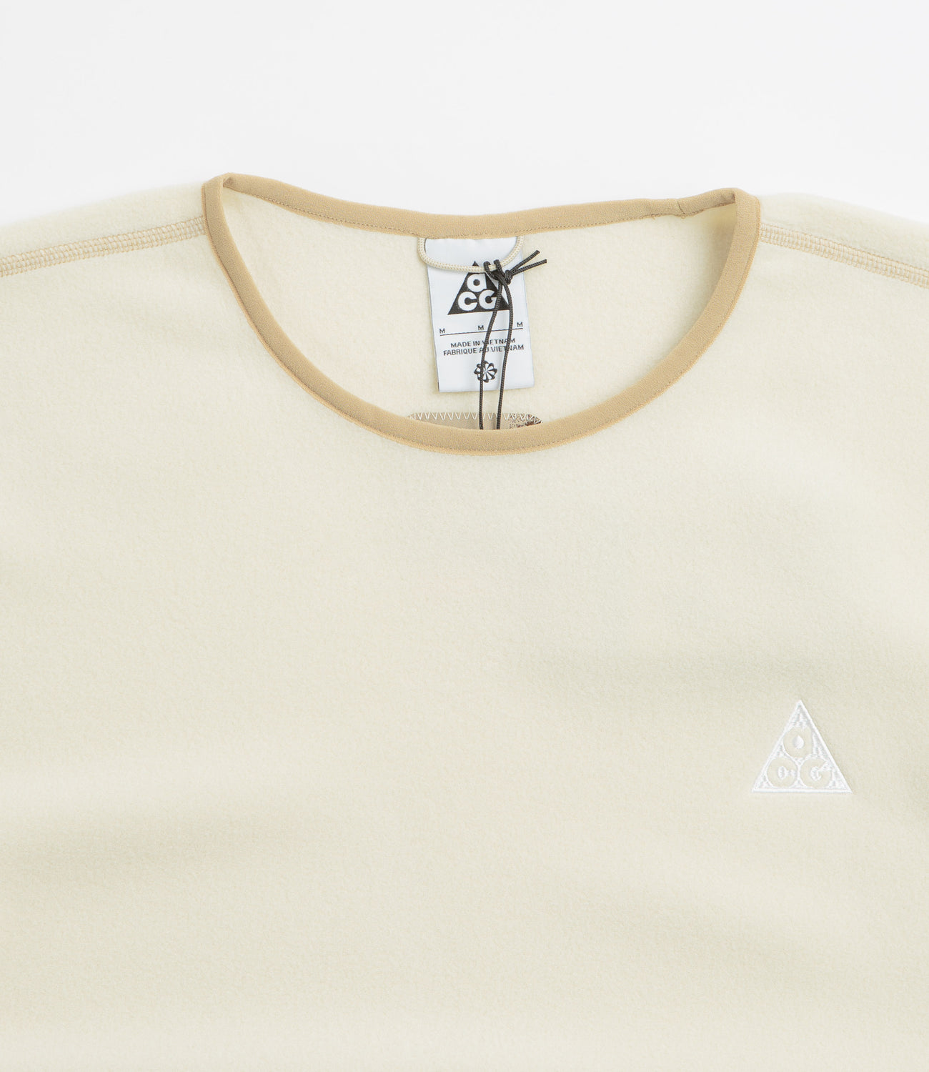 Nike ACG Wolf Tree Crewneck Sweatshirt in Light Khaki, Parachute Beige and Summit White. Made from 100% polyester fleece, this regular fitting Nike ACG sweatshirt is designed with Therma-FIT technology. Featuring a rib knit collar, dropped shoulders, elasticated cuffs and a toggle-cord hem, this beige Nike ACG sweater is finished with embroidered branding.