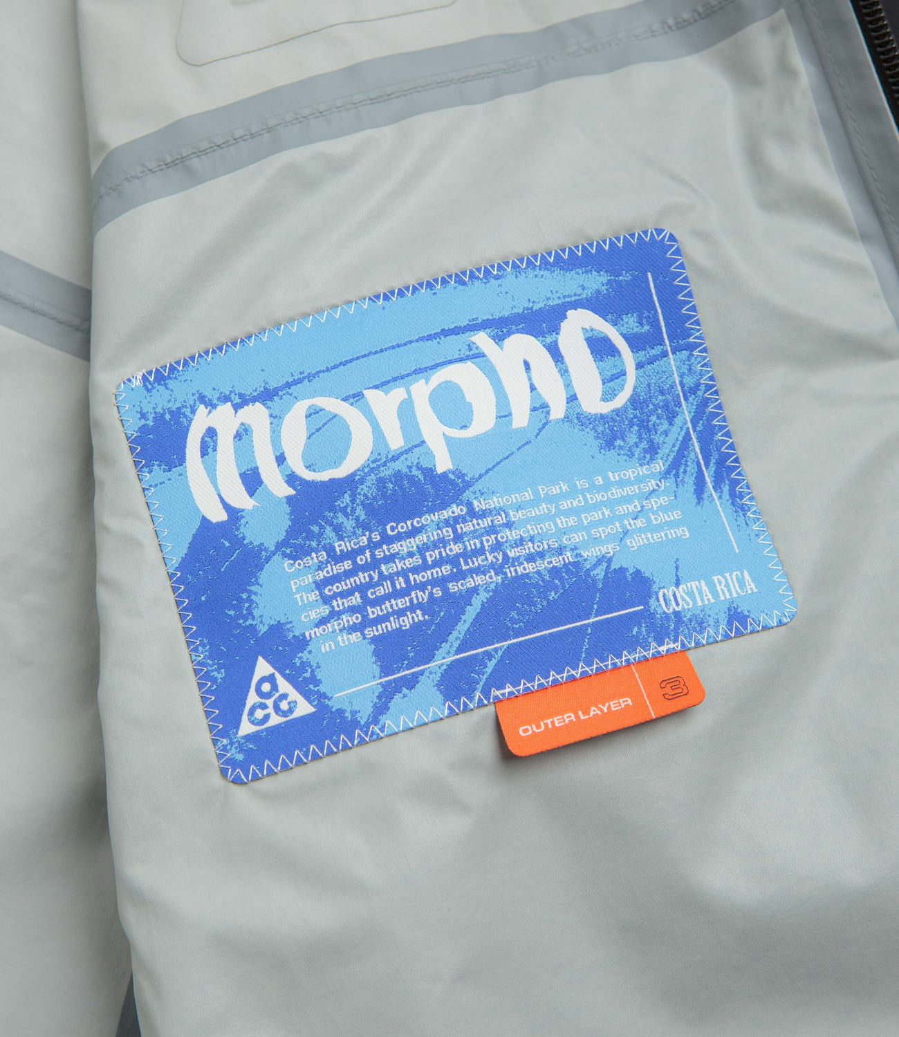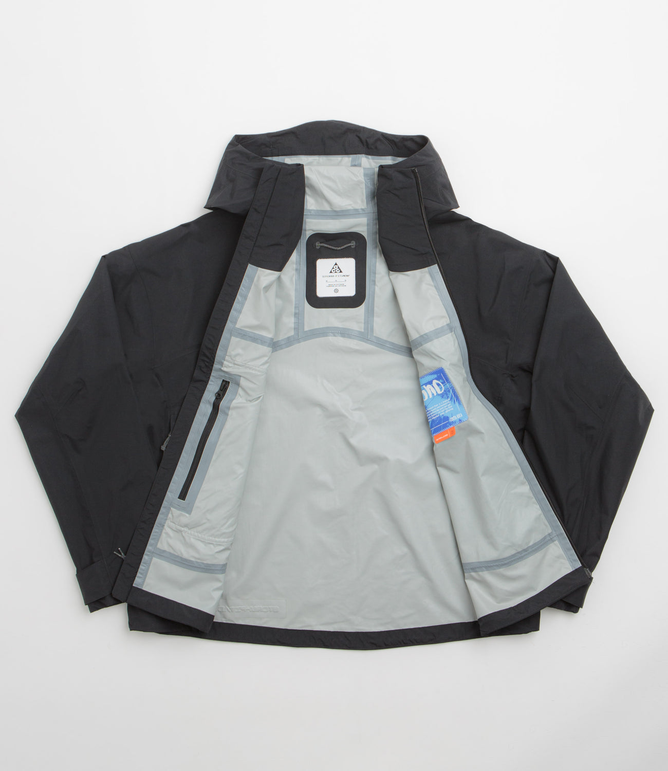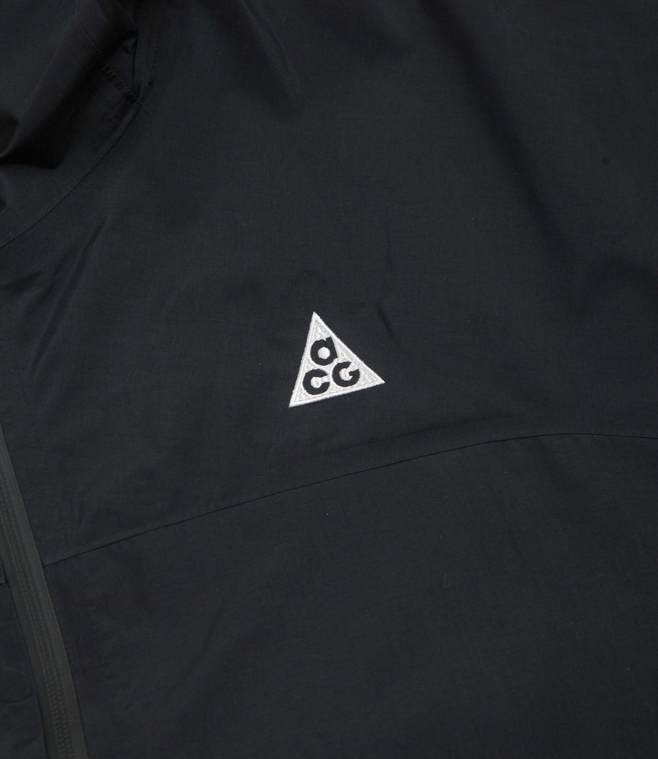 Nike ACG Womens Morpho Rain Jacket in Black and Summit White. Made from 100% recycled nylon, this packable Nike ACG jacket is designed with Storm-FIT ADV technology. Featuring a bungee-cord adjustable hood, fully sealed seams and a two-way zipper fastening, this black Nike ACG jacket is finished with zippered pockets, embroidered logos and an ACG carabiner clip.