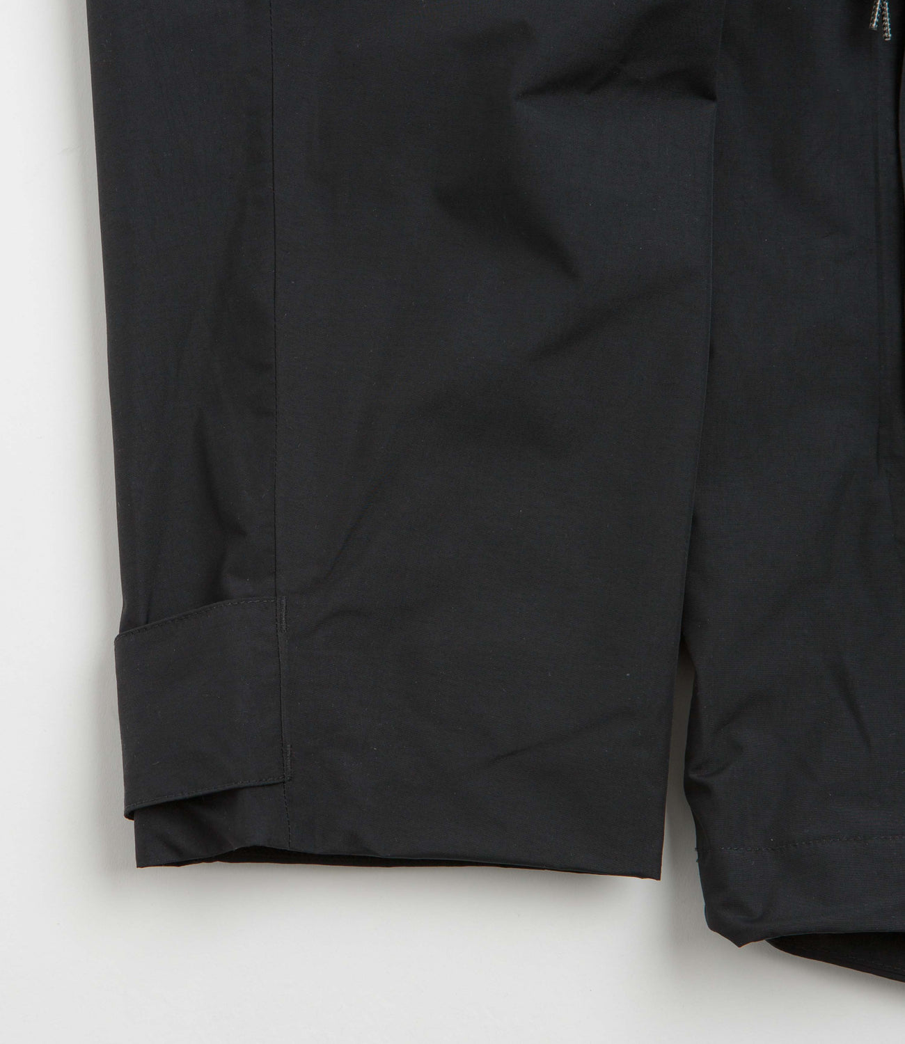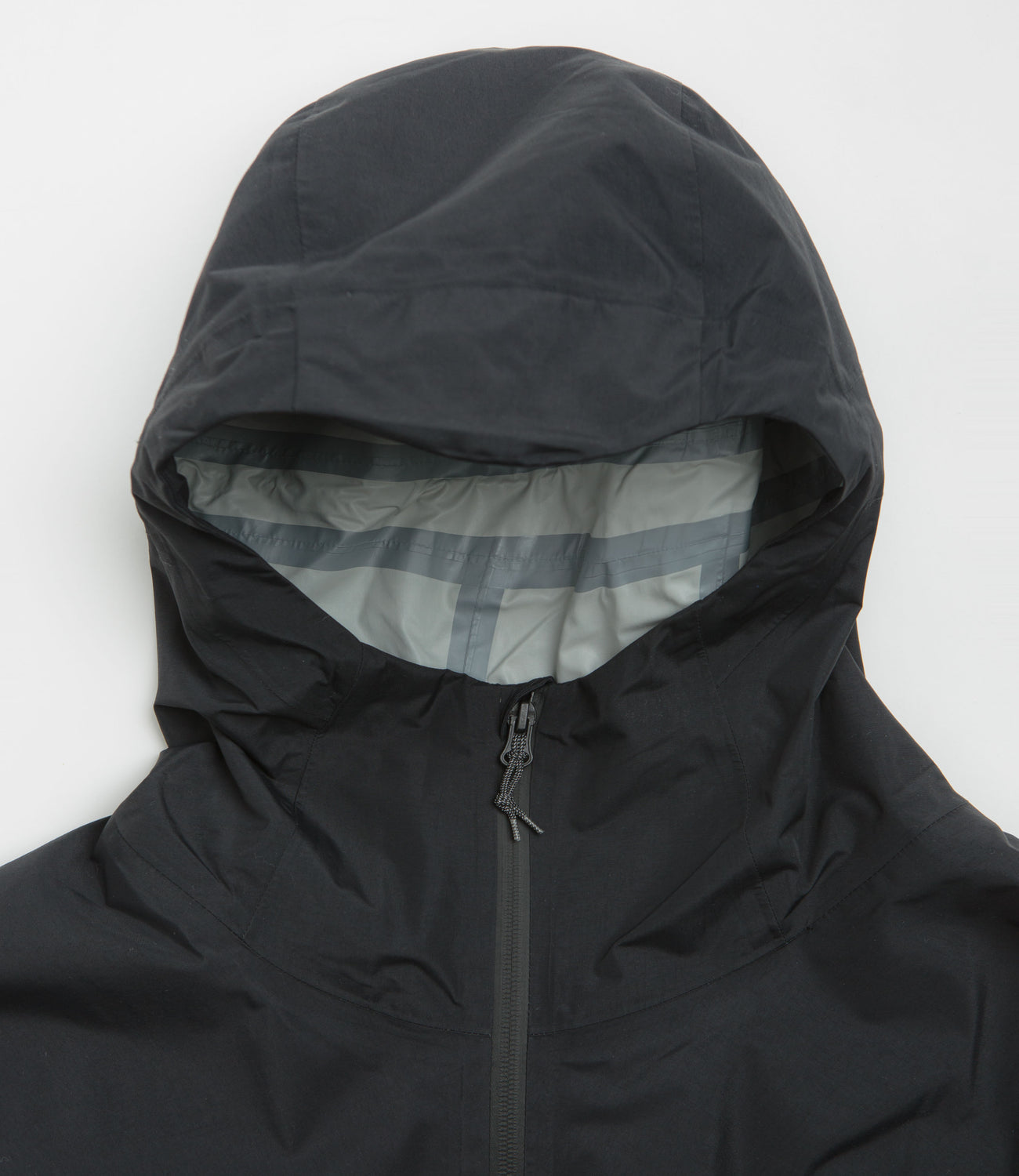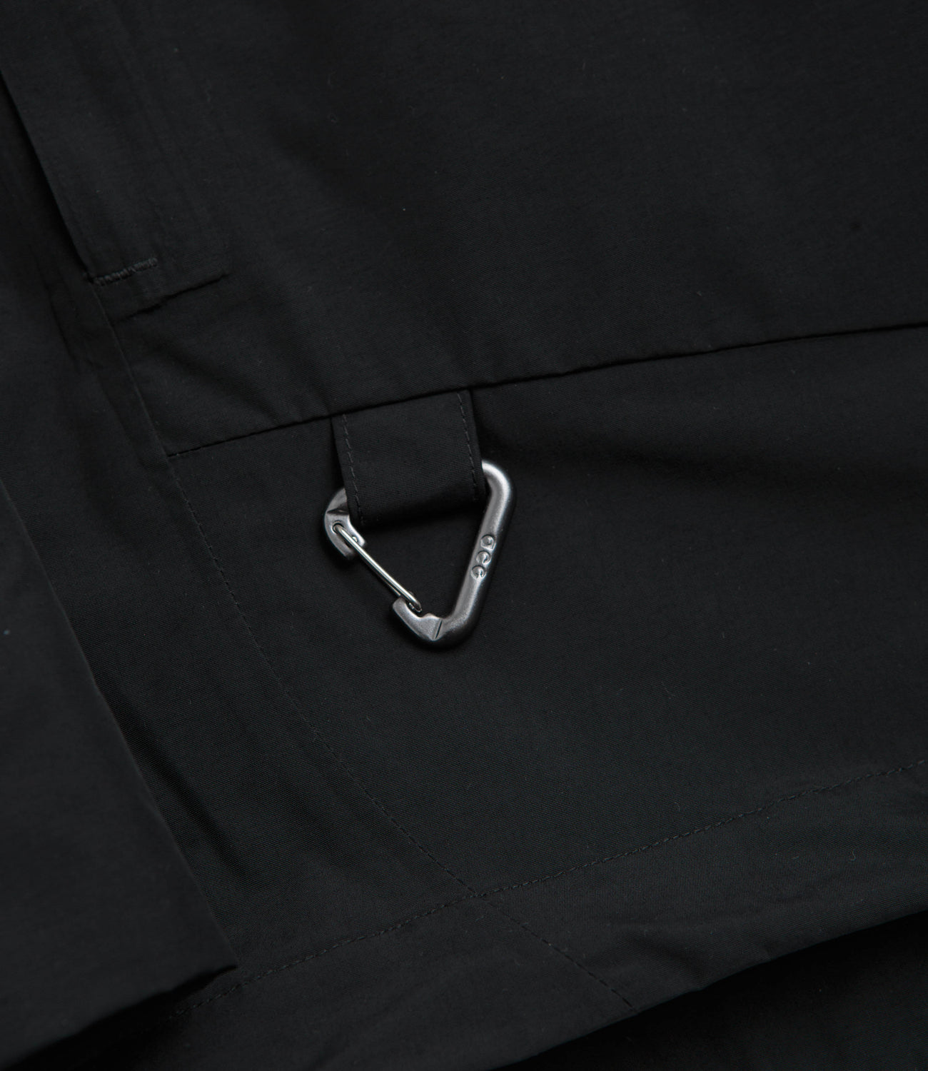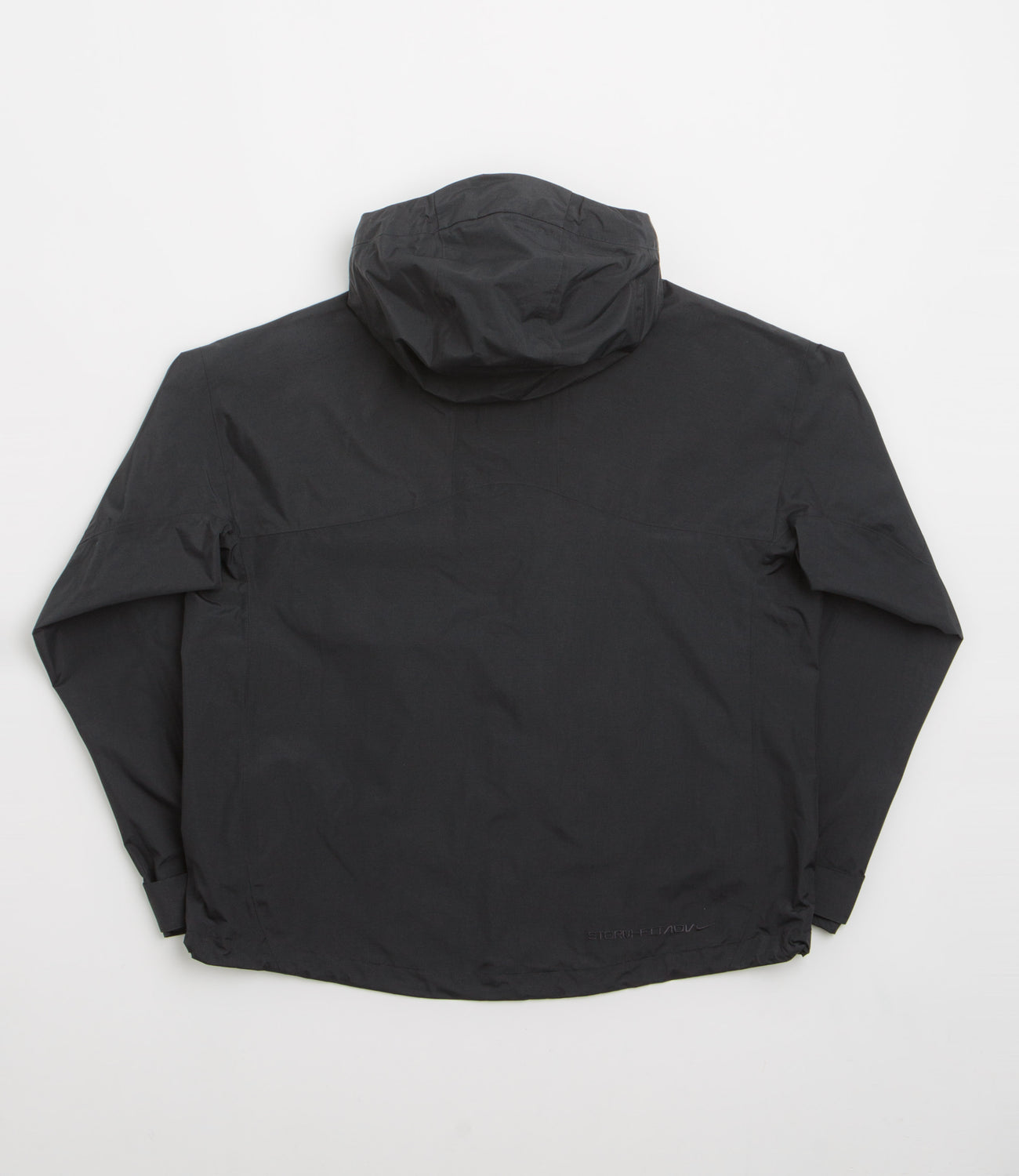 Nike ACG Womens Morpho Rain Jacket in Black and Summit White. Made from 100% recycled nylon, this packable Nike ACG jacket is designed with Storm-FIT ADV technology. Featuring a bungee-cord adjustable hood, fully sealed seams and a two-way zipper fastening, this black Nike ACG jacket is finished with zippered pockets, embroidered logos and an ACG carabiner clip.