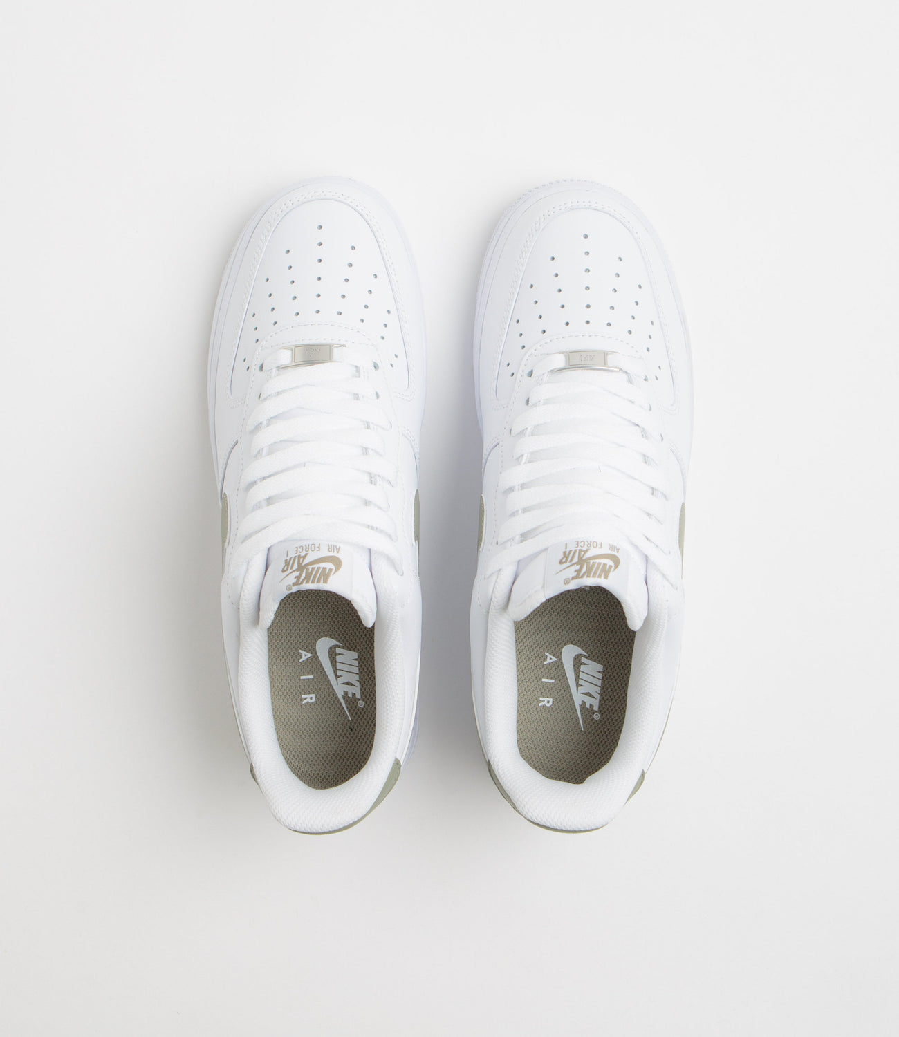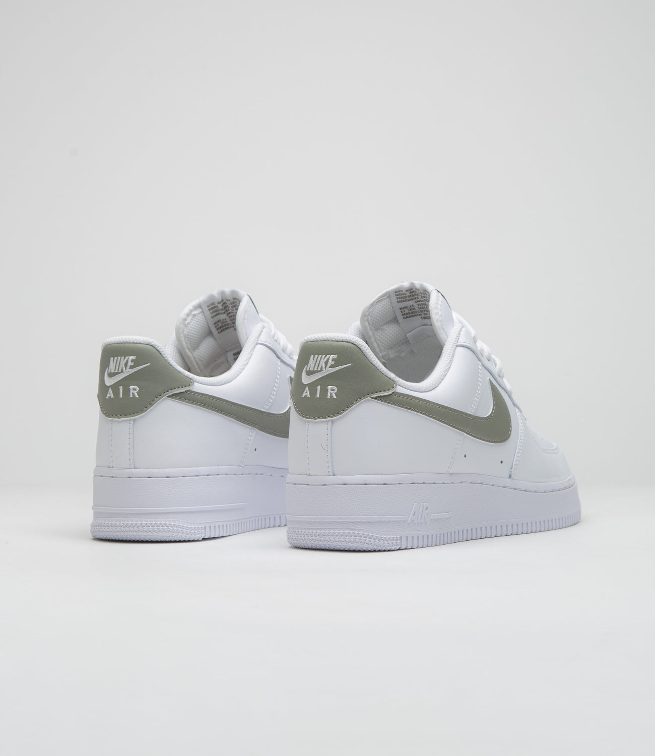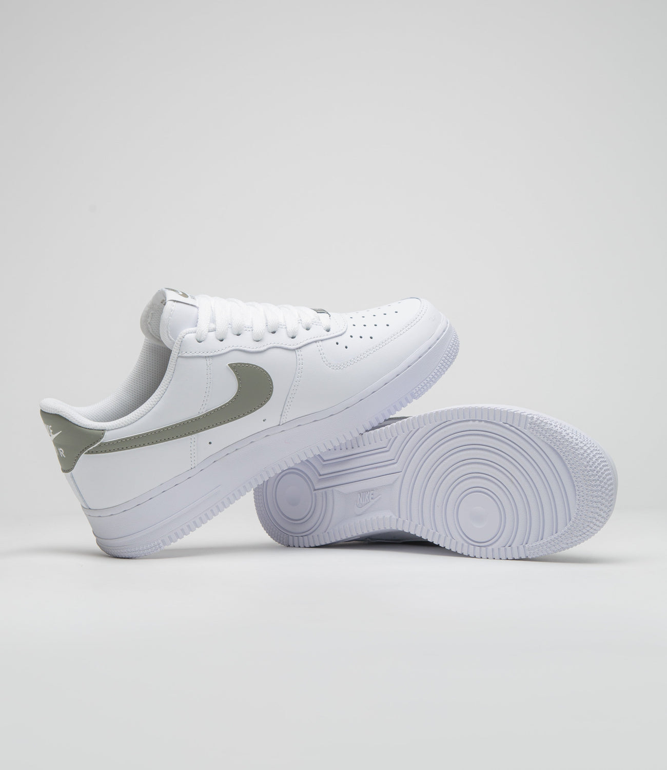 Nike Air Force 1 '07 Shoes in White and Light Army. Archive influenced, this Nike Air Force 1 ’07 is designed with a softening leather upper and a perforated toe box. Featuring Nike Air cushioning, a foam midsole, contrasting leather Swooshes and embossed heel detailing, this white Nike Air Force 1 ‘07 is finished with woven tongue labels, printed insoles and a rubber outsole.