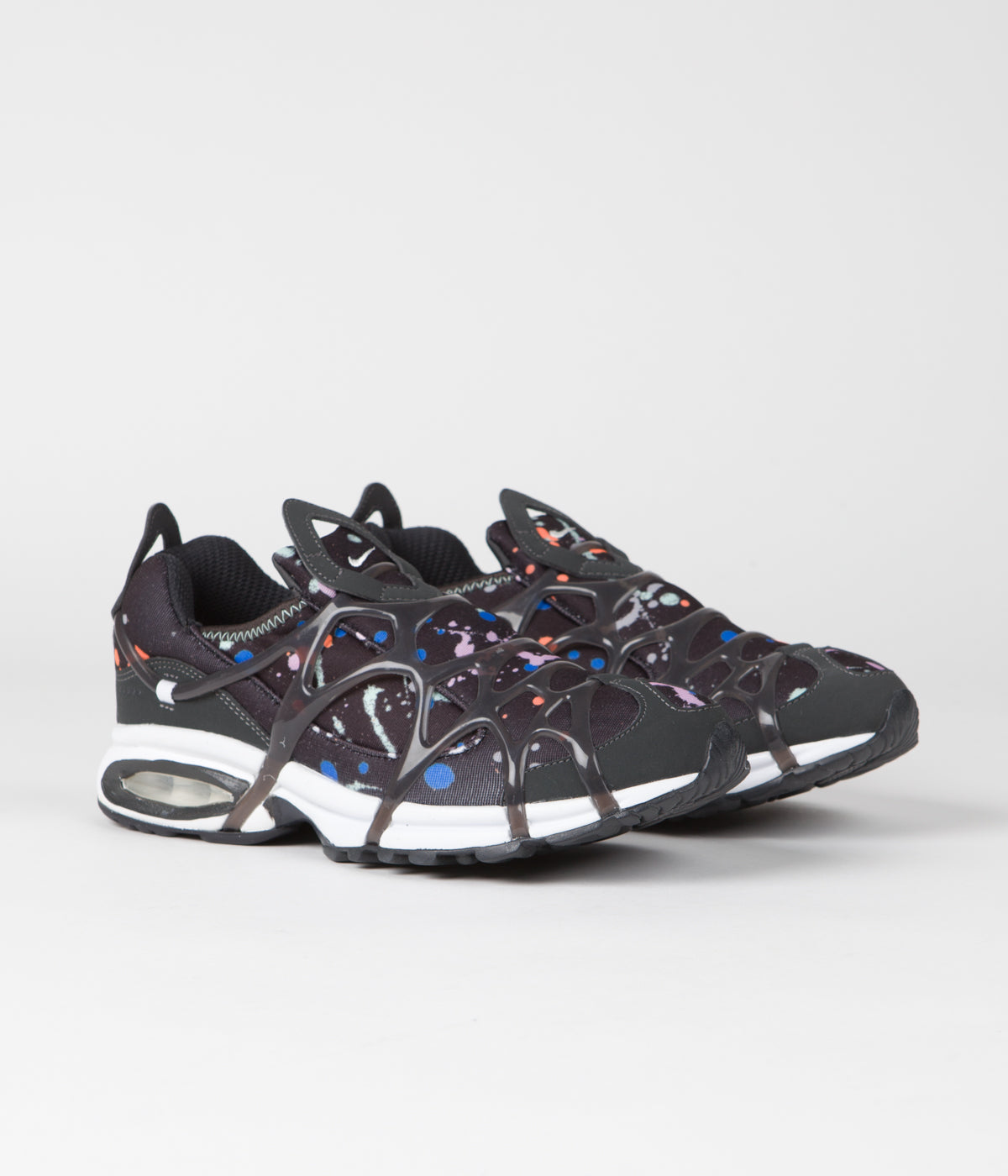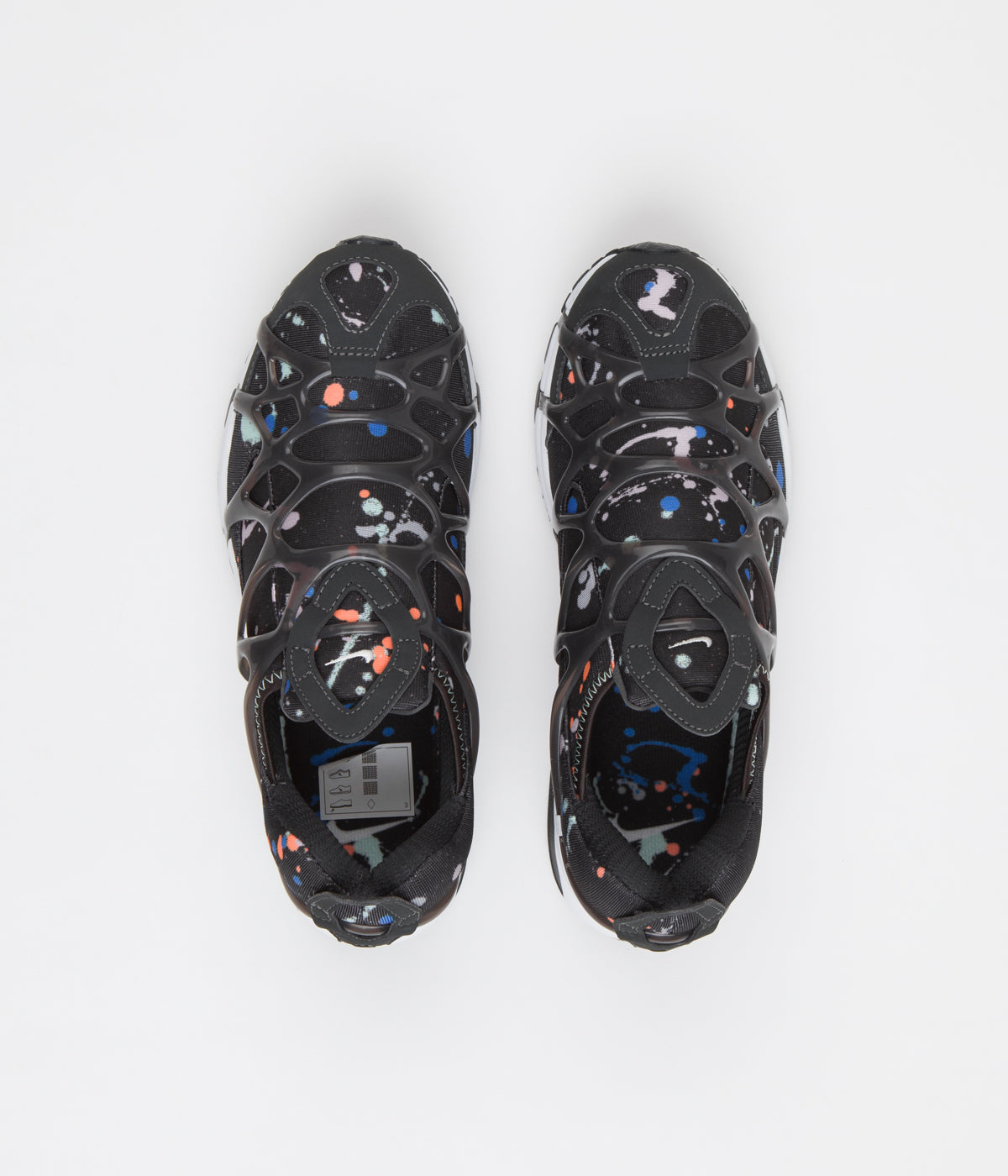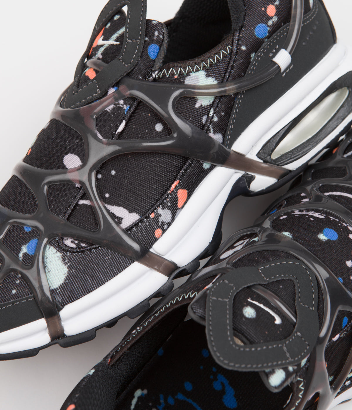 Nike Air Kukini SE Shoes in Black, Anthracite, White and Phantom. Styled with a paint splatter print inspired by the Air Presto, the Nike Air Kukini SE is a performance orientated silhouette influenced by vintage trail runners. Featuring paint splattered neoprene-like uppers with an exposed and overlaid webbed support system, this low collared sneaker also features a supportive midfoot cage, integrated Nike Air cushioning and a multi-tread rubber outsole for increased grip. The laceless forefoot features a sculpted tongue with mirrored diamond pull tabs across the heel, whilst printed paint splatter insoles finish the design.