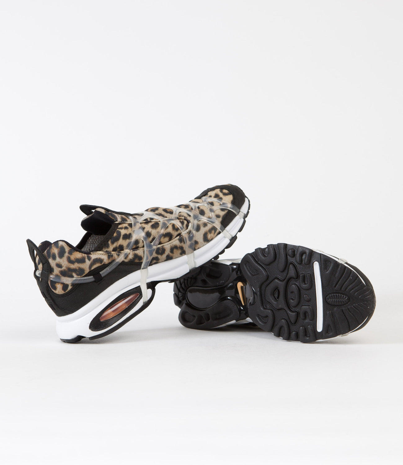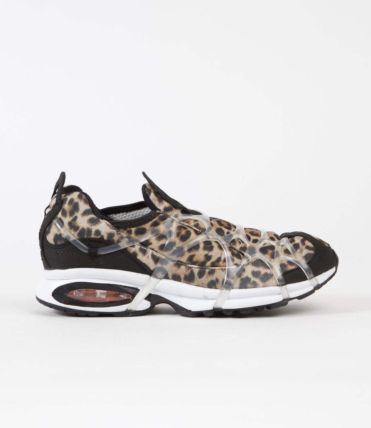 Nike Air Kukini Shoes in Black, Kumquat, Multi and White. Inspired by archive classics with a slip-on, slip-off construction, the Nike Air Kukini is a performance orientated silhouette heavily influenced by vintage trail running designs. Featuring an all-over sublimated leopard print design with neoprene-like fabric uppers and design matched mesh underlays, this low collared sneaker also features an exposed and overlaid webbed support system for a fast-paced look. Nike Air cushioning across the heel delivers exemplary cushioned support and impact absorption, whilst a grippy rubber outsole honours the design’s original track and trail lineage. Lightweight, airy and quick drying, this performative silhouette features black fabric overlays that complement the plastic midfoot caging, whilst mirrored tongue and heel pull tabs provide quick and easy slip-on styling to suit.