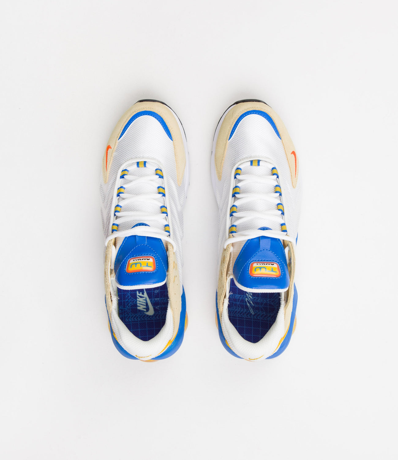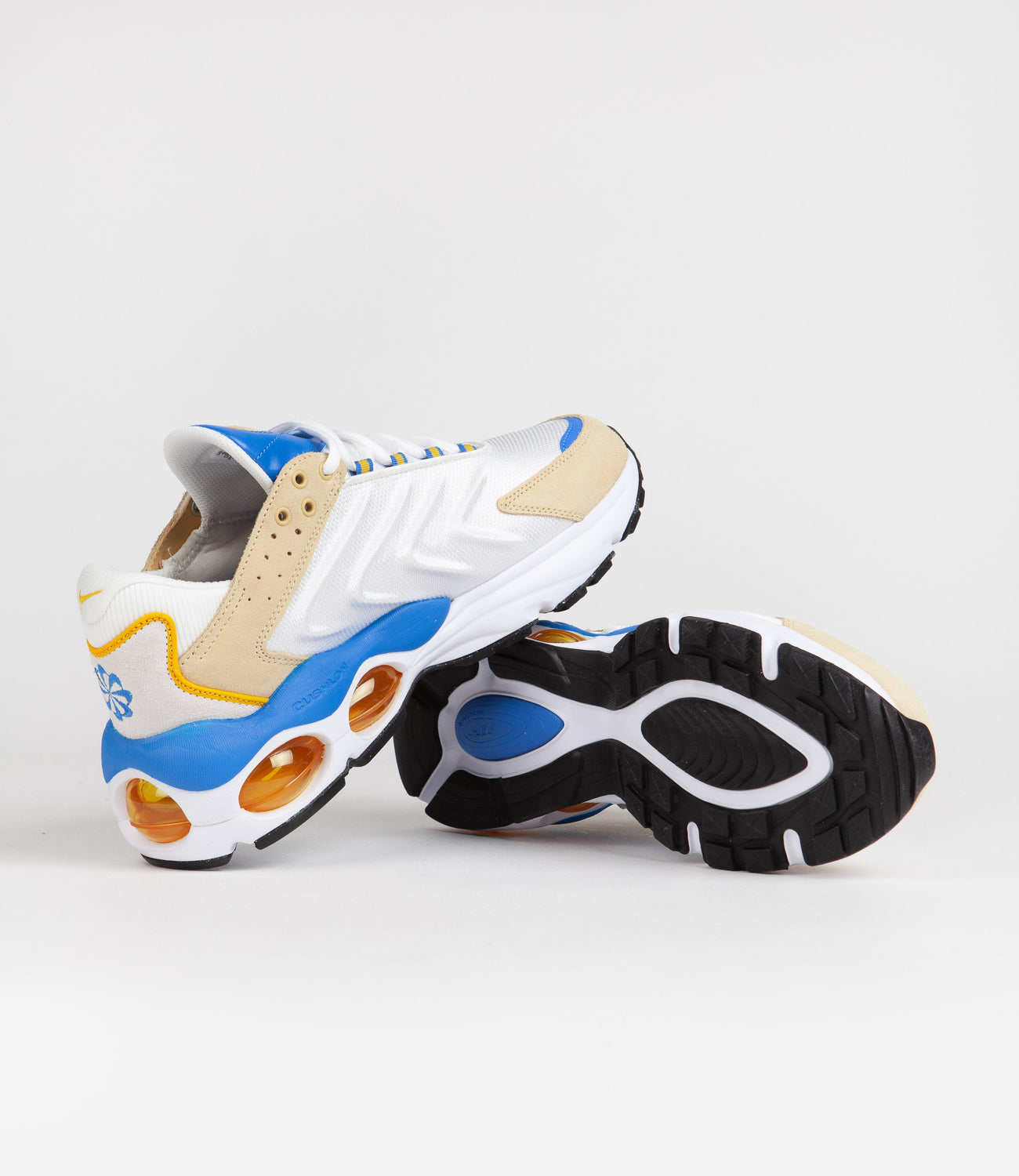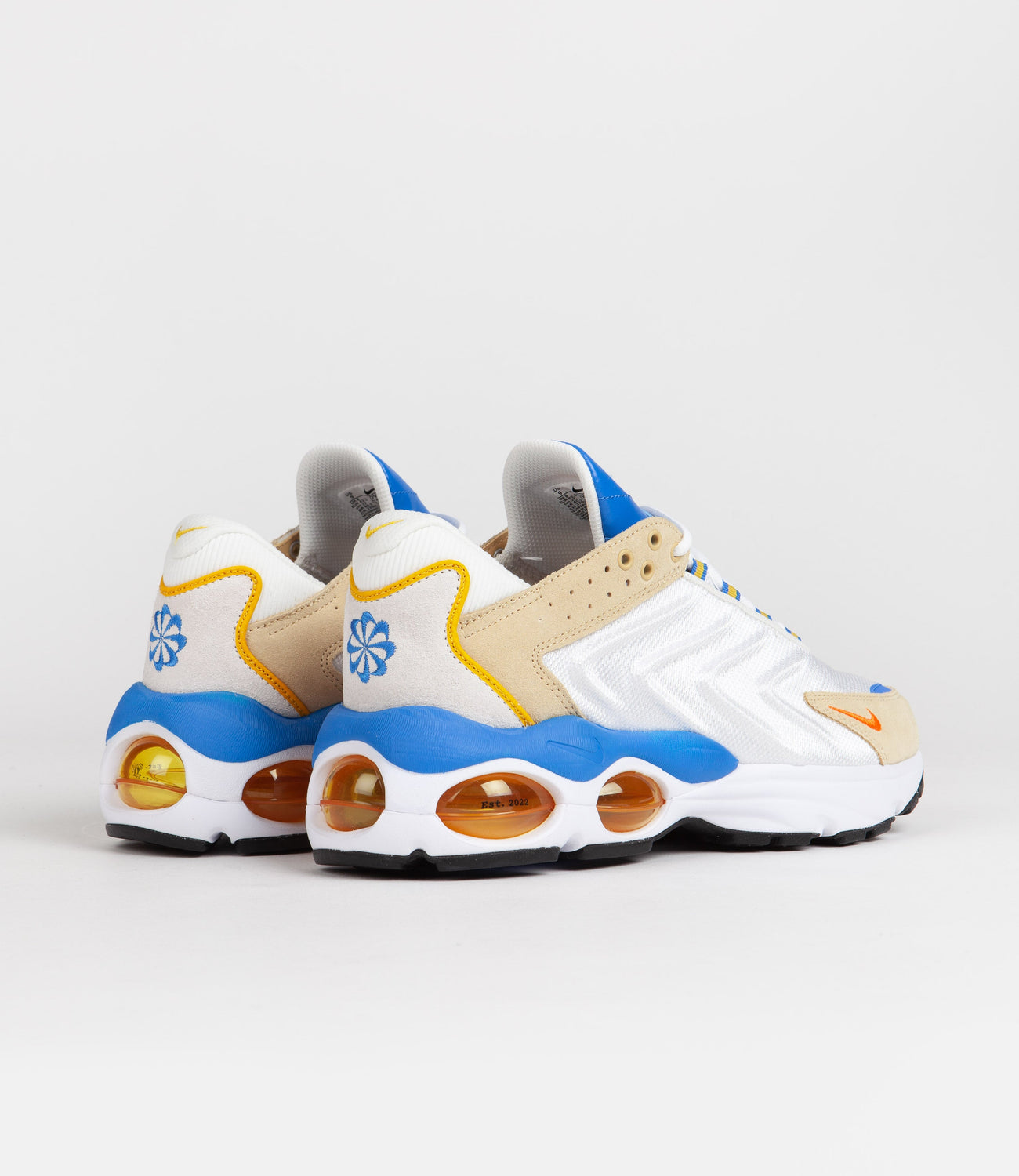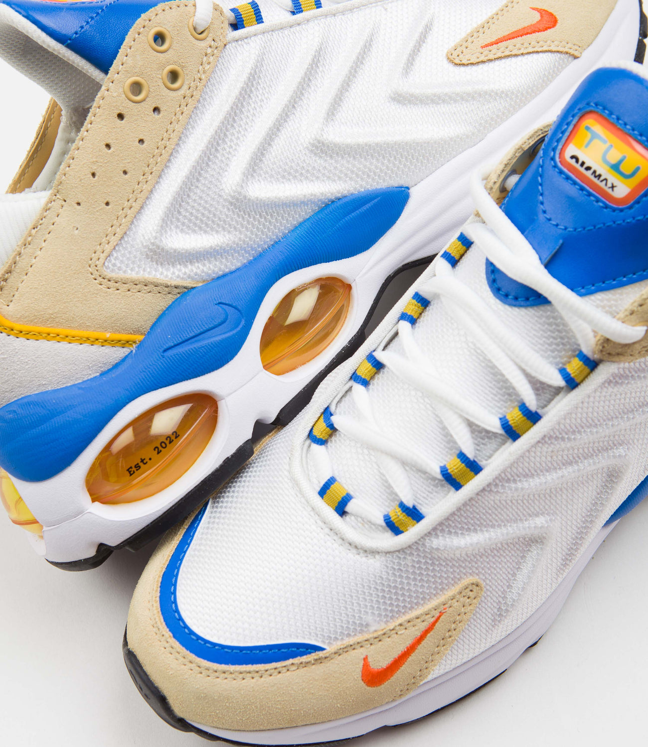 Nike Air Max TW SE Shoes in Summit White, Safety Orange and Sesame. Paying creative homage to the legendary Frank Rudy, this Nike Air Max TW SE is crafted with mixed material synthetic and mesh uppers as part of the brand’s evolving Move to Zero initiative. Featuring haptic detailing, reinforced toe overlays, a cushioned foam midsole and exposed ‘90s style Air Max windows with printed ‘EST. 2022’ TW release date detailing, this off-white and orange Nike Air Max also features a technical lacing system and a ‘TW Air Max’ badged leather tongue. Finished with custom printed insoles, embroidered pinwheel heel logos, embroidered mini Swooshes and with a detachable Air barometer gauge hangtag in reference to Frank Rudy’s pioneering technical invention.