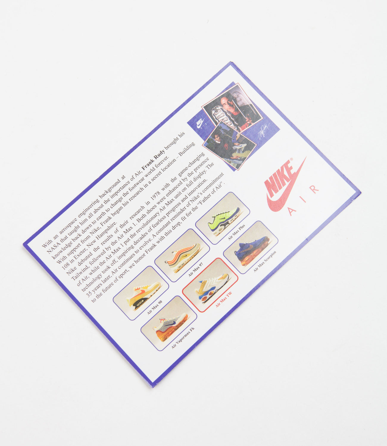 Designed as a creative tribute to the legendary designer behind Nike’s pioneering Air technology, the ‘Frank Rudy’ Nike Air Max TW SE is a visionary silhouette that combines archived details with a contemporary narrative. Part of a capsule collection and styled in a classic colourway with referential artwork and details.