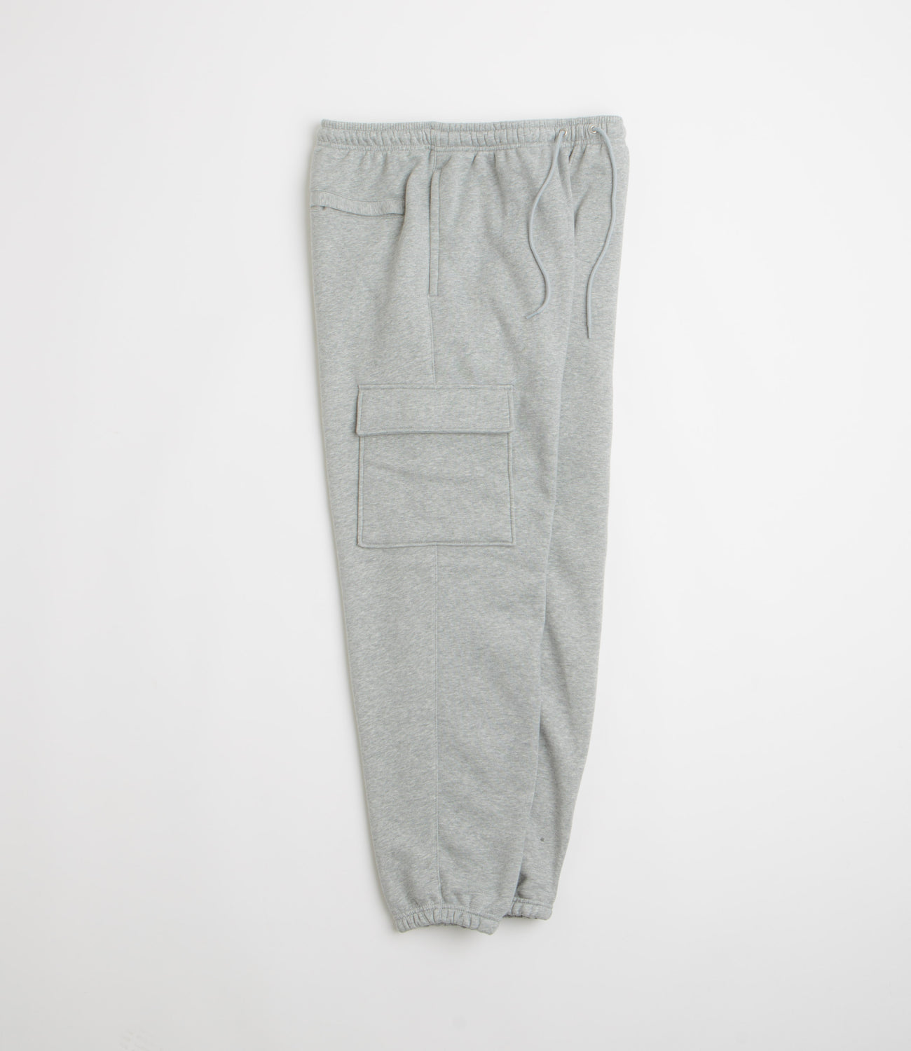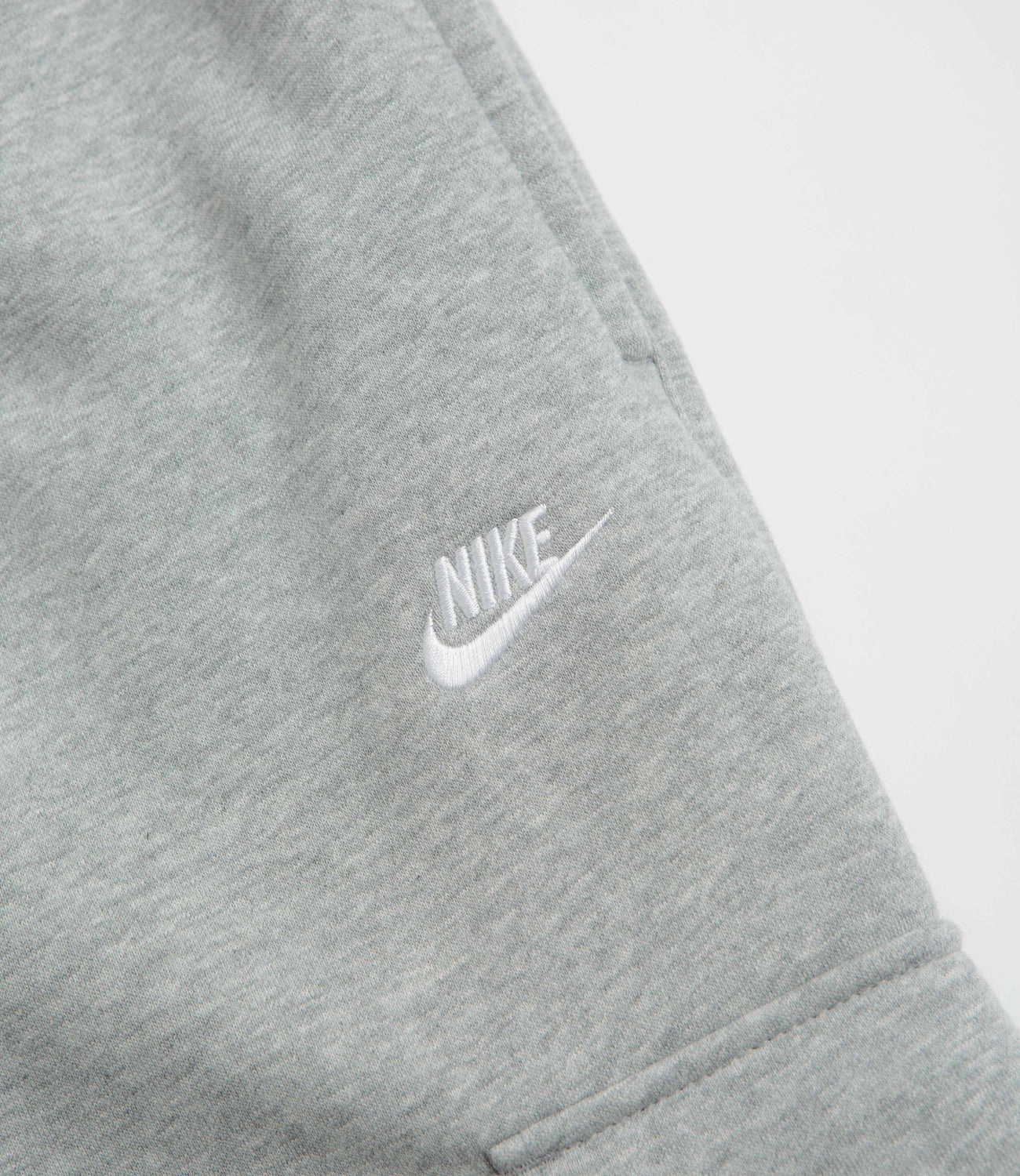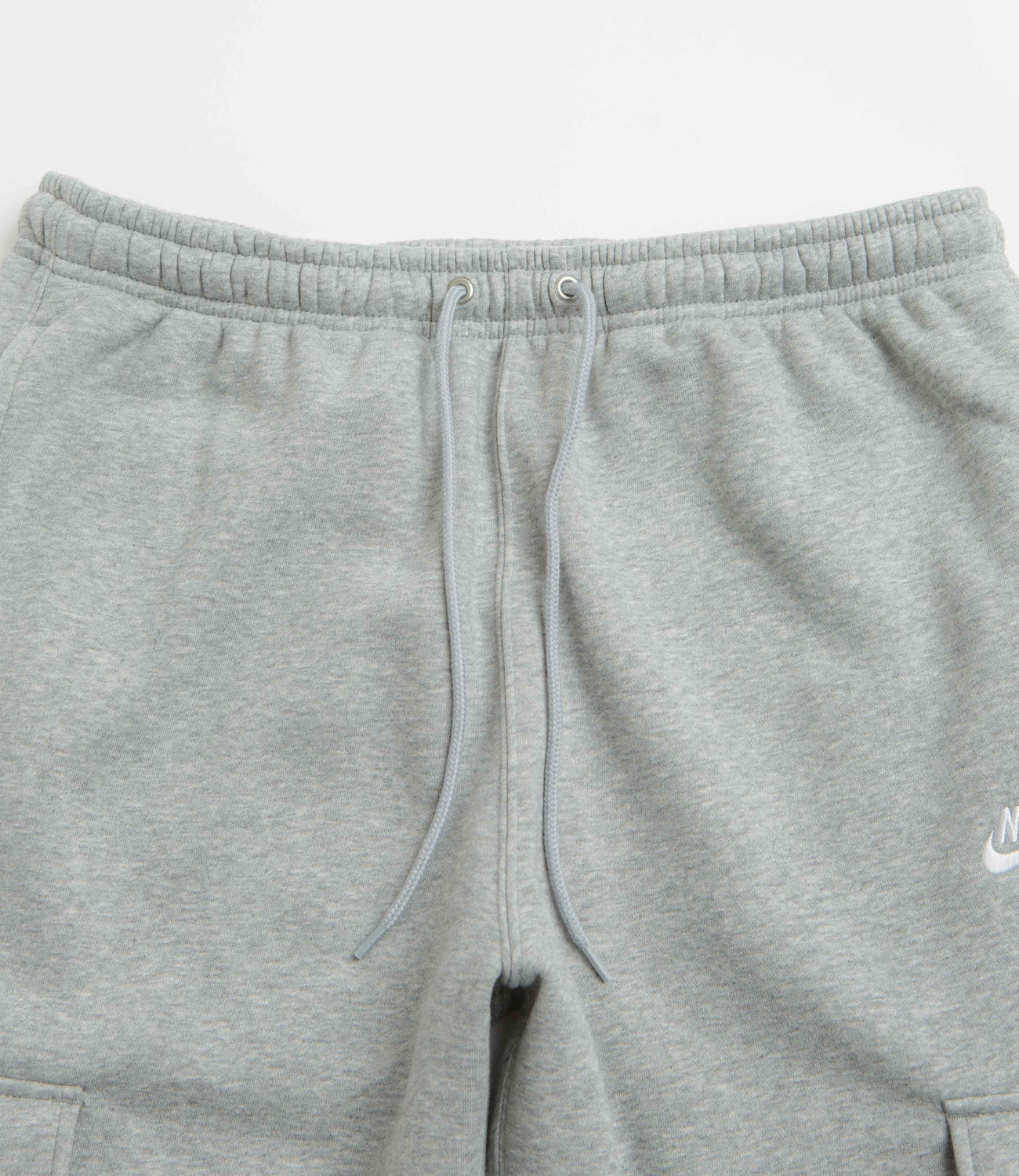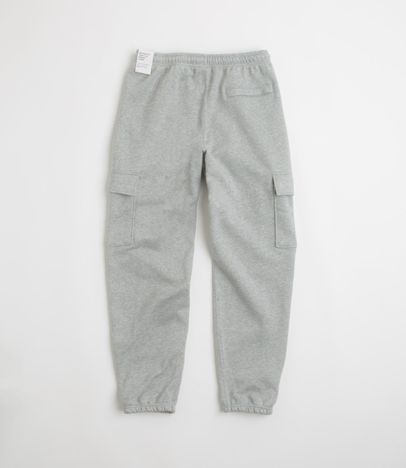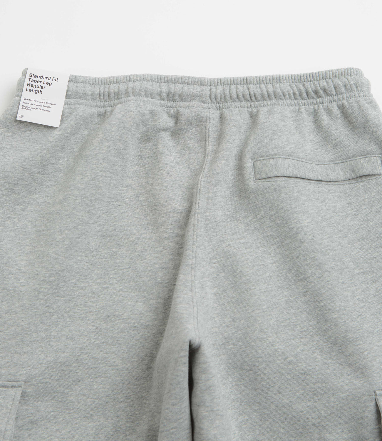 Nike Club Cargo Pants in Dark Grey Heather, Light Smoke Grey and White. Regular fitting with ribbed cuffs, these Nike pants are made from a cotton-polyester blend. Featuring a brushed fleece inner and an elasticated drawstring waist, these dark grey Nike pants are finished with two side pockets, a single rear pocket, additional cargo pockets and embroidered branding.