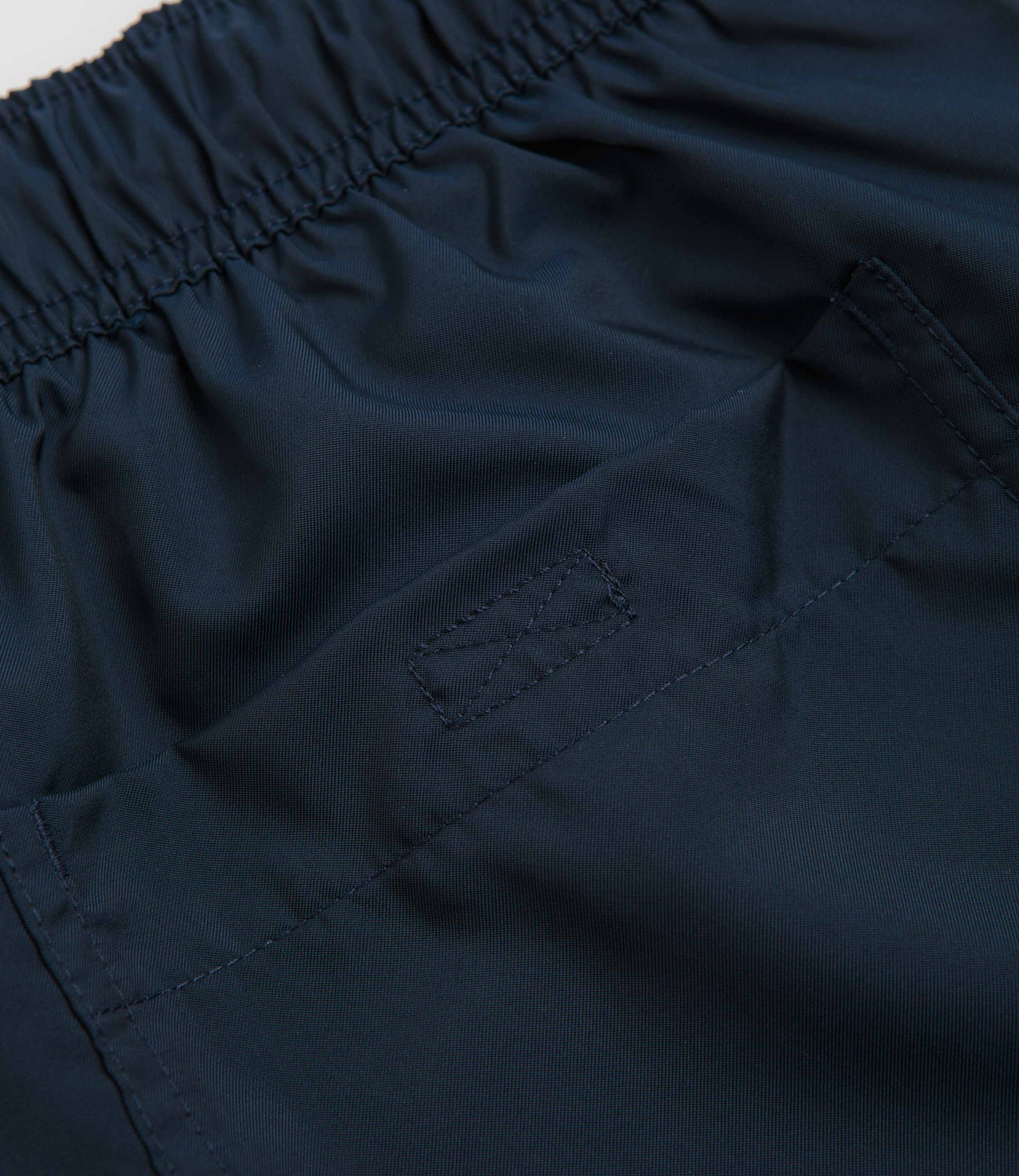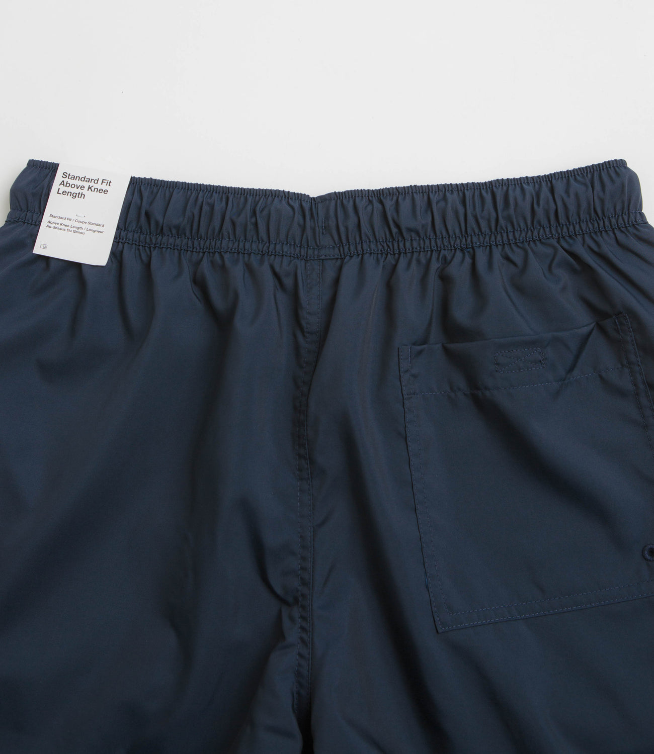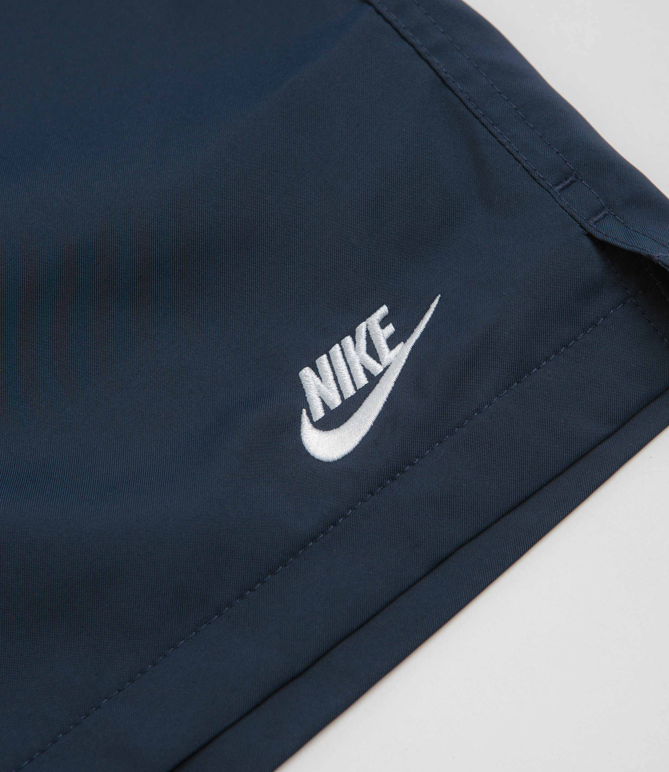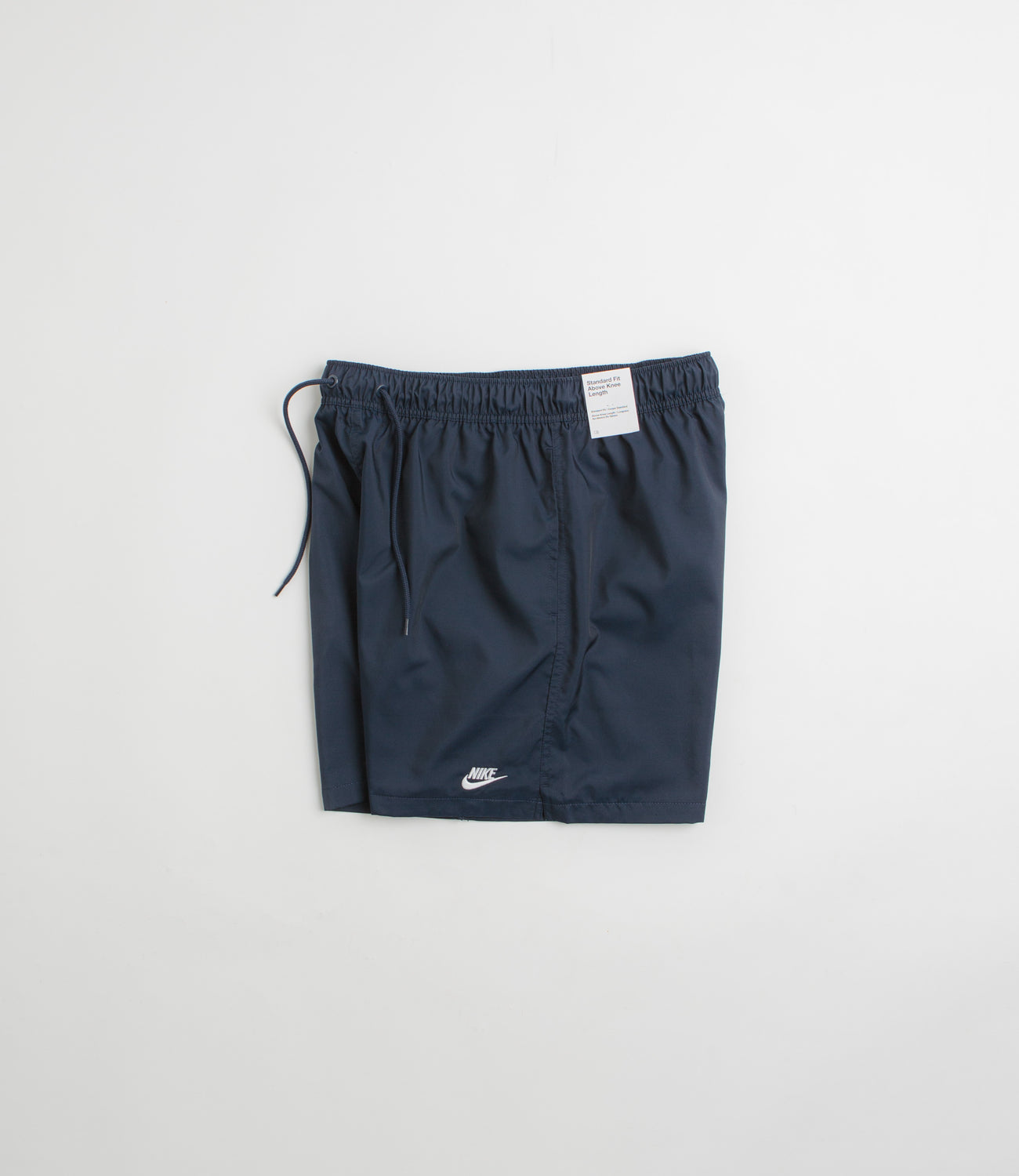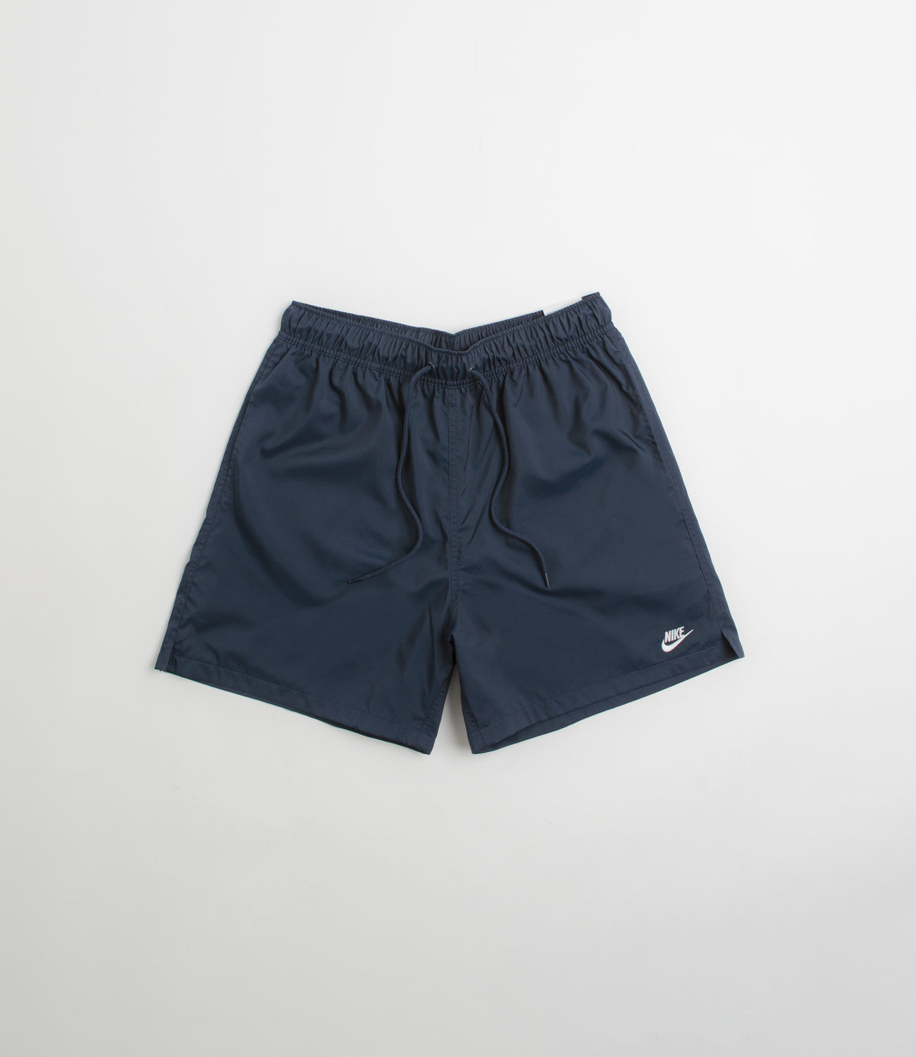 Nike Club Woven Flow Shorts in Obsidian and White. Cut to an above-knee length, these relaxed fitting Nike shorts are made from 100% polyester with a breathable mesh lining. Finished in dark navy with an elasticated waistband, two side pockets, a single rear pocket, a 6” inseam and embroidered branding.