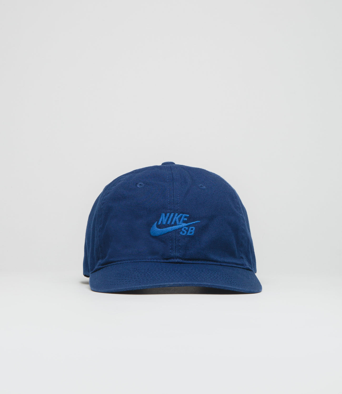 Nike SB Club Unstructured Cap in Blue Void and Game Royal. Single sized with a six panel profile, this Nike SB cap is made from 100% cotton twill. Finished in blue with embroidered eyelets, an embroidered logo and an adjustable rear fastening.
