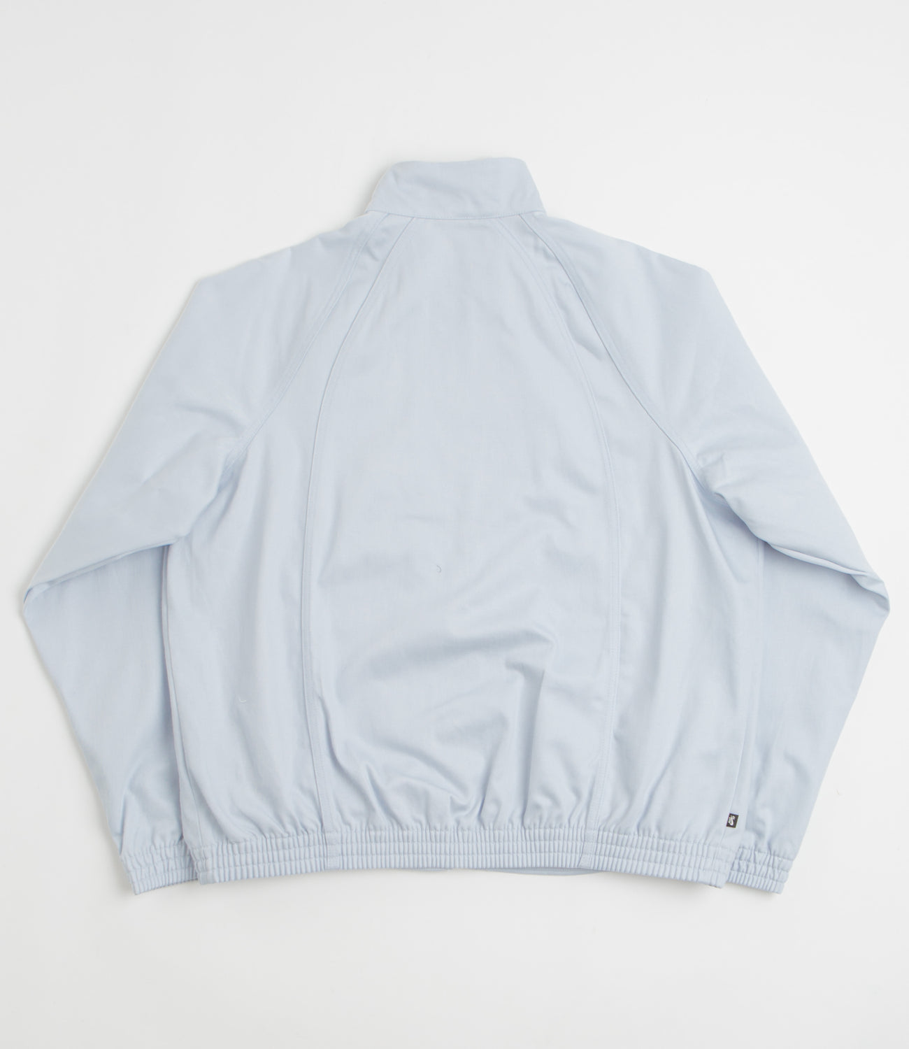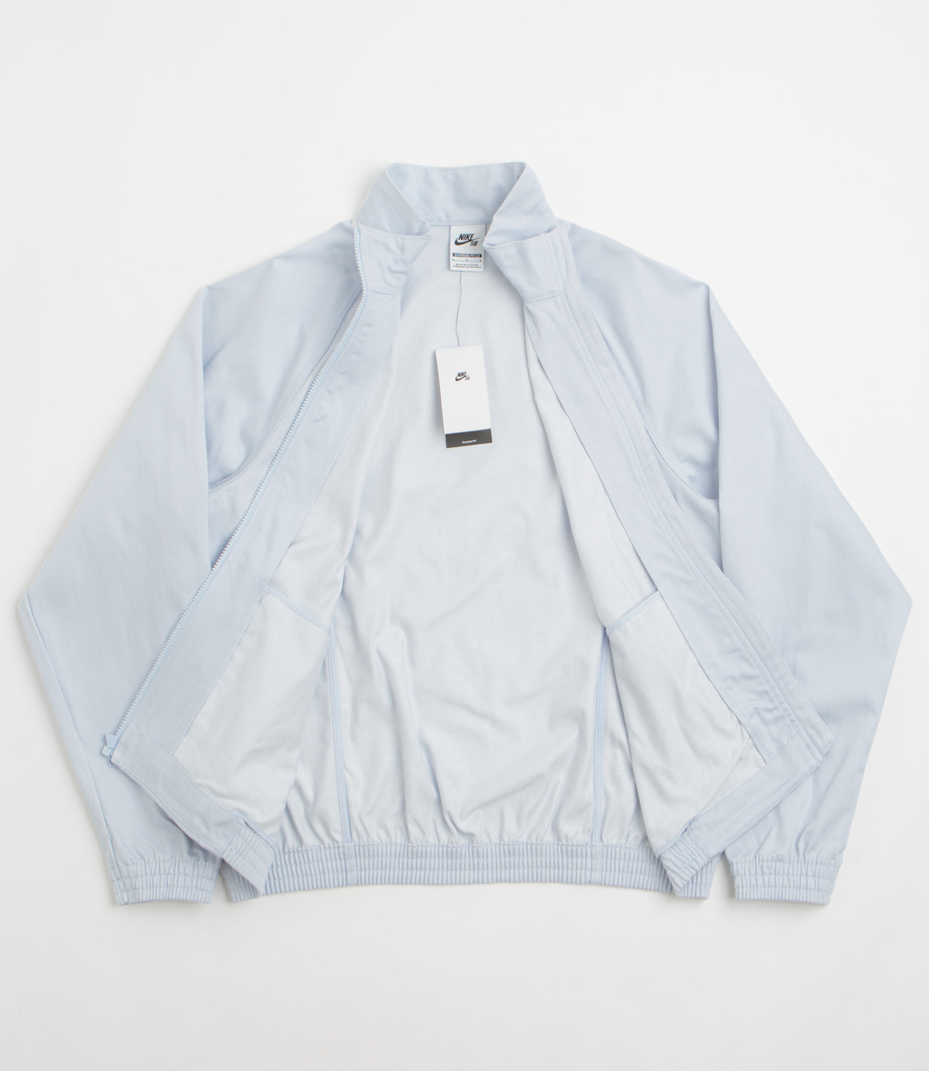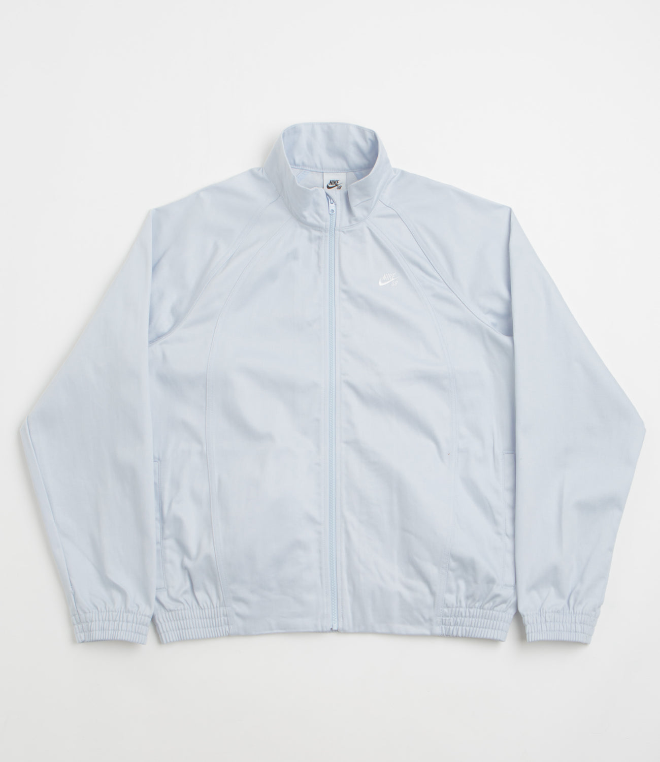 Nike SB Denim Track Jacket in Football Grey and White. Varsity inspired, this boxy fitting Nike SB track jacket is made from 100% cotton denim. Featuring a high collar, dropped shoulders, raglan sleeves and a full length zipper, this grey white Nike SB jacket is finished with embroidered branding, two side pockets and elasticated cuffs.