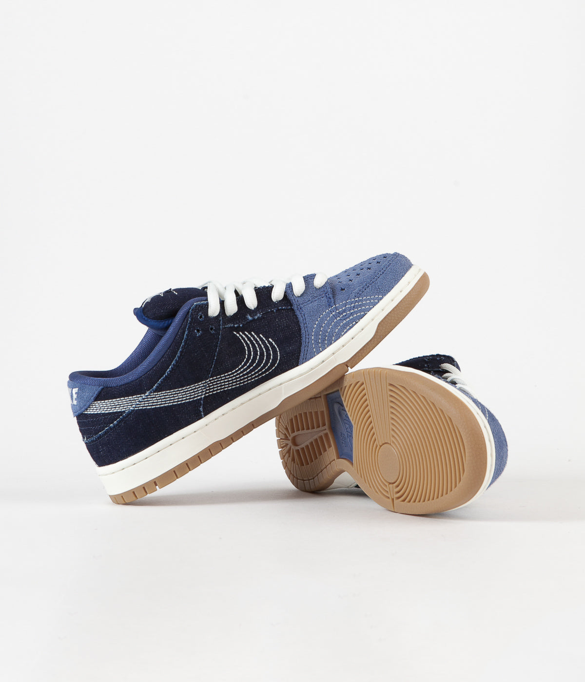 Part of the brand’s latest ‘Sashiko’ pack that honours traditional Japanese sewing techniques, these stitch-stacked Nike SB Dunk Low Pro Premium Shoes in a dyed-denim shade of mystic navy and sail white host an artisan-inspired aesthetic with references to old-school ‘90s stylings. Remaining loyal to the original ‘85 profile with its distinctive court-side trims, these low-profile skate shoes are styled with split-panel brushed suede and dyed-denim frayed-edge uppers for added resiliency and durability, whilst the creamy-white midsole, the full-cupsole stitch and the gum-brown circular treaded outsole all deliver exceptional levels of functionality and performance where needed. A responsive foam sockliner cushions the interior, whilst Nike’s iconic Zoom Air unit formats the heel for added impact and flick. Honouring Sashiko’s ‘new items out of old’ ethos, the body of the sneaker hosts an upcycled vibe for a more throwback sense of character, with the ornate and layered white-stitch Swoosh replacing its iconic block-tone predecessor. Punch-through perforations are added to the toe-vamp for additional comfort and breathability, whilst the arching mirror-stitched curves across the toe-front and heel brace pay homage to quality craftsmanship and the notion of letting intricacies speak for themselves. A padded, dyed-denim ‘Dunk Low Pro’ branded tongue is complemented by puffy interchangeable laces from a recessed 7-eyelet panel, whilst the white-stitch ‘Nike’ branding across the soft-suede sky blue ankle collar helps seal the design off inline with classic Dunk Low tradition.