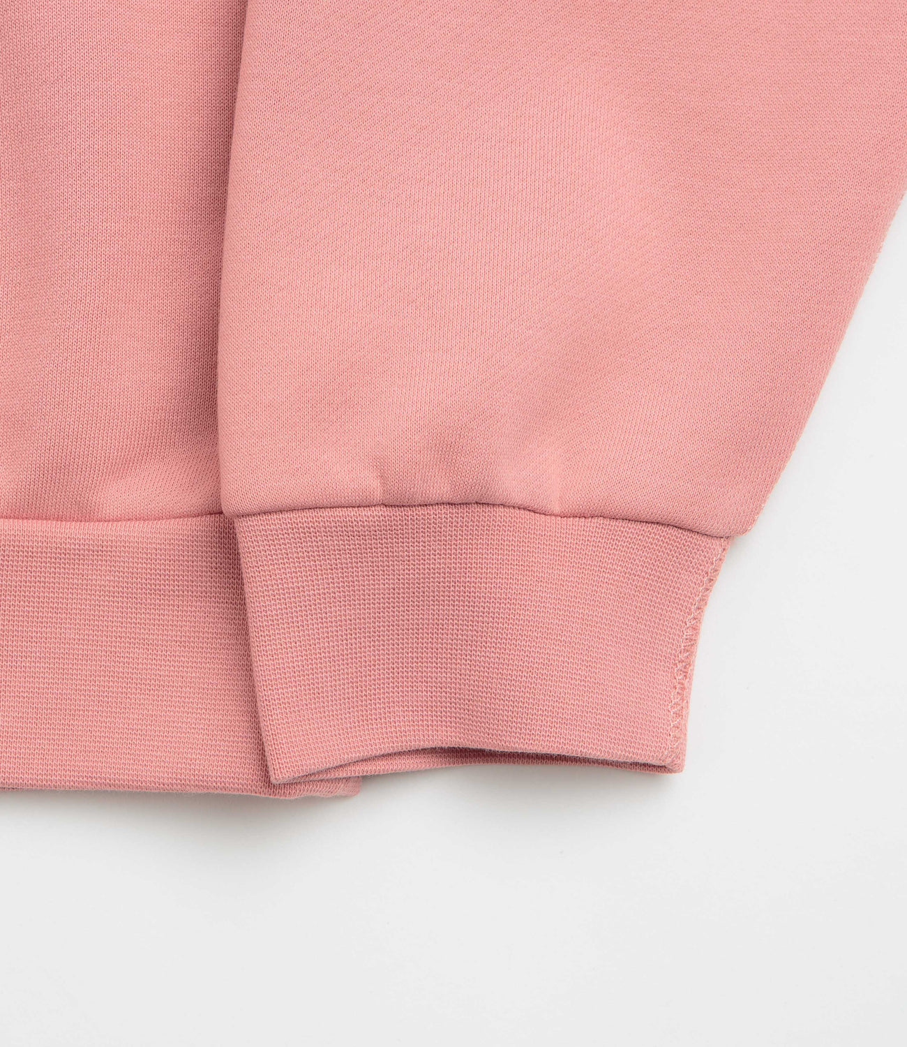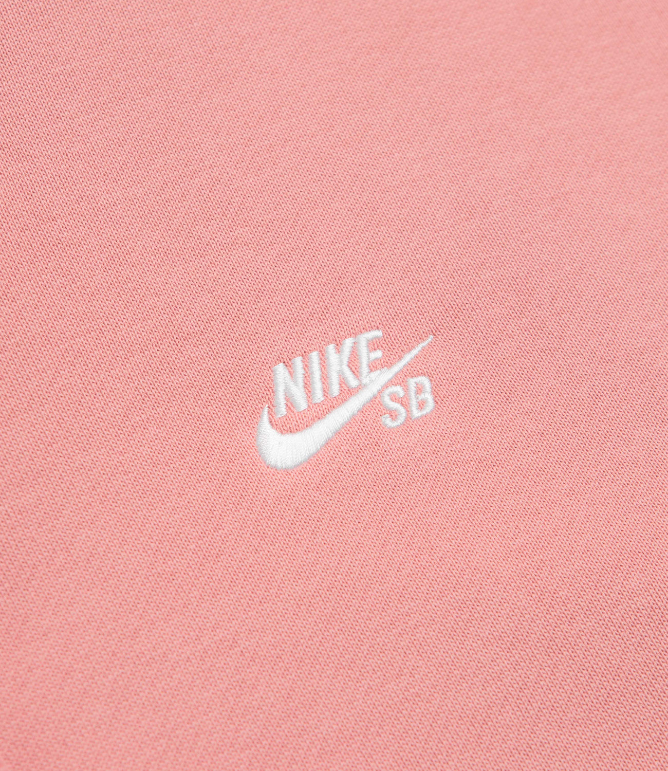 Nike SB Essential Logo Hoodie in Red Stardust and White. Made from a cotton-polyester blend, this block tone Nike SB hoodie is designed with a brushed fleece lining. Featuring an adjustable drawstring hood, ribbed cuffs and a kangaroo front pocket, this washed red Nike SB hoodie is finished with embroidered logo branding.