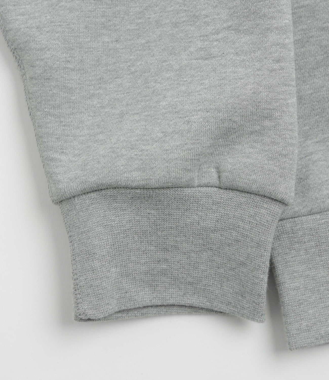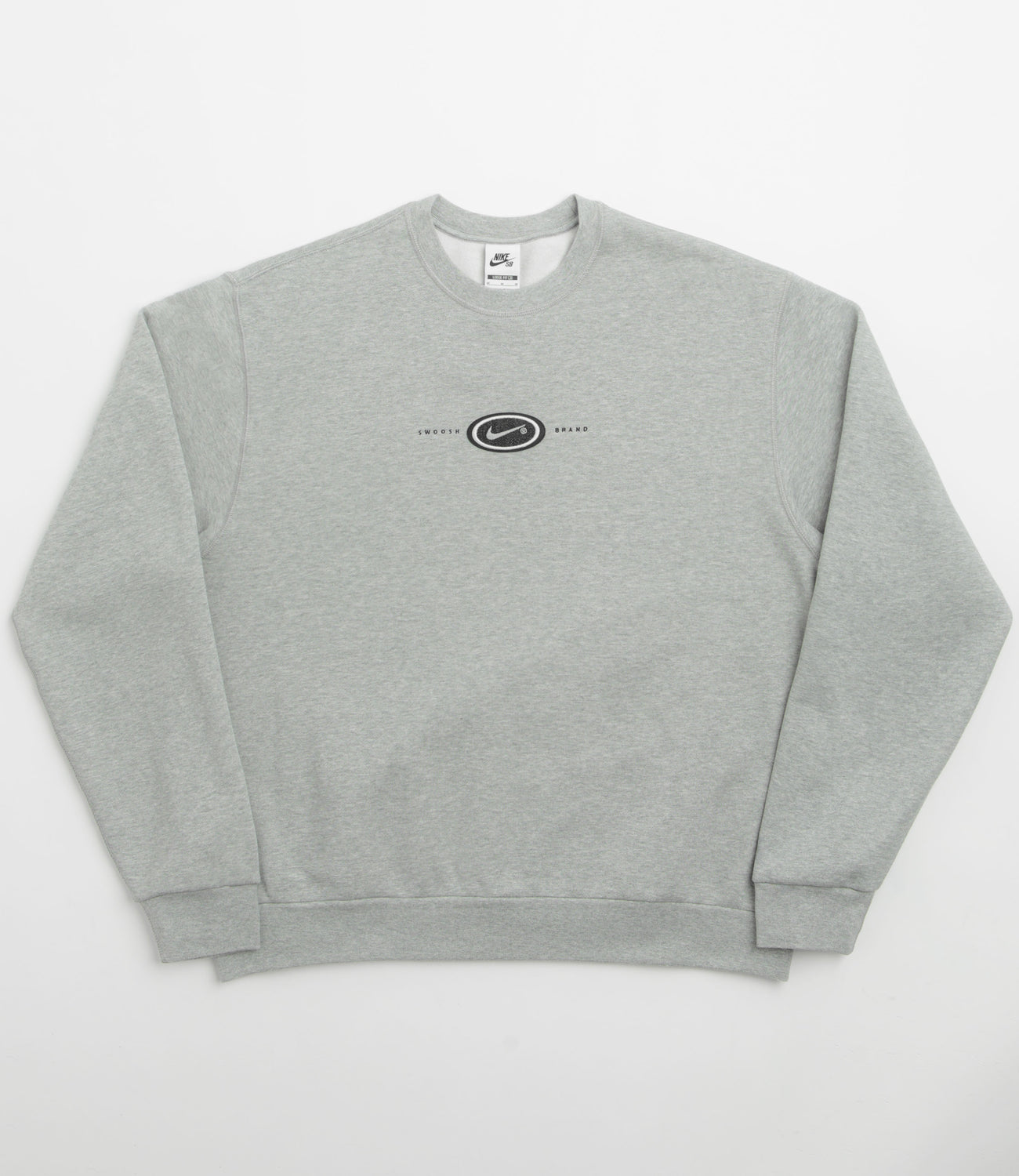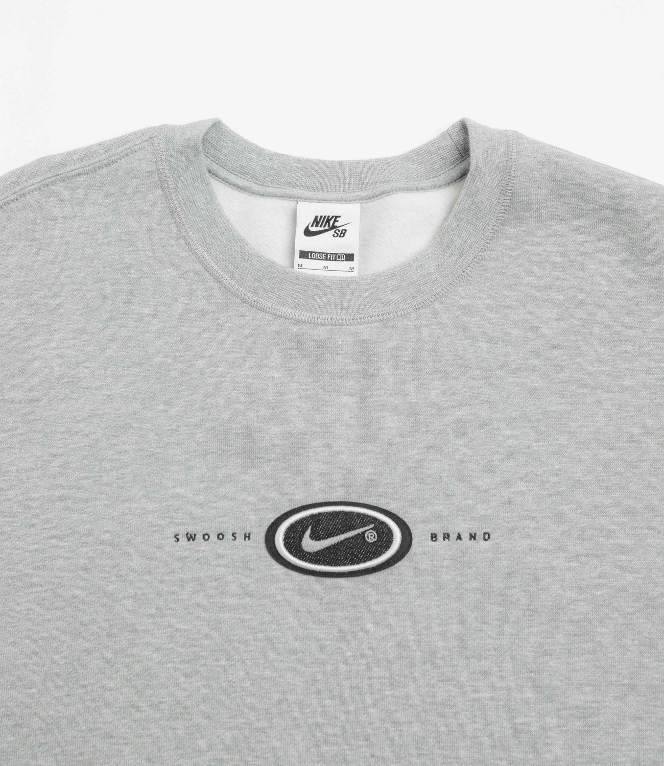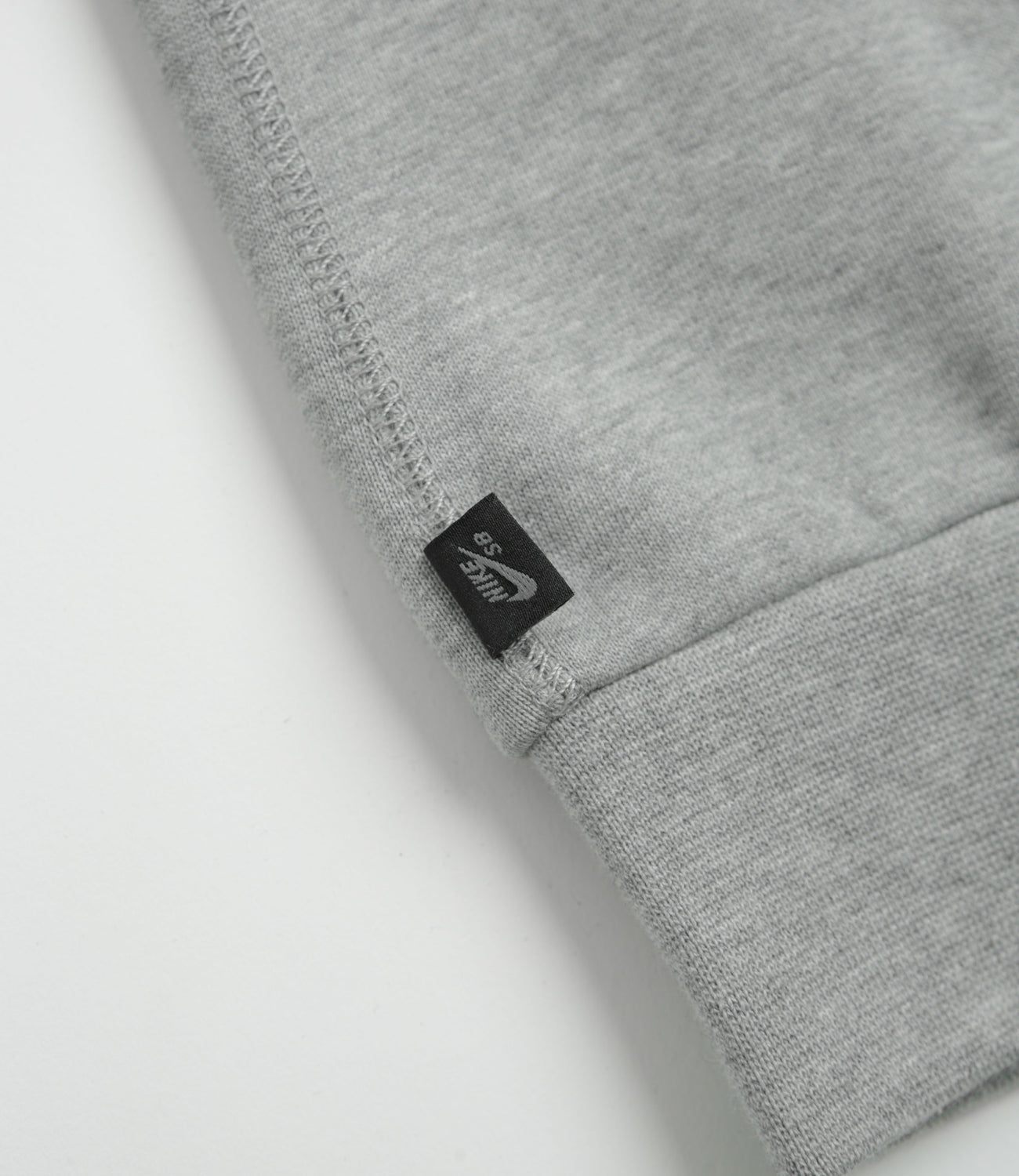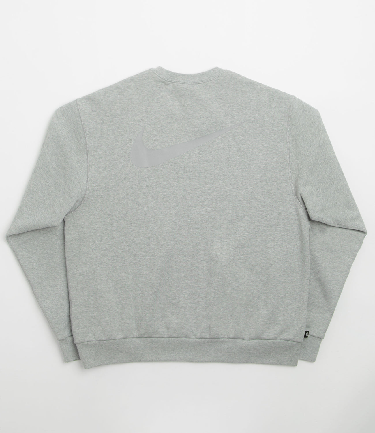 Nike SB Koston Crewneck Sweatshirt in Dark Grey Heather. Loose fitting and made from a cotton-polyester blend, this block tone Nike SB sweater is designed with a brushed fleece lining. Featuring a rib knit collar and ribbed cuffs, this dark grey Nike SB sweater is finished with an embroidered logo and a reflective woven patch.