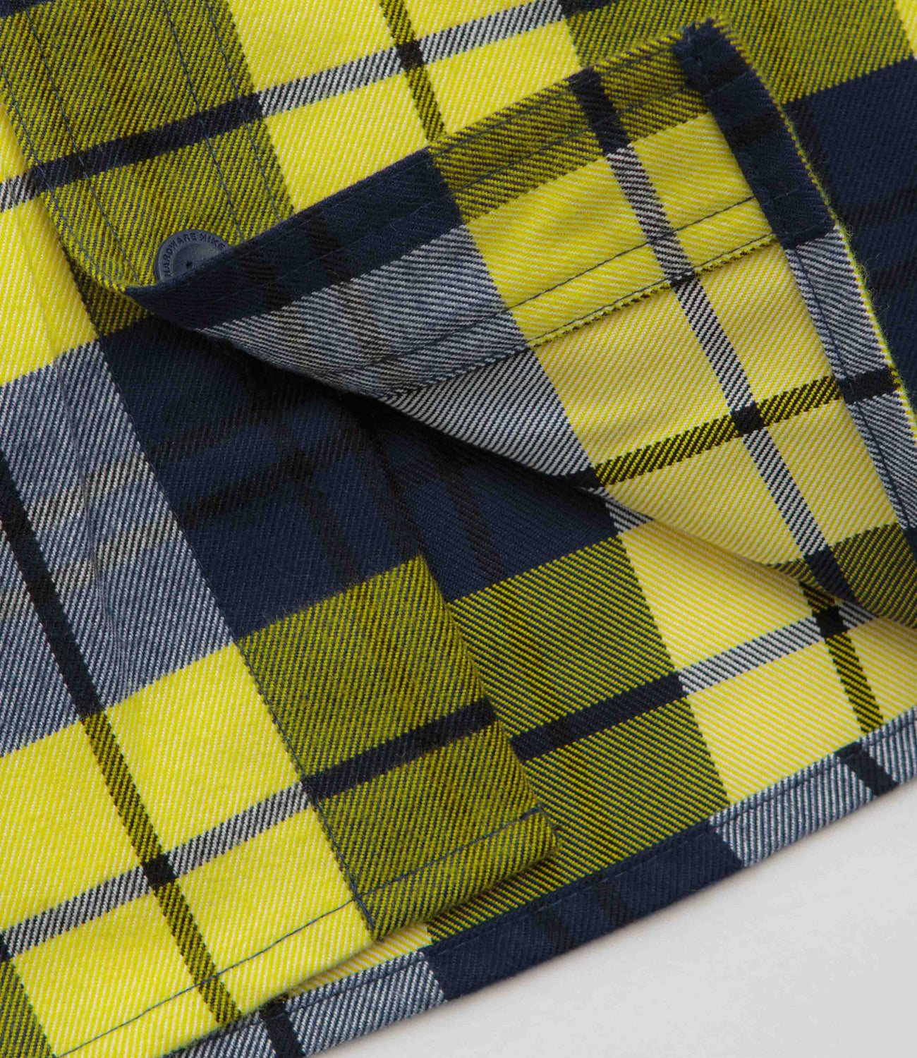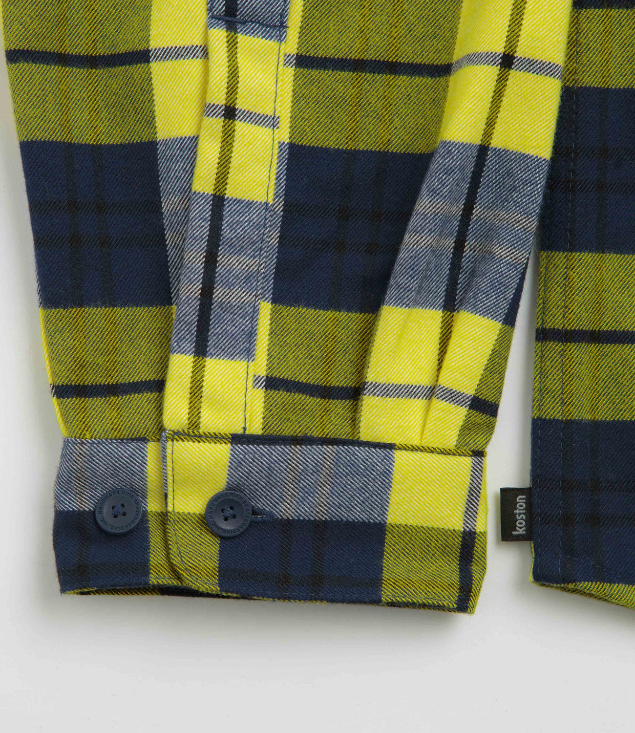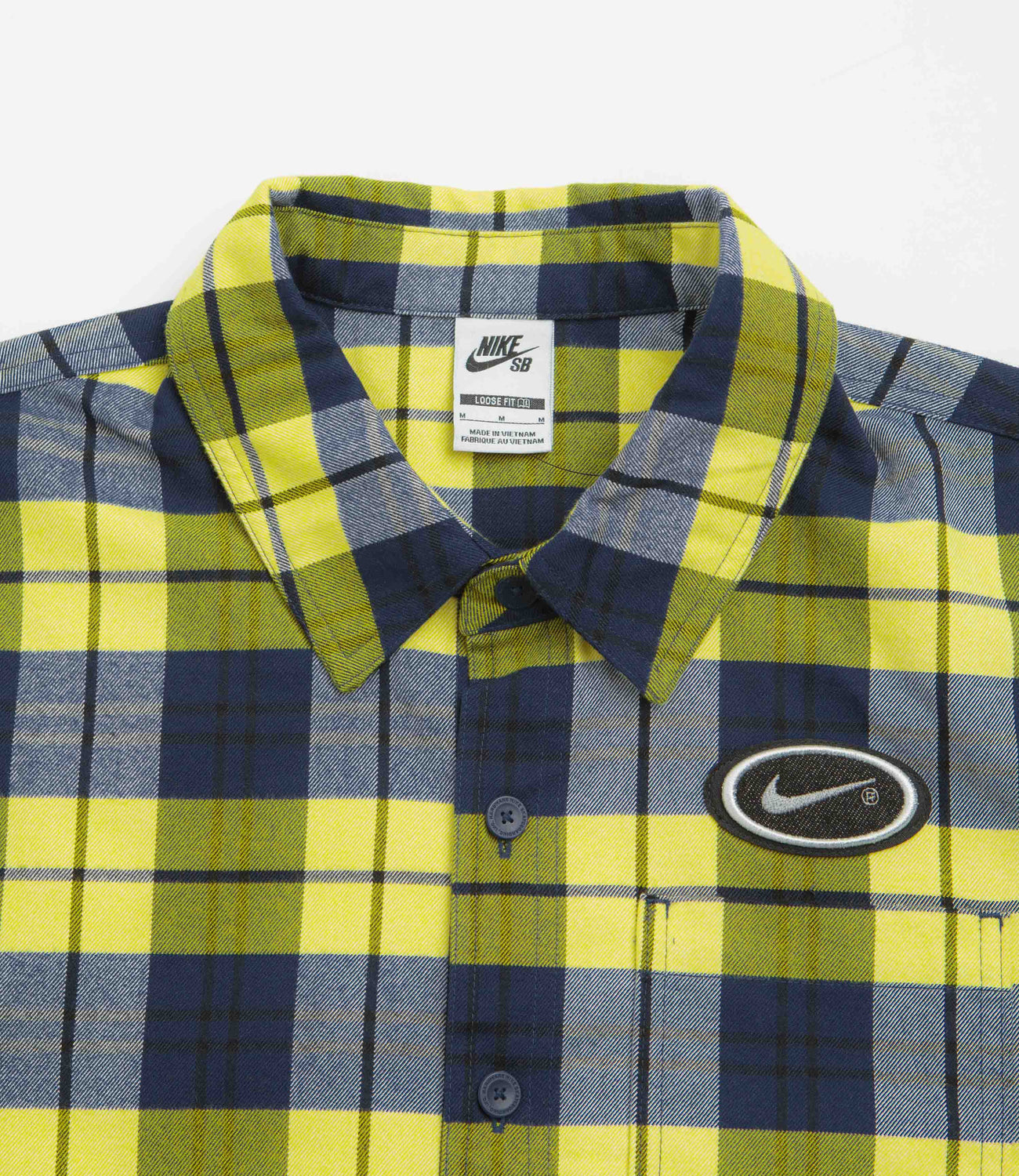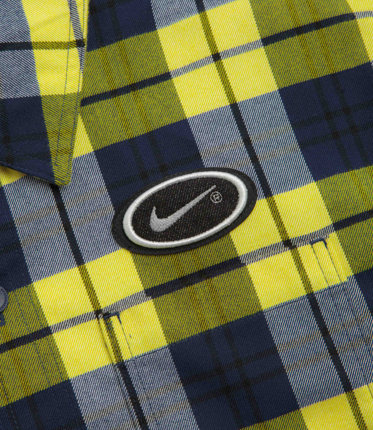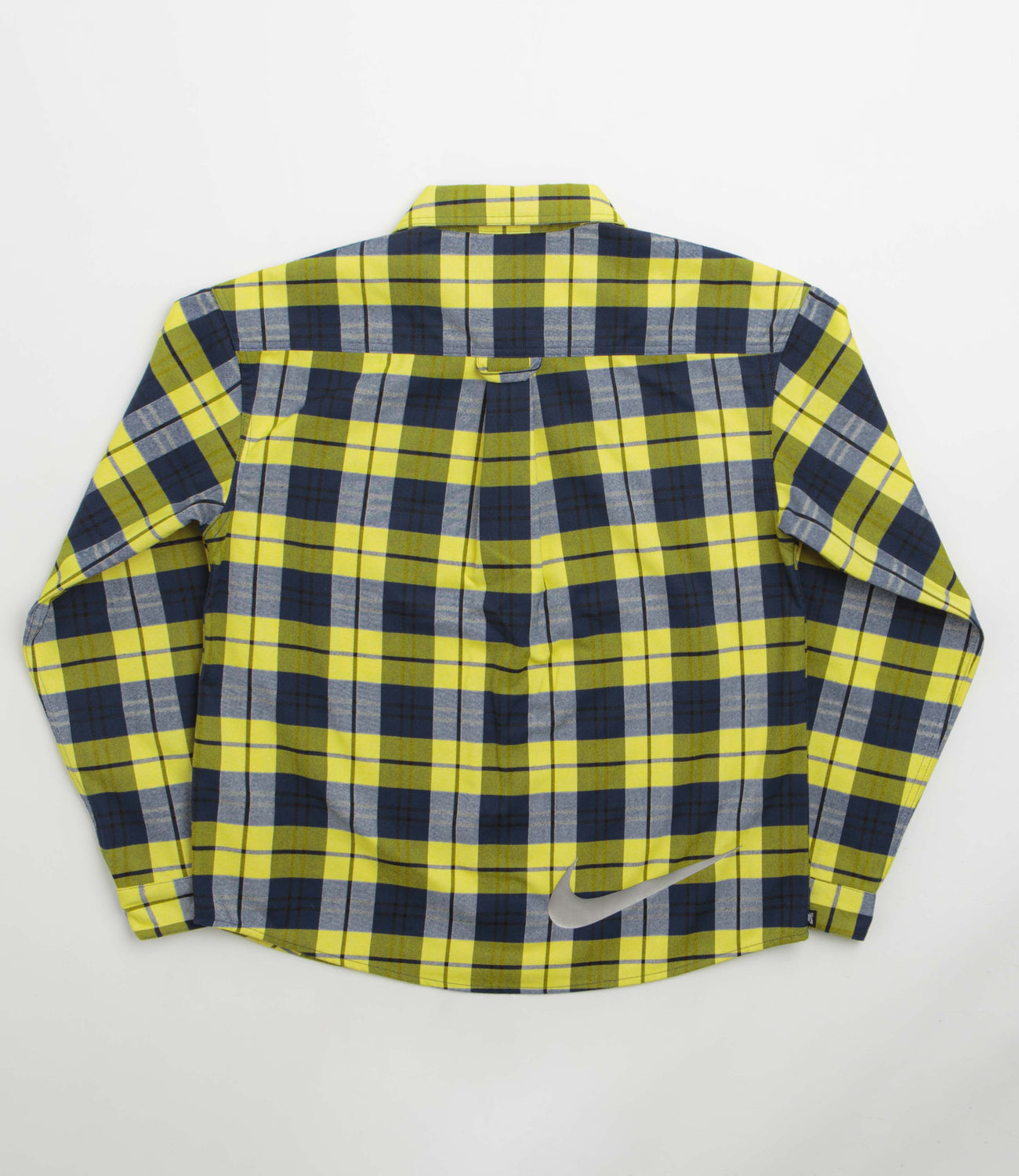 Nike SB Koston Flannel Shirt in Midnight Navy and Speed Yellow. Loose fitting and made from a polyester-rayon blend, this Nike SB shirt is designed with an all-over flannel pattern. Featuring a stand collar, a full length button fastening and adjustable cuffs, this yellow navy Nike SB shirt is finished with a single chest pocket, a reflective woven patch and a reflective rear Swoosh.
