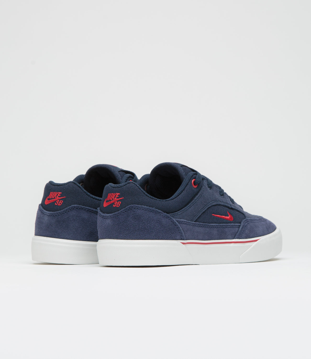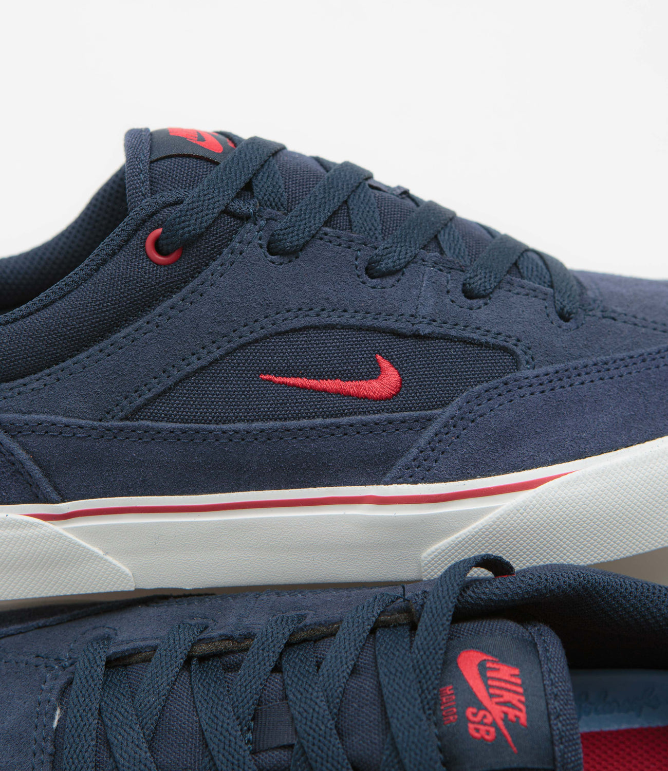 Nike SB Malor Shoes in Obsidian, Gym Red and Midnight Navy. Crafted with suede and canvas uppers, this Nike SB Malor is designed with an extended toe bumper and a cushioned tongue. Featuring a vulcanised construction, a herringbone tread and a padded collar, this navy Nike SB Malor is finished with embroidered Swooshes and a woven tongue label.