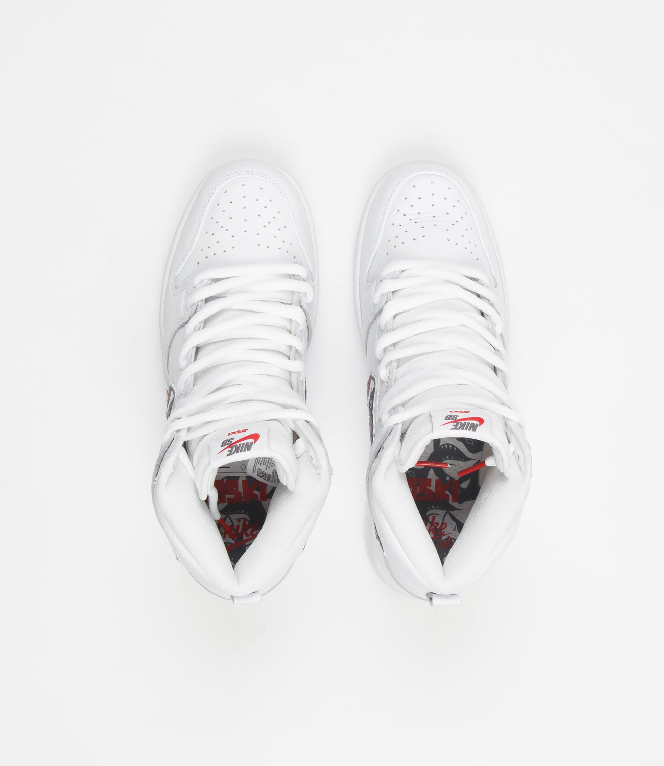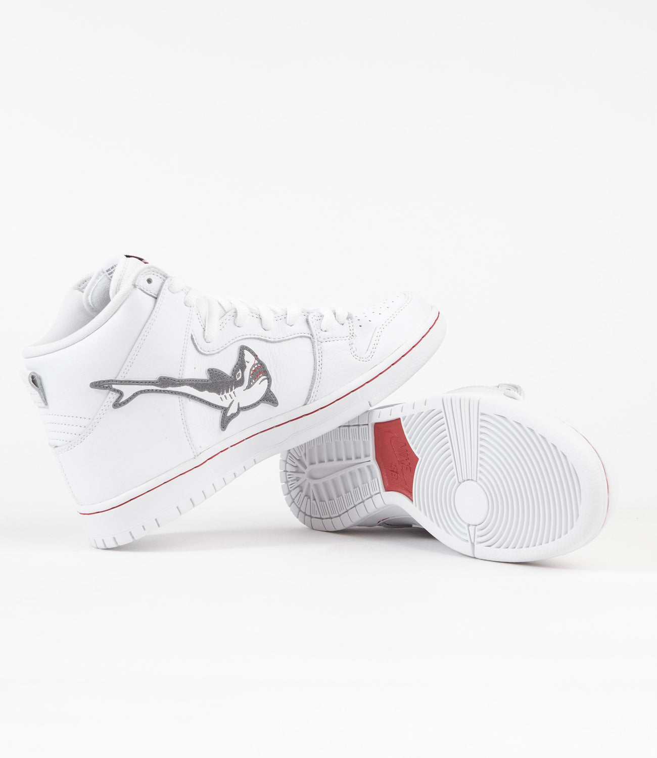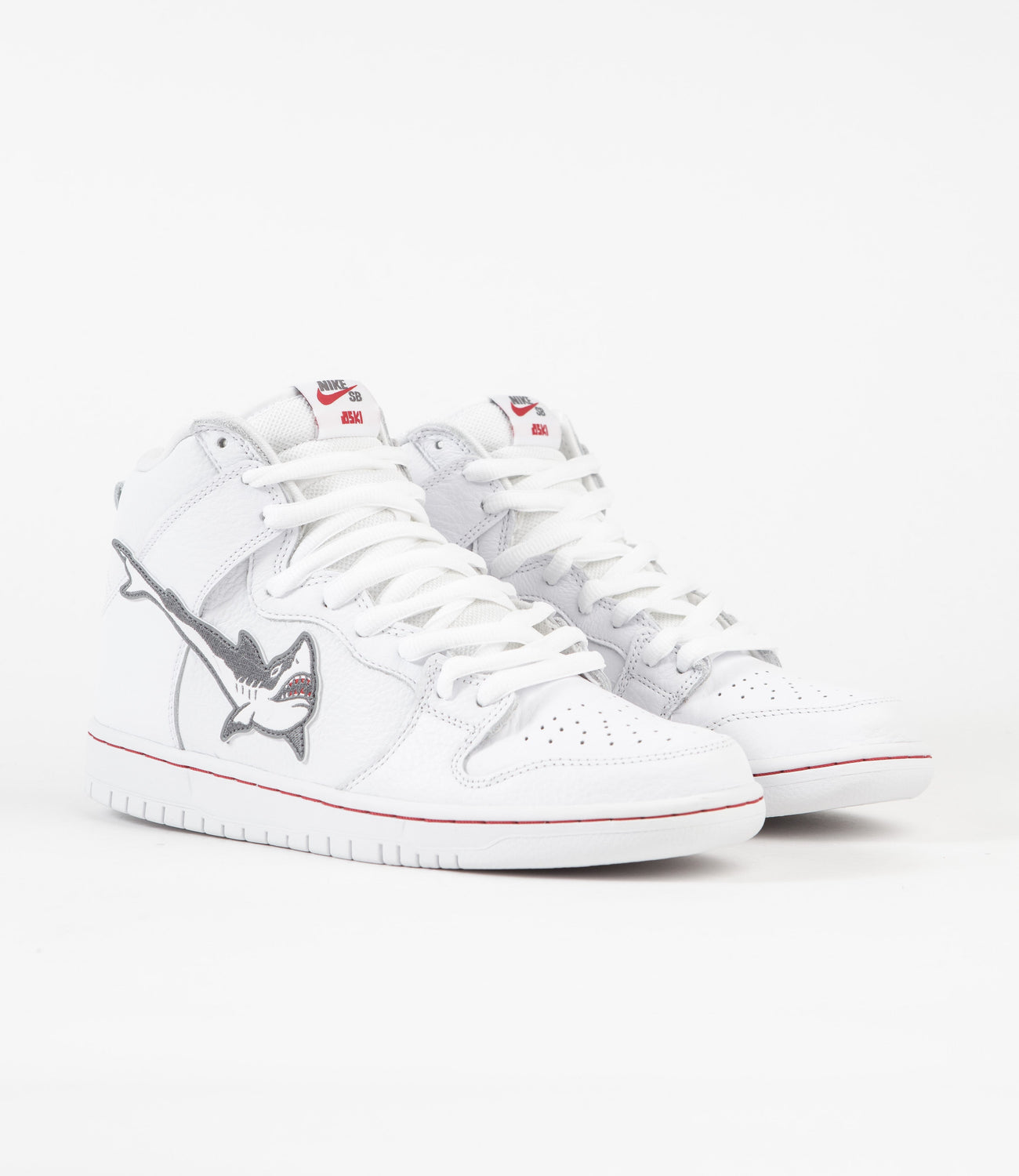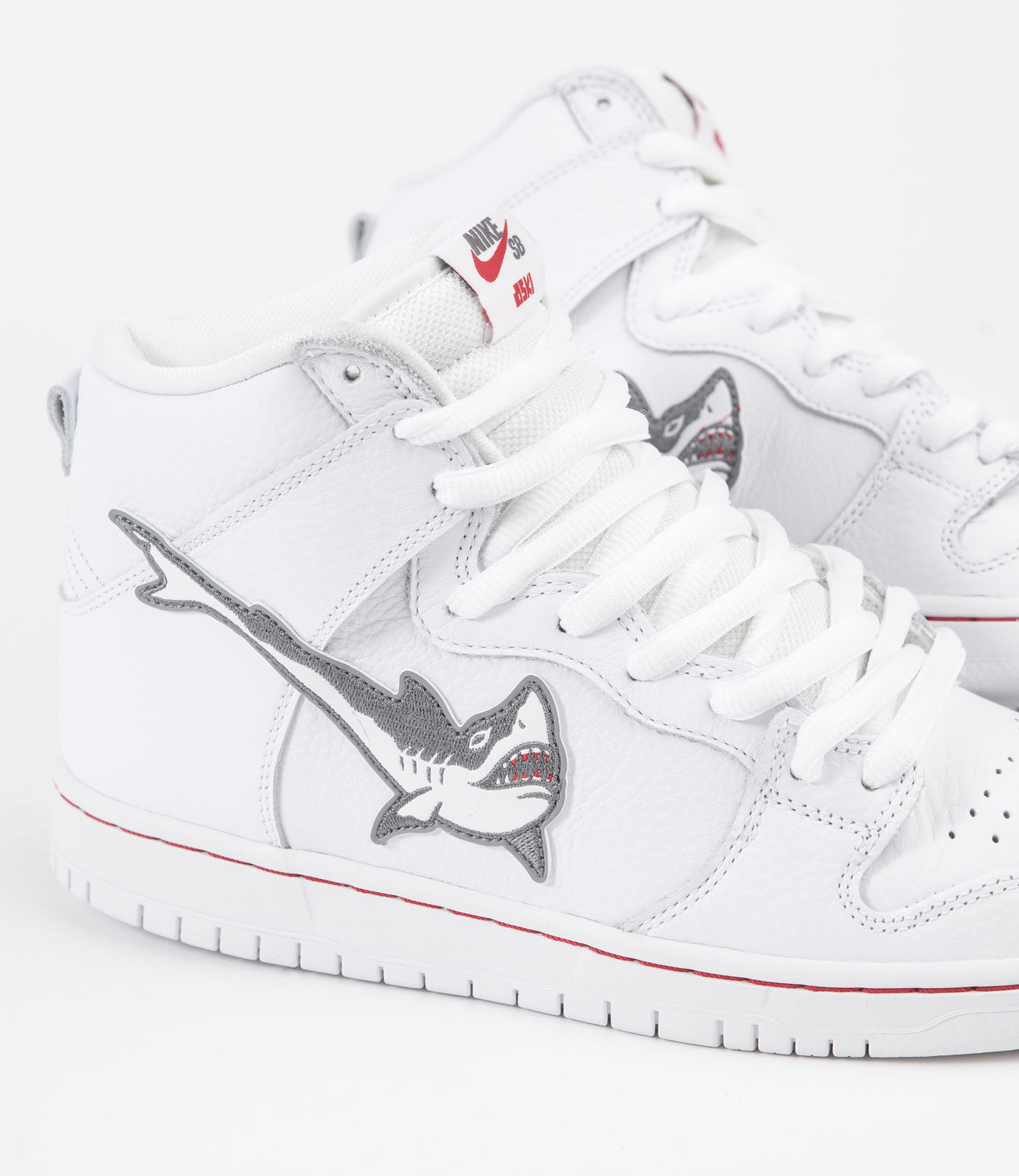 Nike SB Orange Label Dunk High Pro 'Oski' Shoes in White and Cool Grey. The follow up to 2019’s black, nubuck Orange Label ‘Oski’ release, this Nike SB Dunk High arrives as a contrasting colourway for team rider Oskar Rozenberg. Styled with supple white leather uppers, a perforated toe box, a contrasting red cupsole stitch and with a classic circular underfoot tread that features a vibrant red foam outsole window. An integrated Zoom Air unit provides increased cushioning and impact absorption, whilst interchangeable rounded laces secure the ‘Nike SB Oski’ woven mesh tongue in place across the arch of the foot. Silver and white embroidered Great White sharks replace the classic Swooshes across each sidewall, with the printed ‘Oski x Nike SB’ insoles styled with design matched shark graphics. Finished with a padded collar, woven heel pulls and with pops of deep red stitching in honour of its shark themed design.