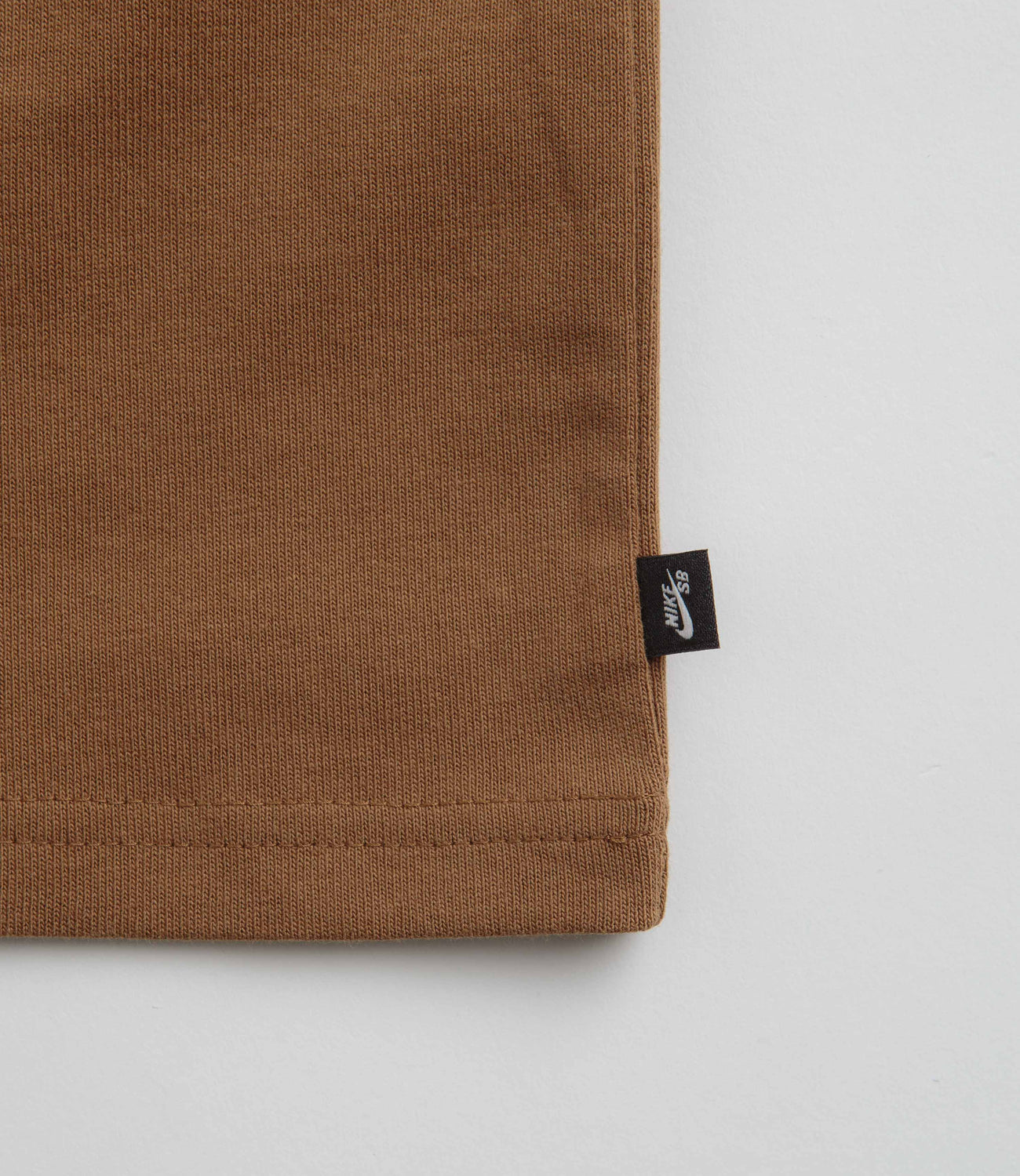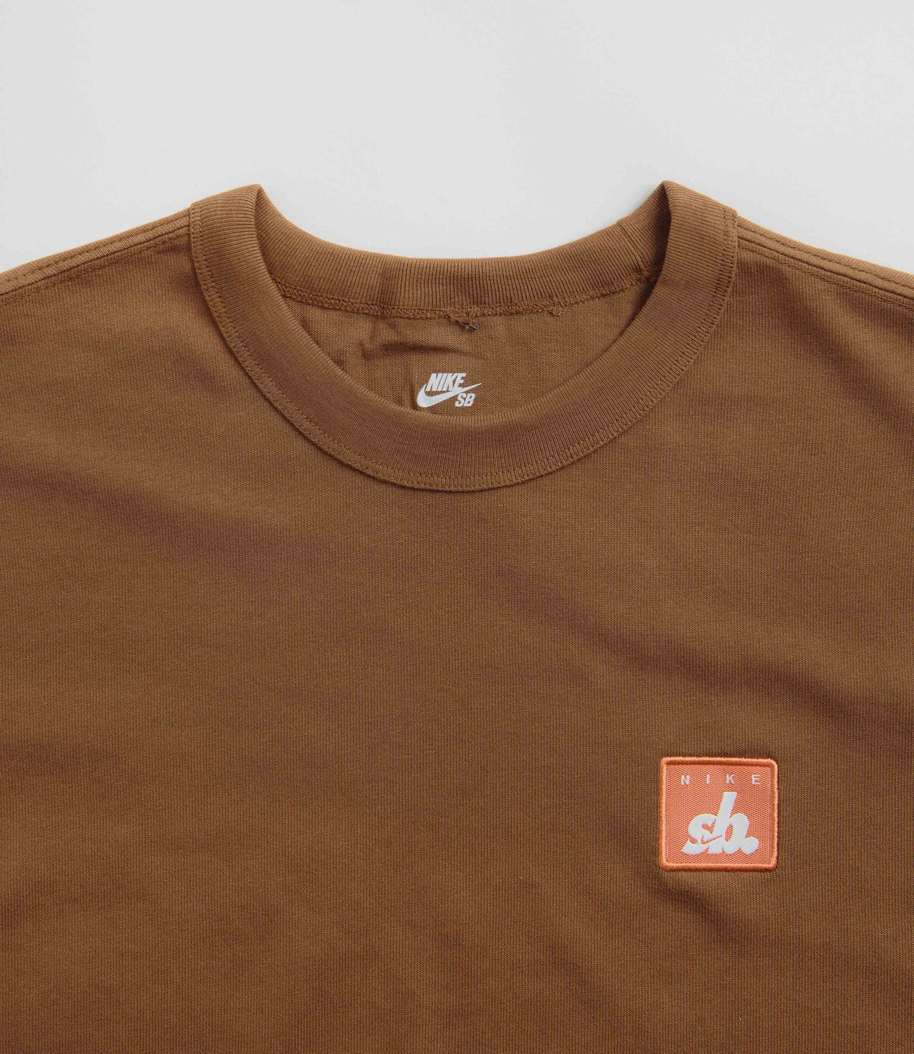 Nike SB Patch Logo T-Shirt in Light British Tan. Tailored to a loose fitting from 100% cotton, this Nike SB t-shirt is designed with a dropped shoulders, a flexible rib knit collar and a reinforced hem. Finished in a shade of tan brown with a woven side seam flag label and an embroidered left chest patch graphic.