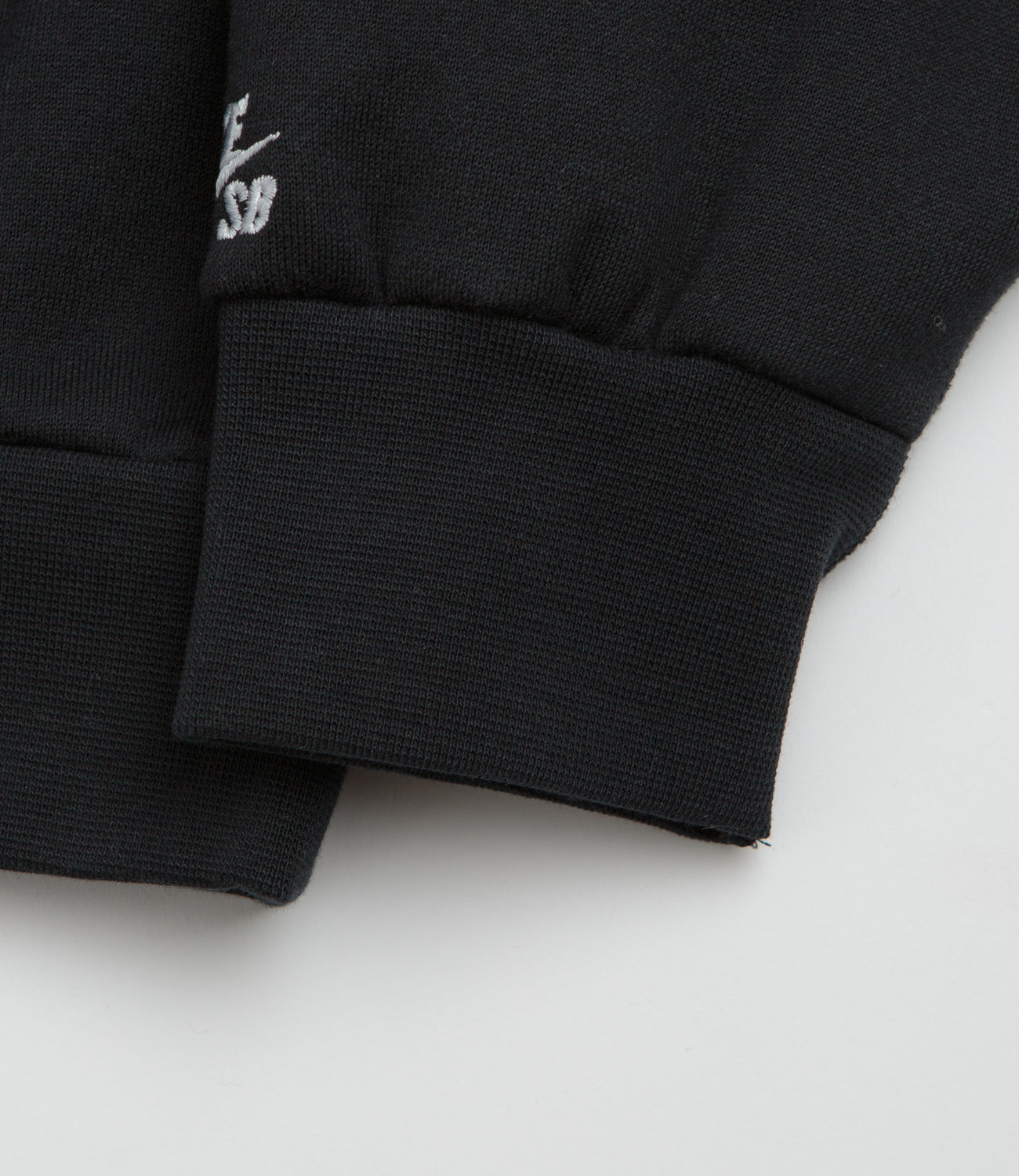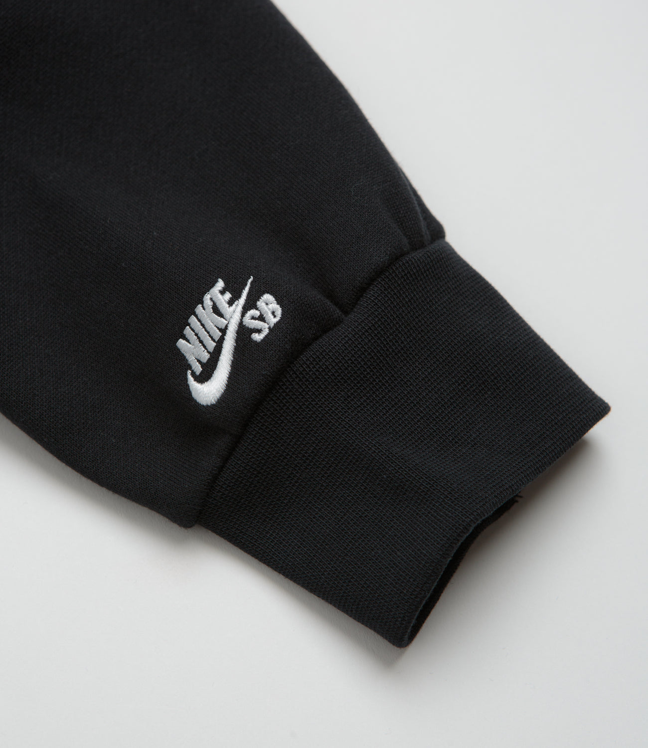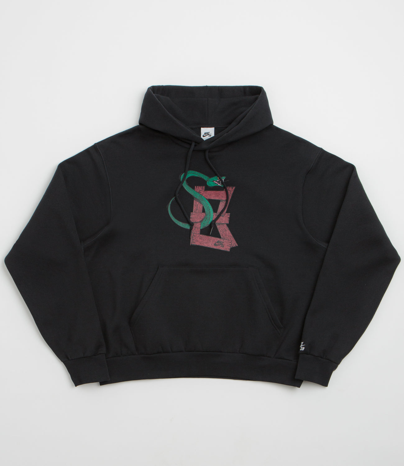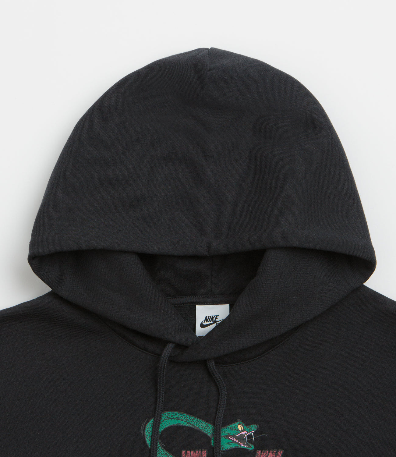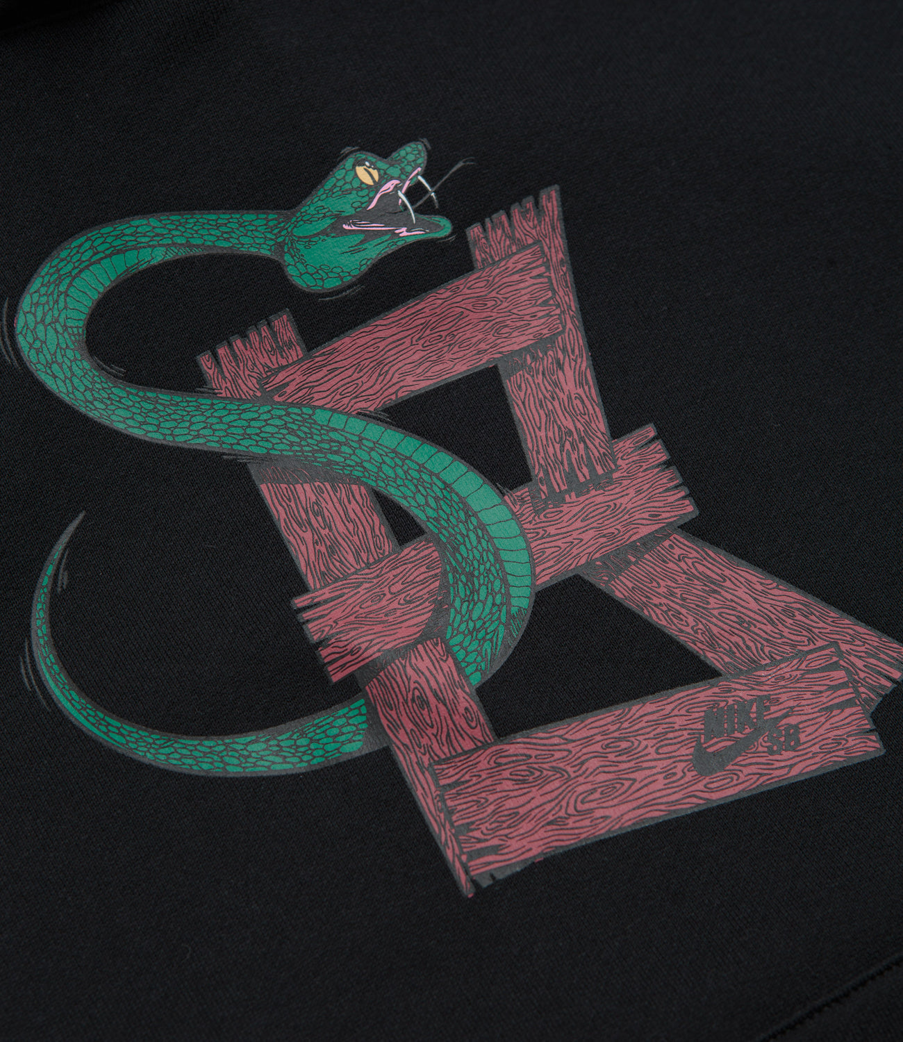 Nike SB Snake Hoodie in Black and White. Drawing inspiration from Americana, this loose fitting Nike SB hoodie is made from a midweight cotton-polyester blend. Featuring a brushed fleece lining, a braided drawstring hood and a kangaroo front pocket, this black Nike SB hoodie is finished with ribbed cuffs, a woven elastic hem, a screen printed chest graphic and with embroidered Nike SB sleeve branding.