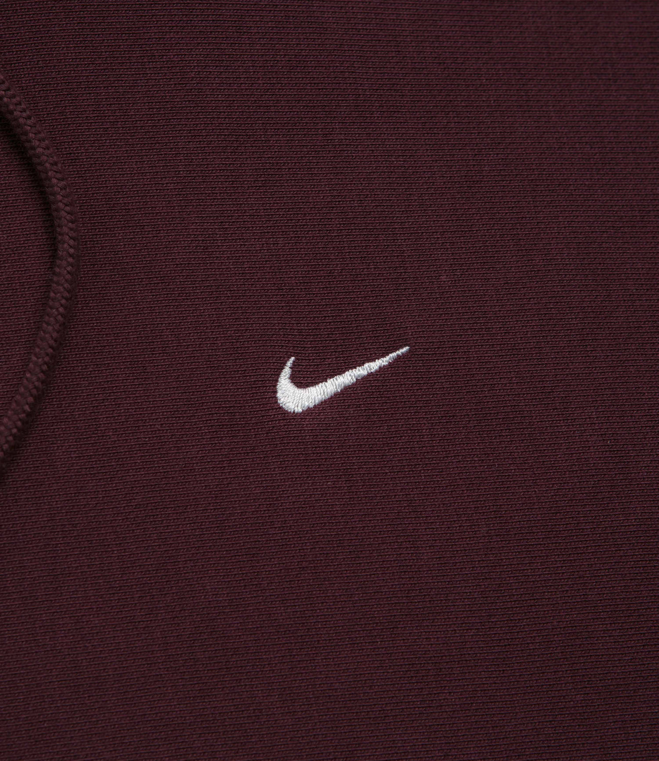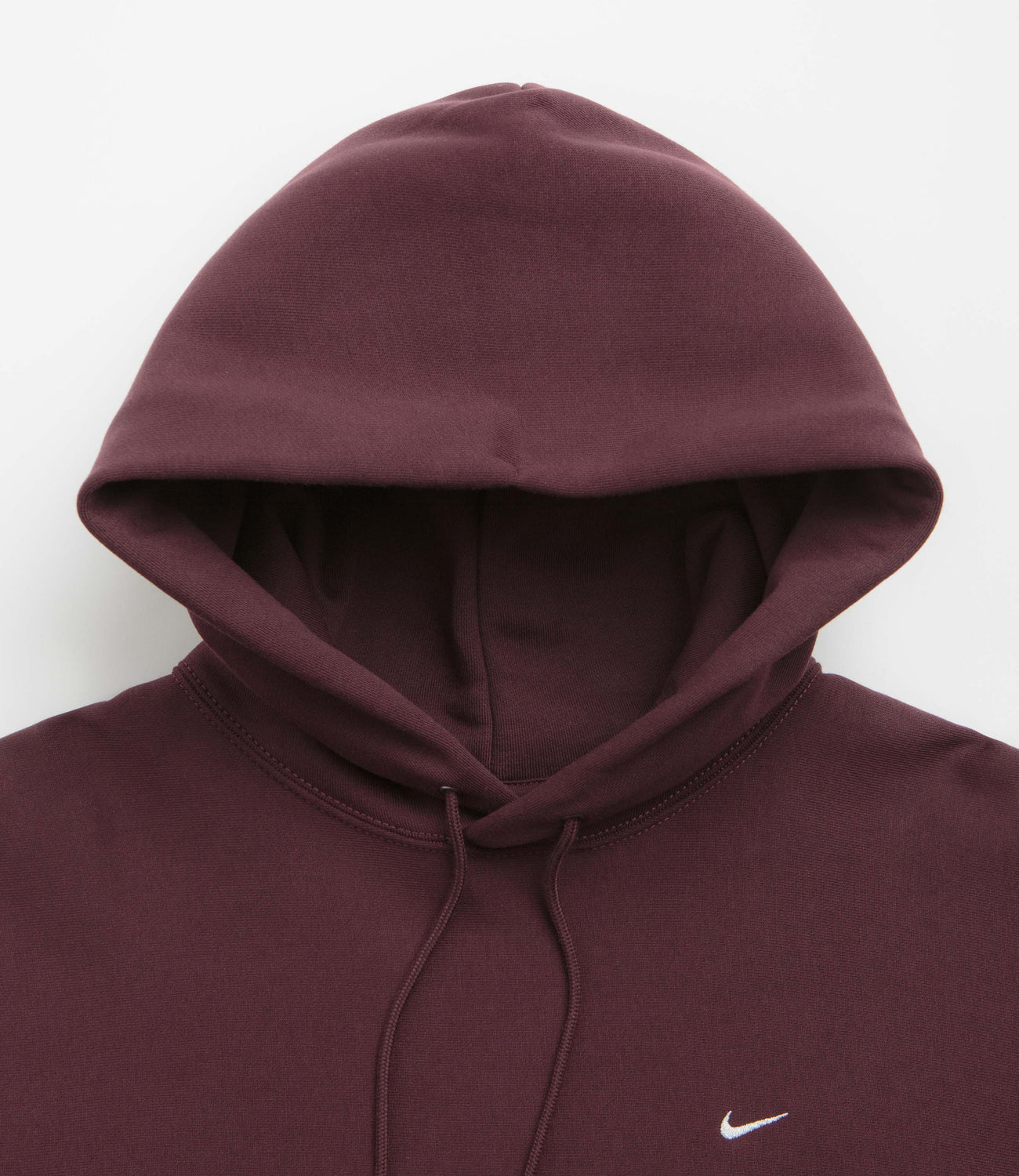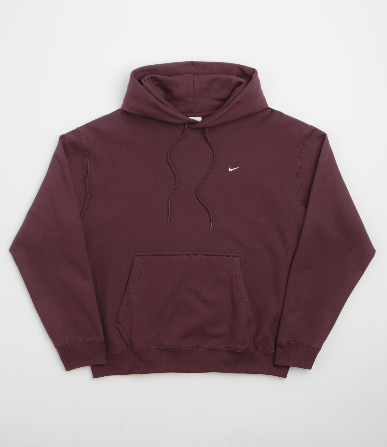 Nike Solo Swoosh Hoodie in Burgundy Crush and White. Loose fitting, this Nike hoodie is made from a heavyweight cotton-polyester blend. Featuring an adjustable lined hood and ribbed cuffs, this burgundy Nike hoodie is finished with a kangaroo front pocket, ribbed cuffs and embroidered branding.