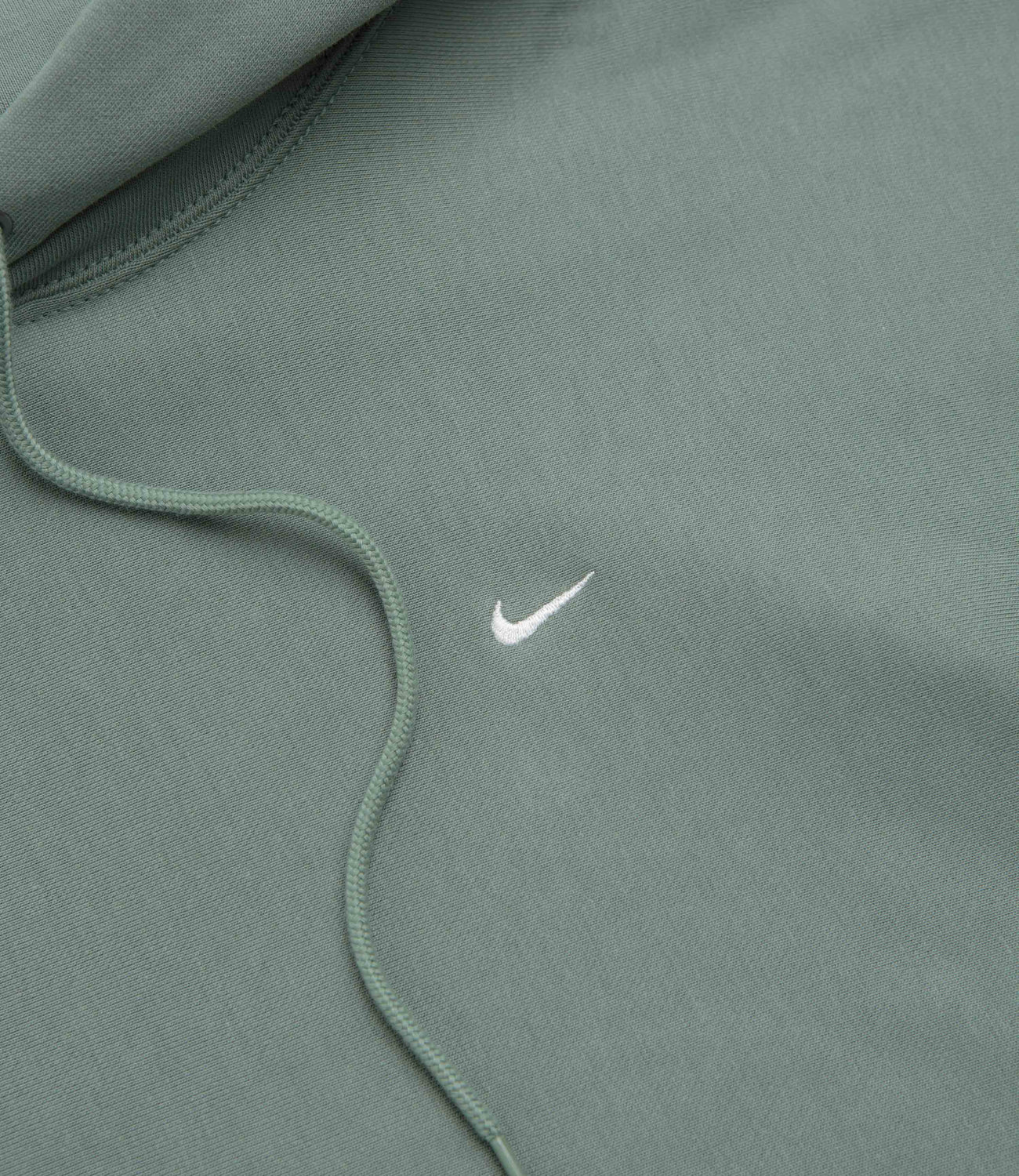 Nike Solo Swoosh Hoodie in Clay Green and White. Made from a heavyweight cotton-polyester blend, this Nike hoodie is designed with an adjustable lined hood. Featuring ribbed cuffs and a kangaroo front pocket, this clay green Nike hoodie is finished with embroidered logo branding.