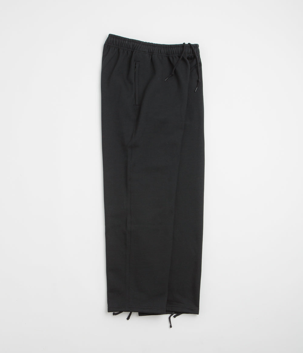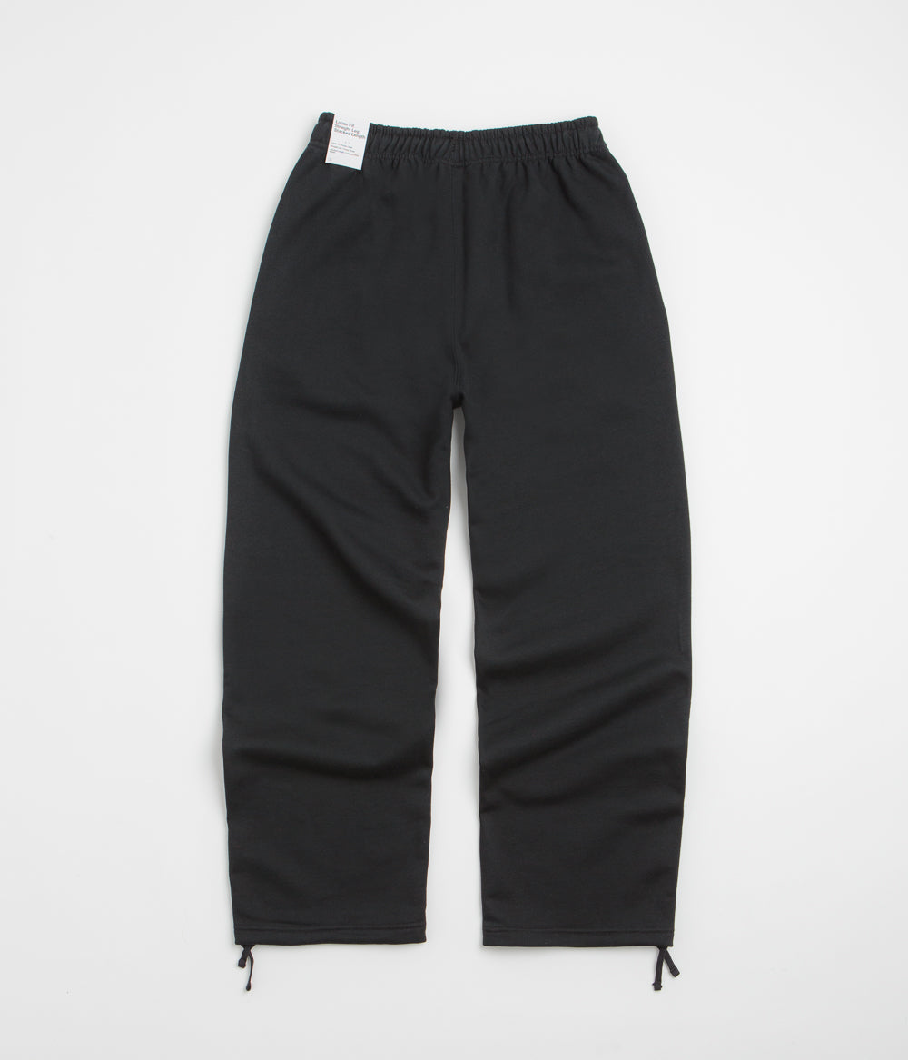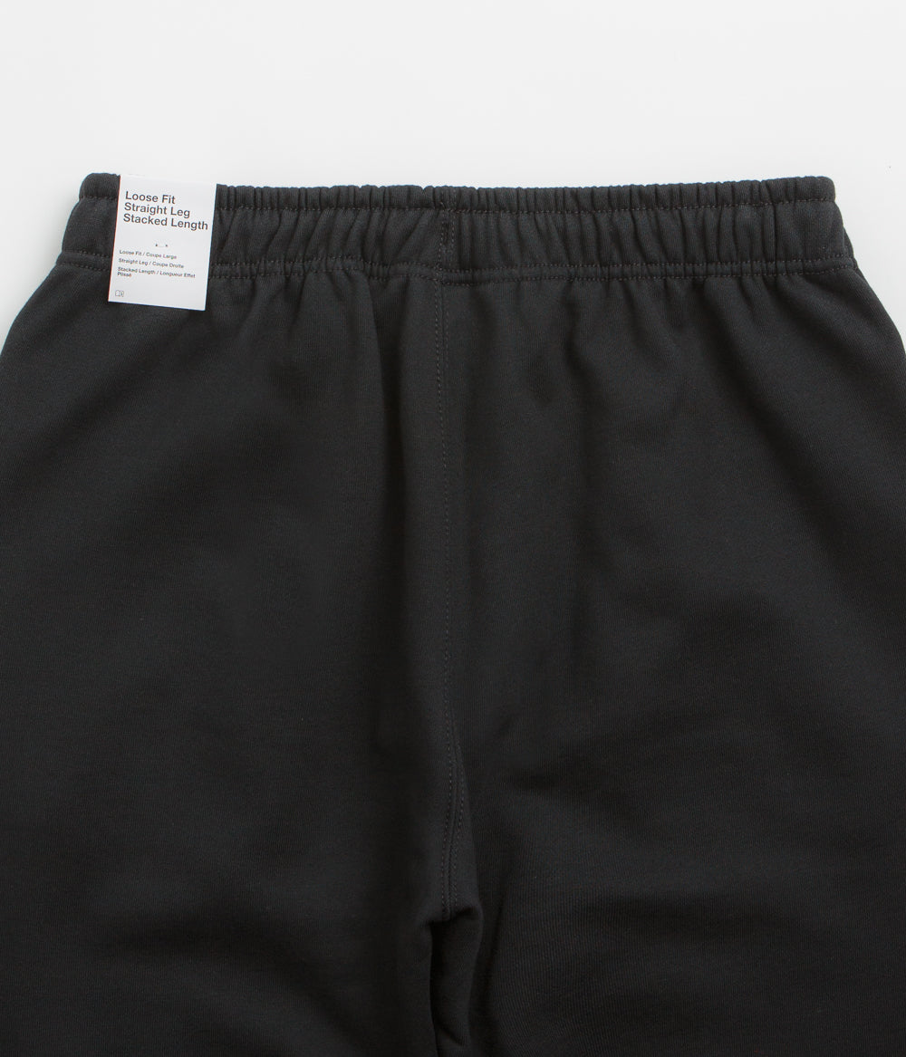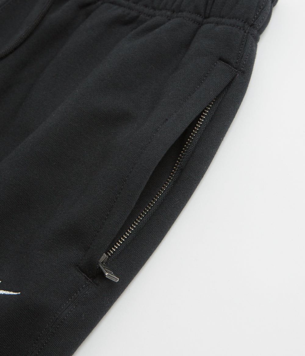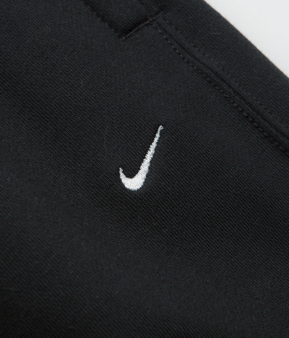 Nike Solo Swoosh Open Hem Sweatpants in Black and White. Regular fitting with a straight leg, these Nike sweatpants are made from a cotton-polyester blend. Featuring a brushed fleece inner, an elasticated waistband and two zippered side pockets, these black Nike sweatpants are finished with an open hem and embroidered branding.