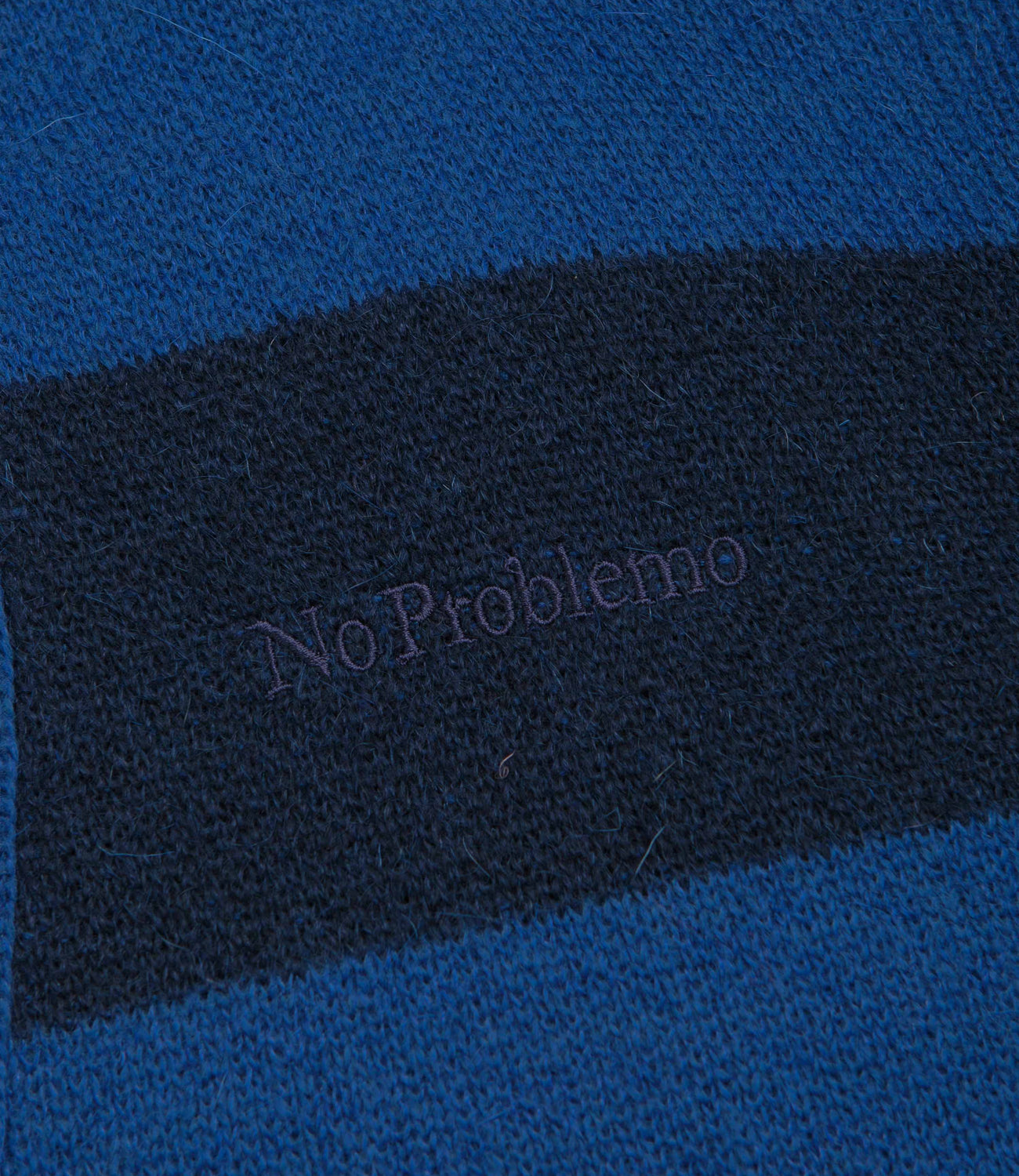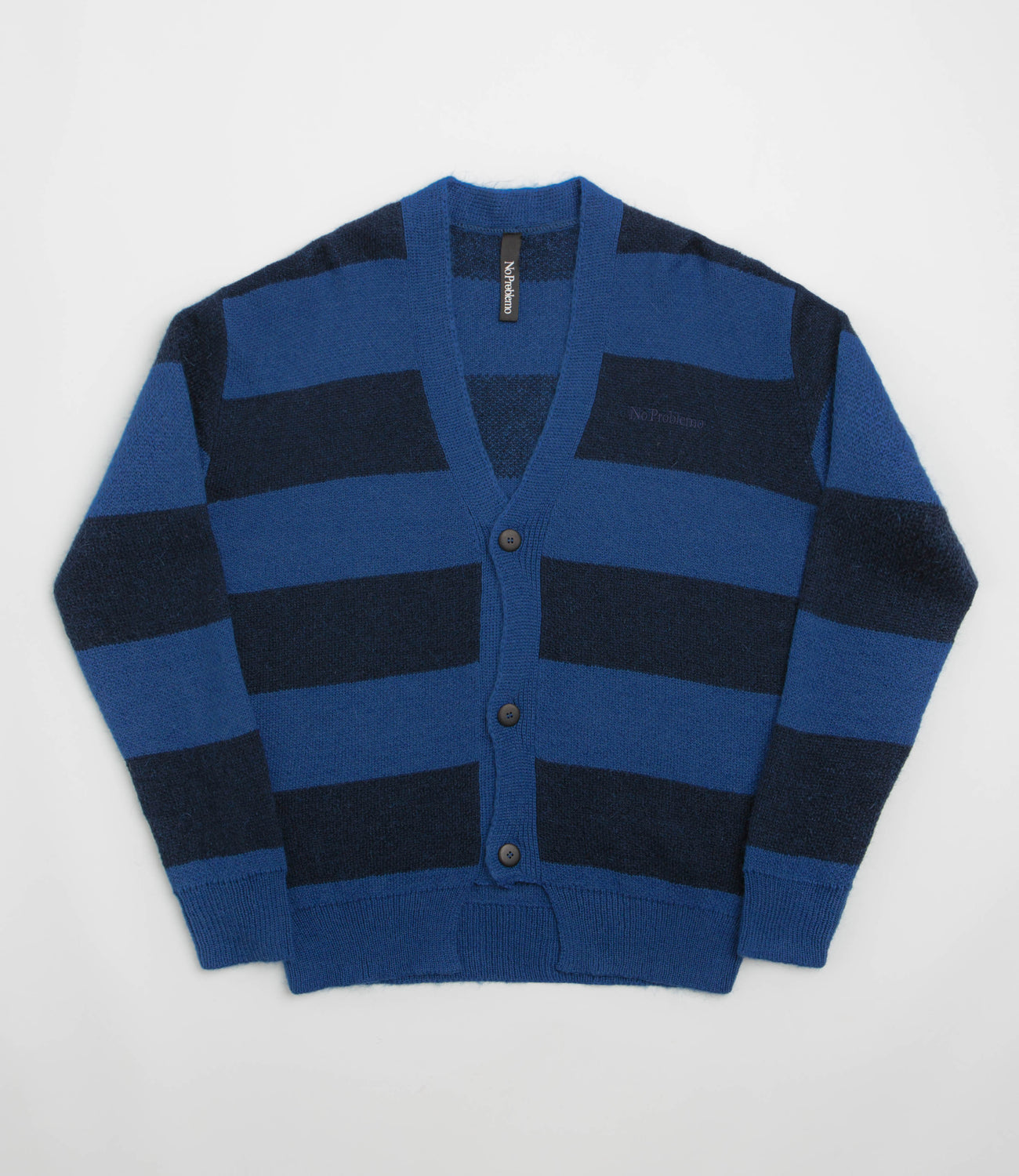 No Problemo Striped Mohair Oversized Cardigan in Blue Multi. Designed with a thick striped pattern, this oversized No Problemo cardigan is made from a polyacrylic-mohair blend. Featuring a V-neck collar and a full length button fastening, this blue striped No Problemo cardigan is finished with a recessed waistband, ribbed cuffs and with embroidered left chest branding.