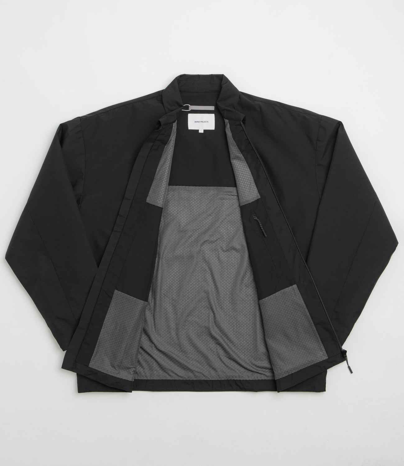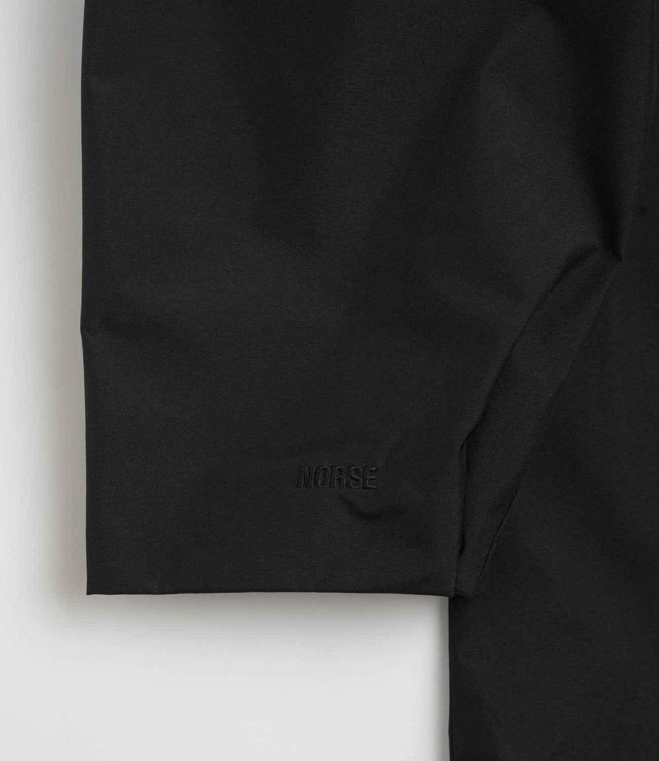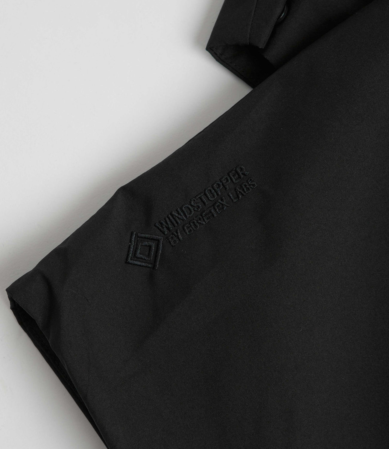 Norse Projects Sten Gore-Tex Windstopper Insulated Shirt Jacket in Black. Designed with Octa-Mesh® insulation and WINDSTOPPER® protection, this regular fitting Norse Projects shirt jacket is crafted from 100% recycled polyester. Featuring two zippered front pockets and a DWR coated shell, this black Norse Projects jacket is finished with printed left sleeve branding.