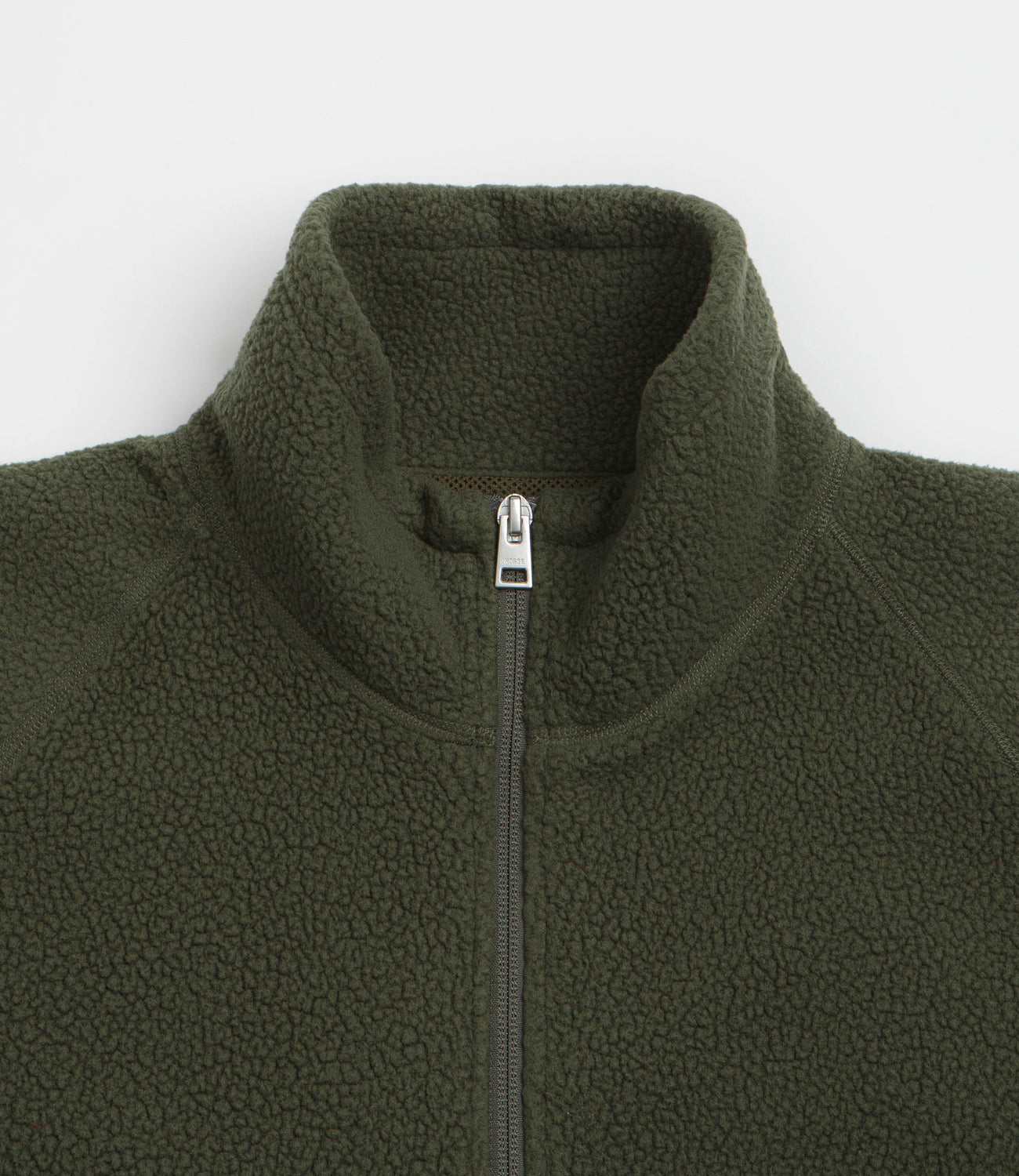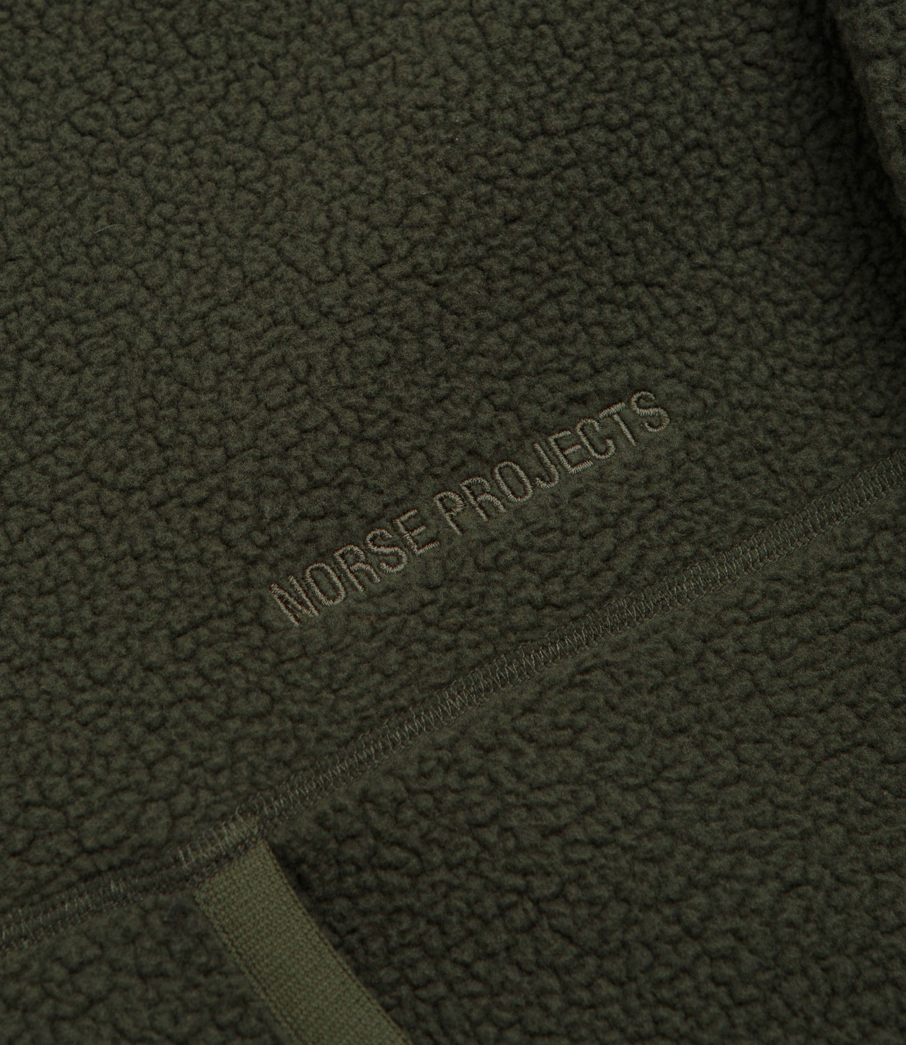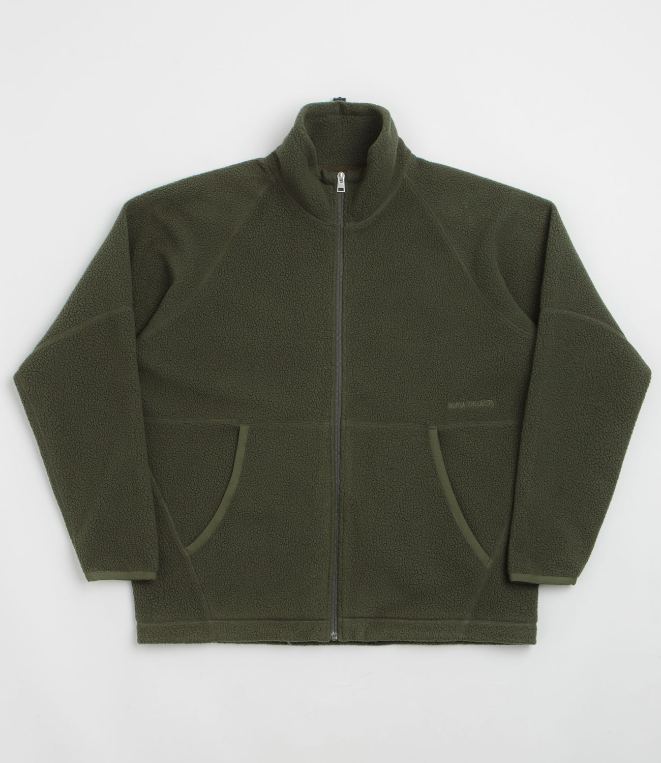 Norse Projects Tycho Pile Fleece Full Zip Jacket in Ivy Green. Tailored to a regular fitting from 100% recycled polyester, this mesh lined Norse Projects fleece jacket is designed with a full length zipper fastening and a toggle-cord collar. Featuring raglan sleeves, exposed stitched seams, elasticated cuffs and a toggle-cord hem, this green Norse Projects fleece is finished with two waist pockets and embroidered logo branding.
