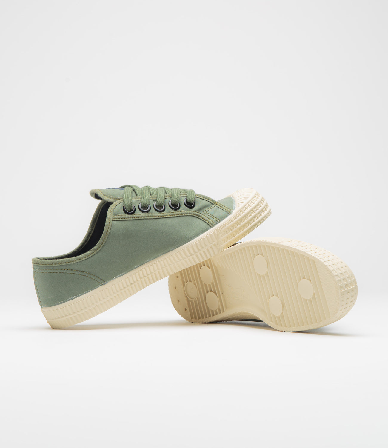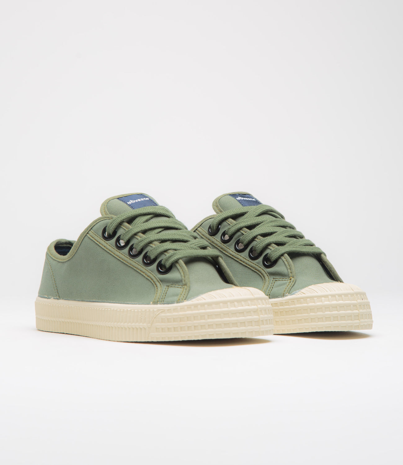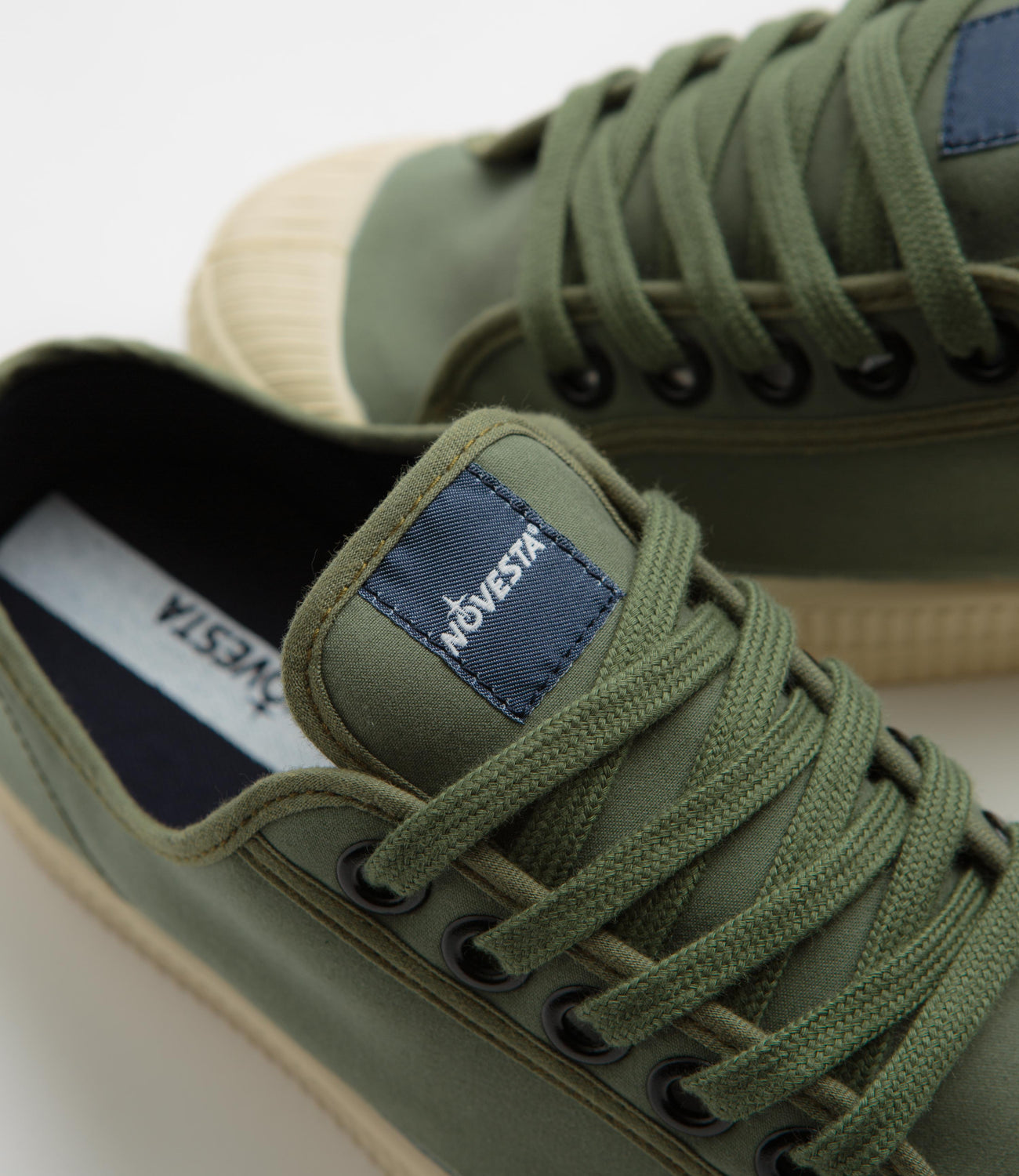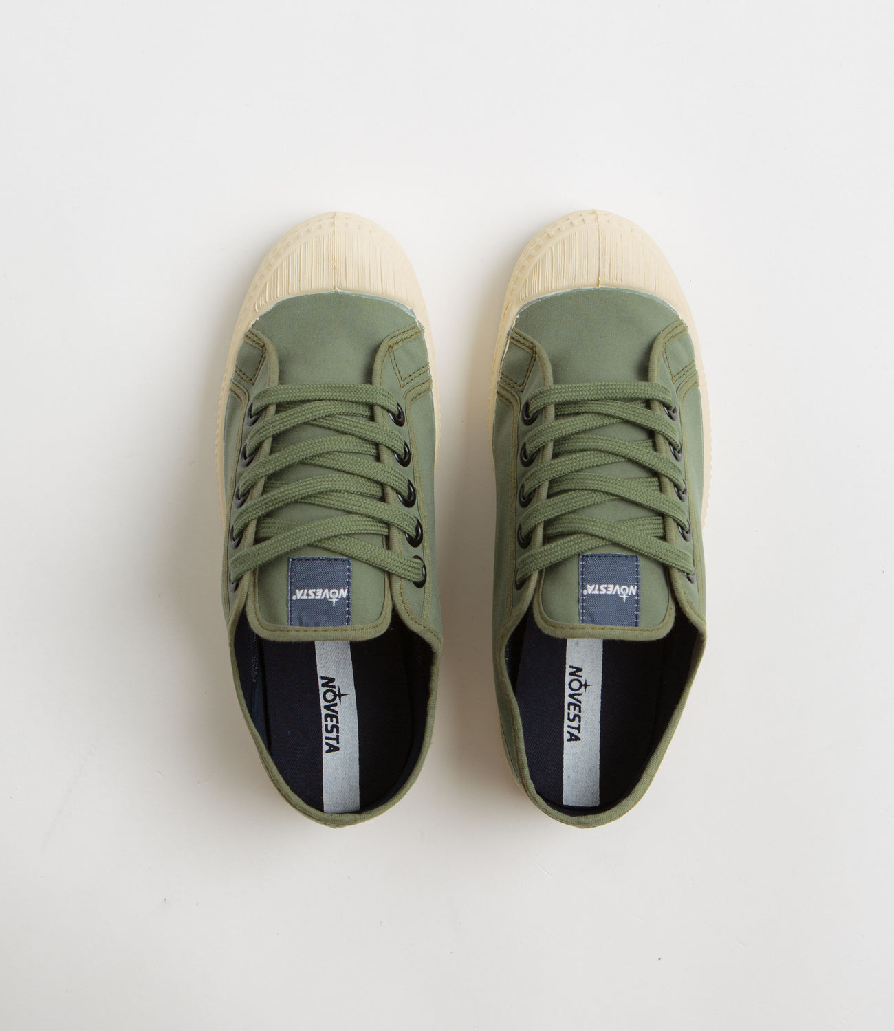 Novesta Star Master Wax Cotton Shoes in Sage. Designed with a waxed cotton upper and contrast stitching, this archive inspired Novesta Star Master also features metal eyelets and a reinforced rubber toe. Finished in sage green with a vulcanised construction, woven tongue labels and a pressed rubber outsole.