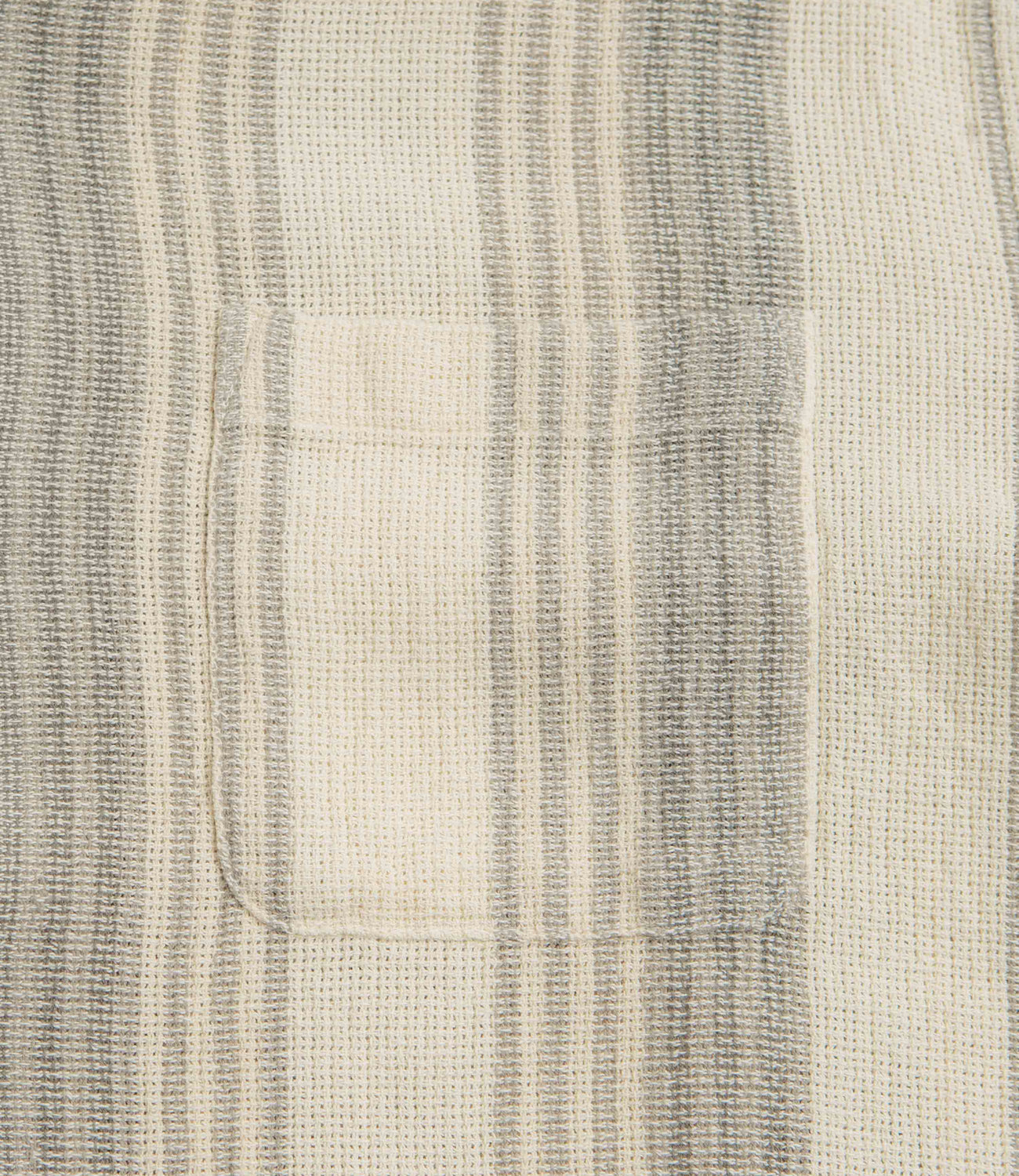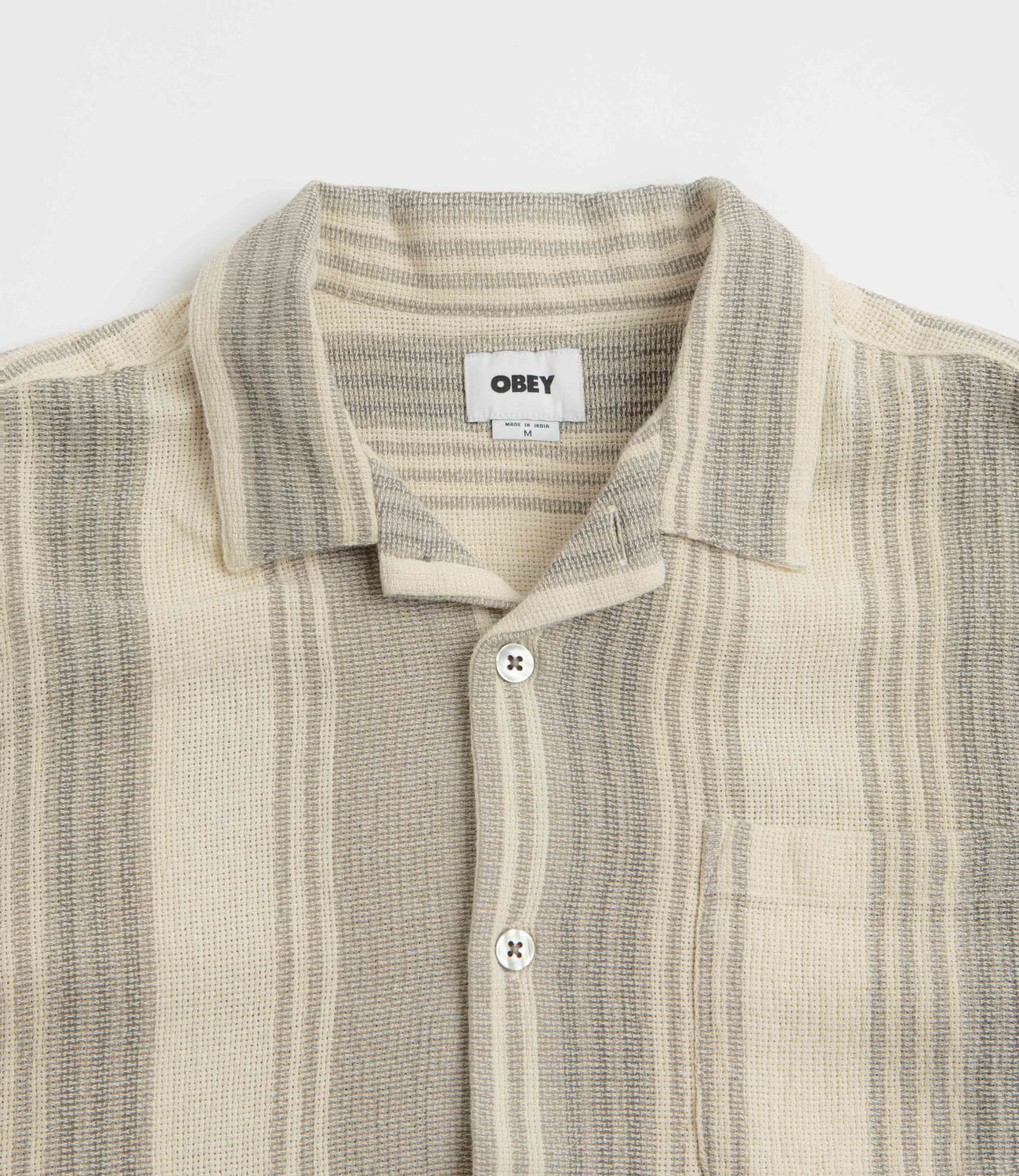 Obey Frazer Short Sleeve Shirt in Birch Multi. Relaxed fitting and made from 100% cotton, this woven Obey shirt is designed with an all-over striped pattern. Finished in khaki beige with a camp collar, a full length button fastening, a single chest pocket and woven flag label branding.