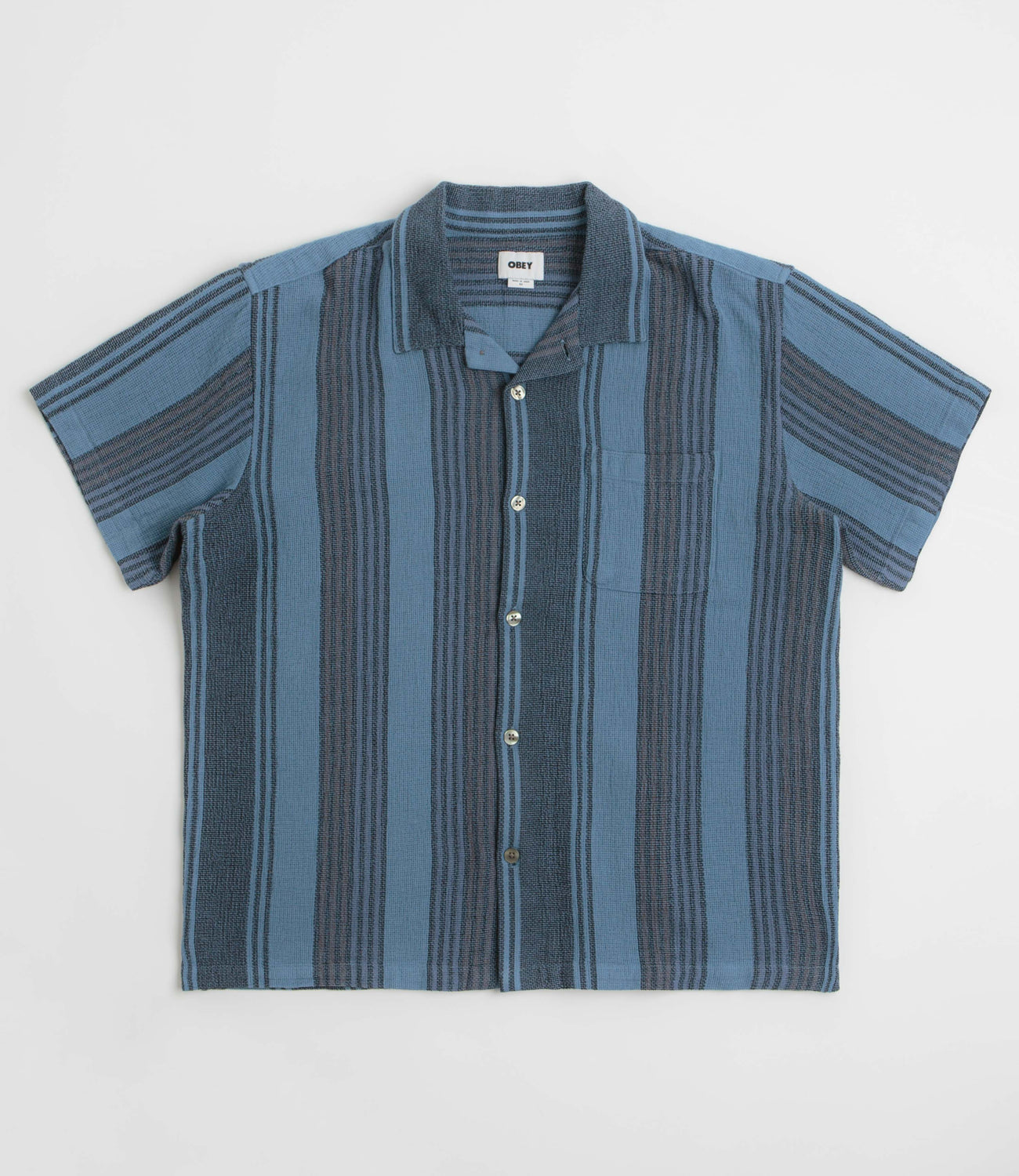 Obey Frazer Short Sleeve Shirt in Black Multi. Designed with an all-over woven stripe, this relaxed fitting Obey shirt is made from 100% cotton. Featuring a camp collar, a full length button fastening and a single chest pocket, this black Obey shirt is finished with woven flag label branding.