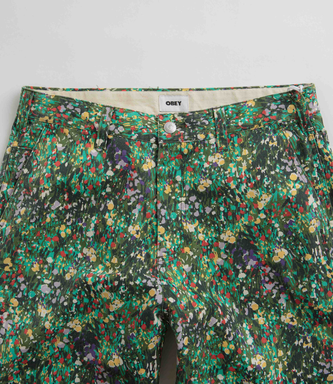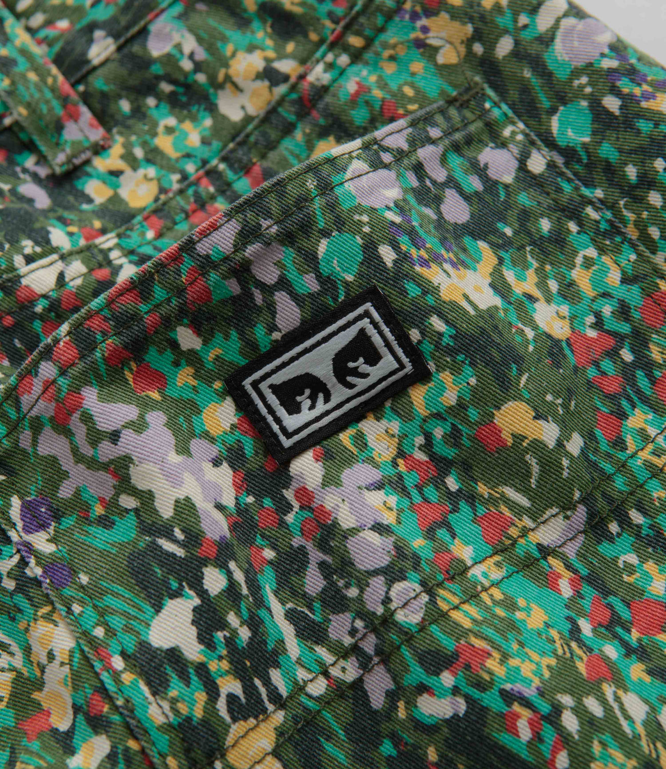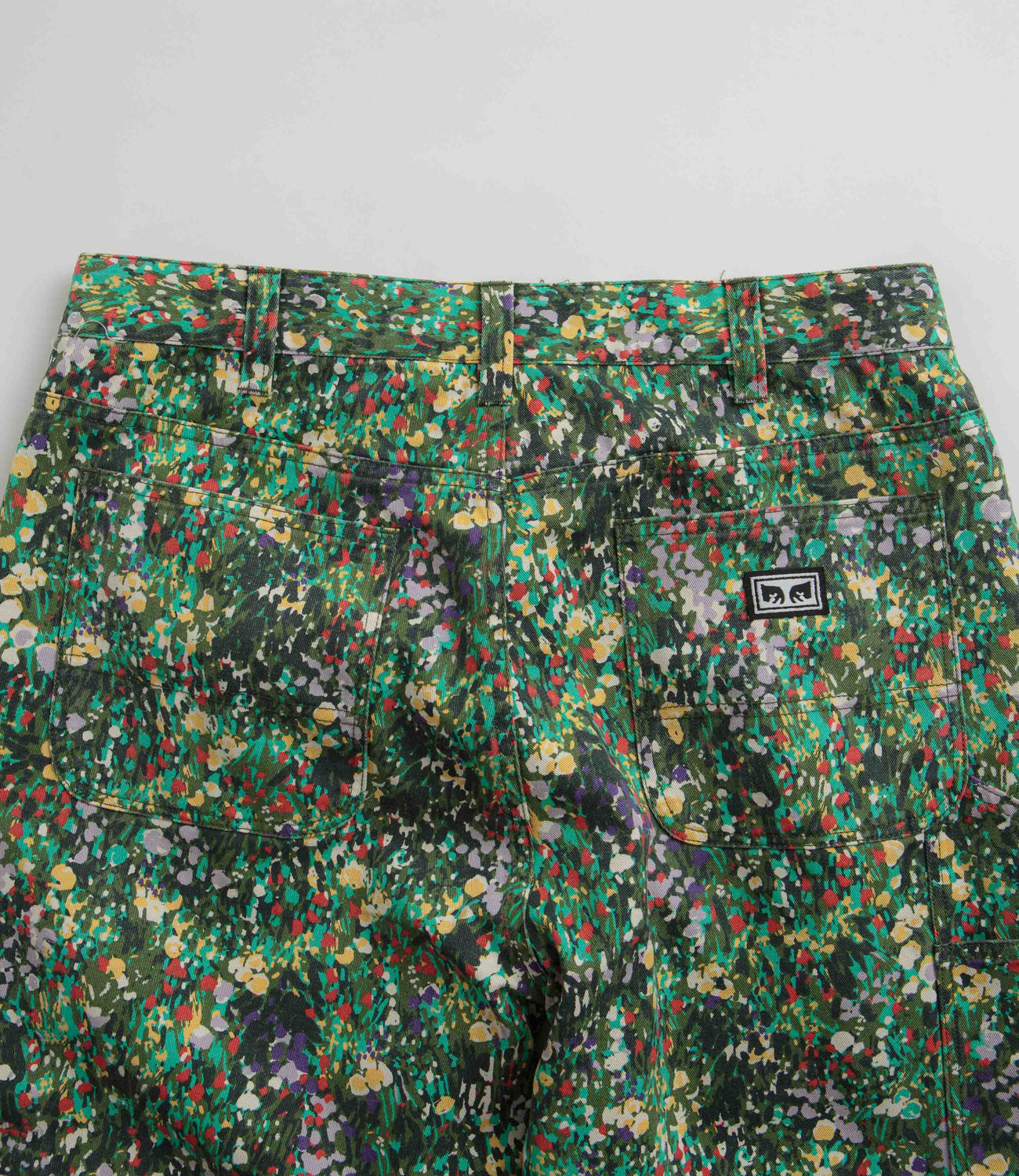 Obey Hardwork Carpenter Pants in Floral Multi. Designed with an all-over pattern, these regular fitting Obey pants are styled with a straight leg and an 18” inseam. Featuring a belt loop waist, a shank-button closure and a zippered fly, these green floral Obey pants are finished with four classic pockets, additional carpenter pockets and with woven flag label branding.