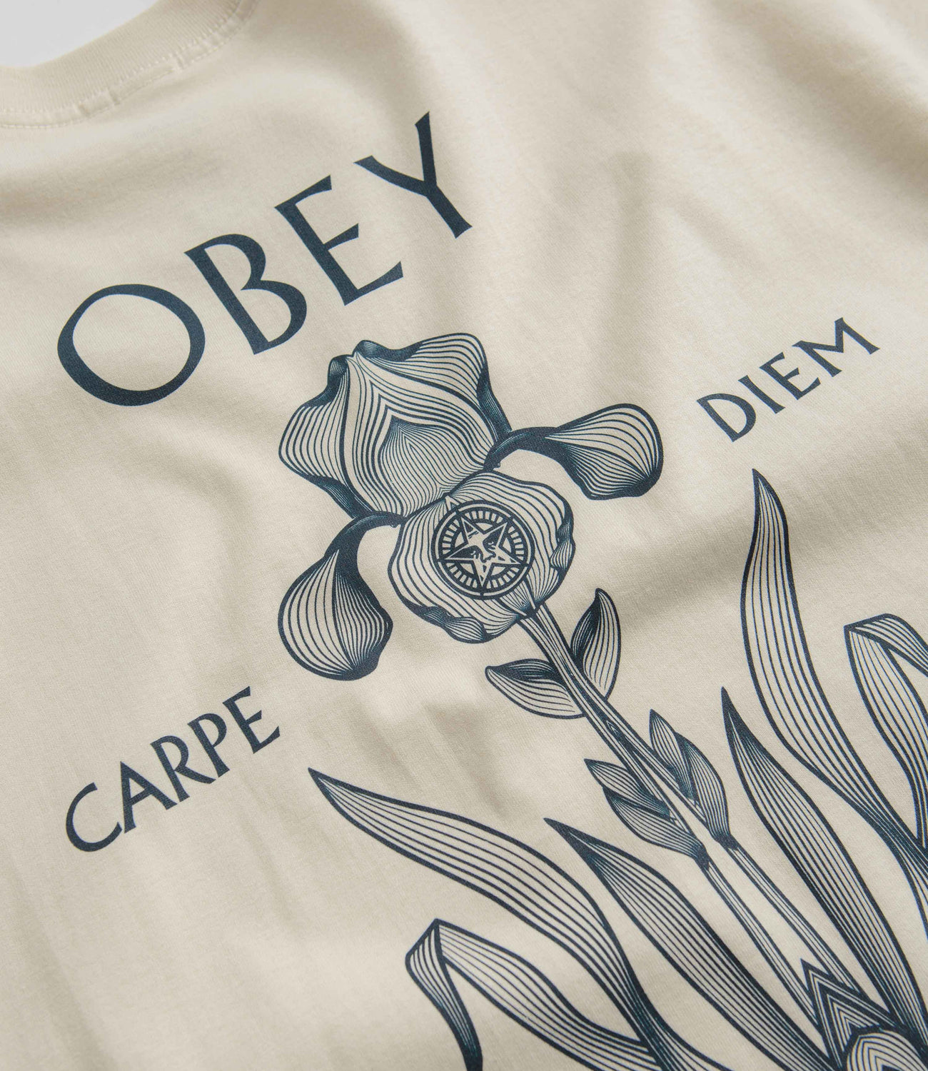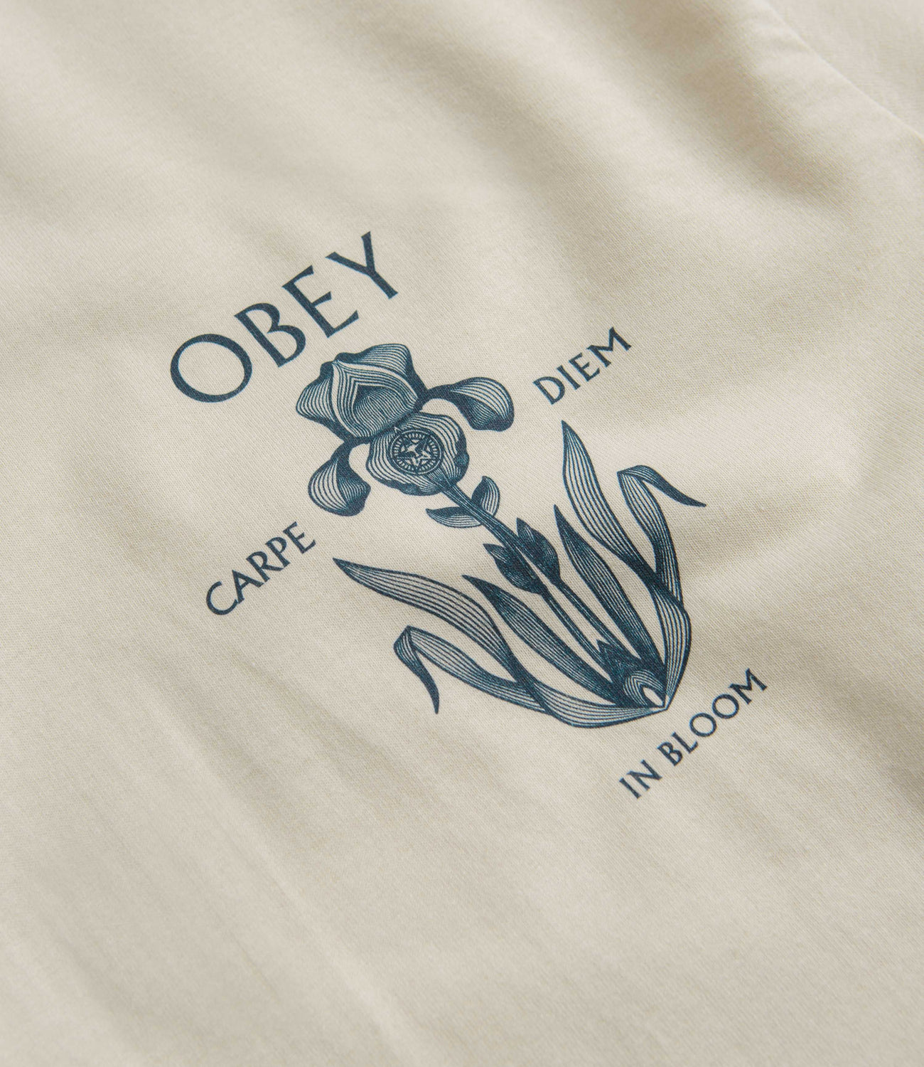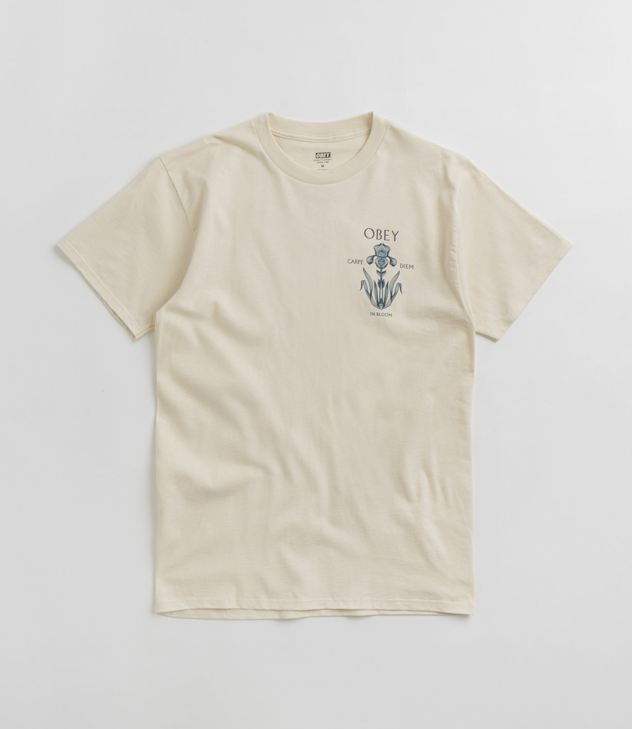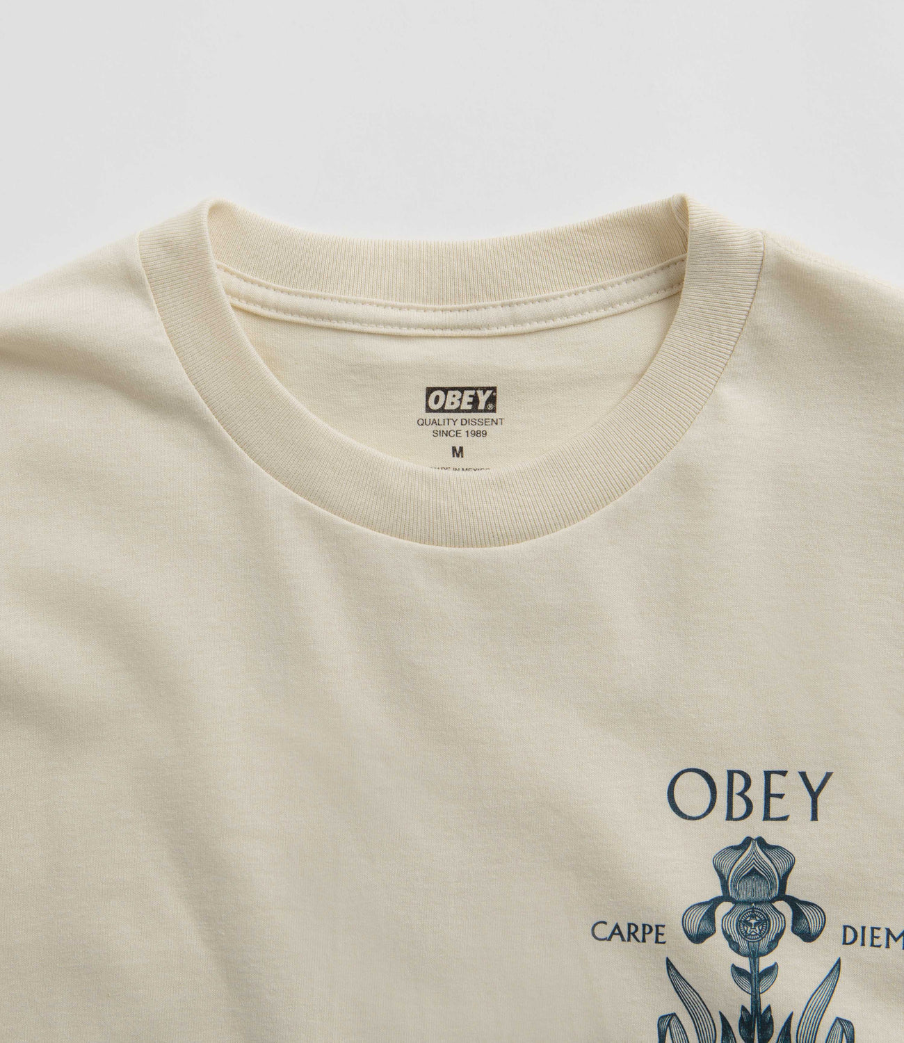 Obey Iris In Bloom T-Shirt in Cream. Regular fitting and made from 100% cotton, this block tone Obey t-shirt arrives as part of the brand’s latest release. Featuring a classic crew collar and a straight cut hem, this beige Obey t-shirt is finished with printed front and rear floral graphics.