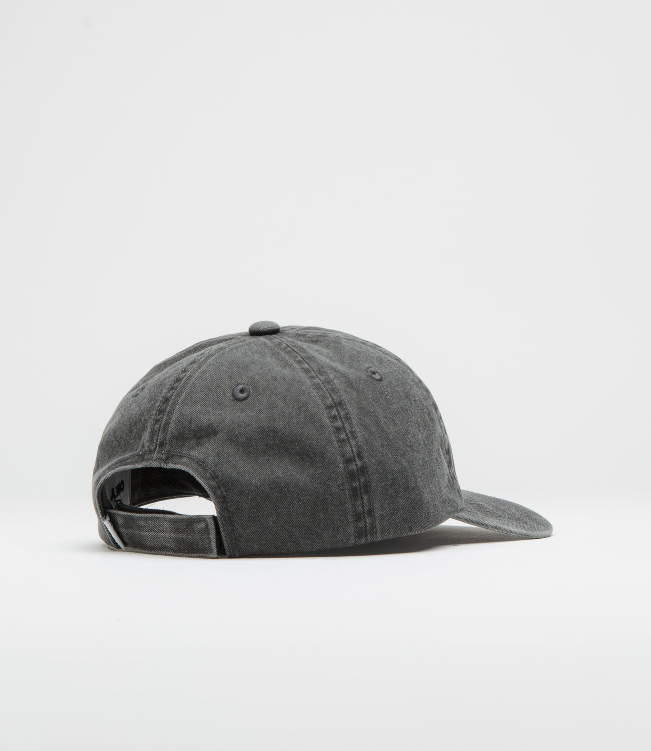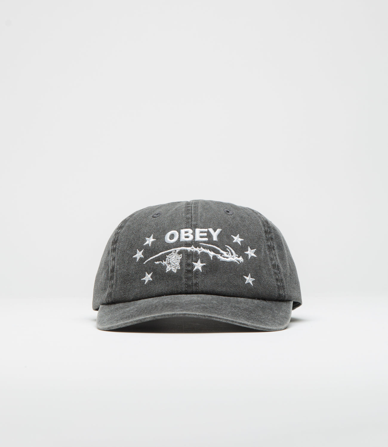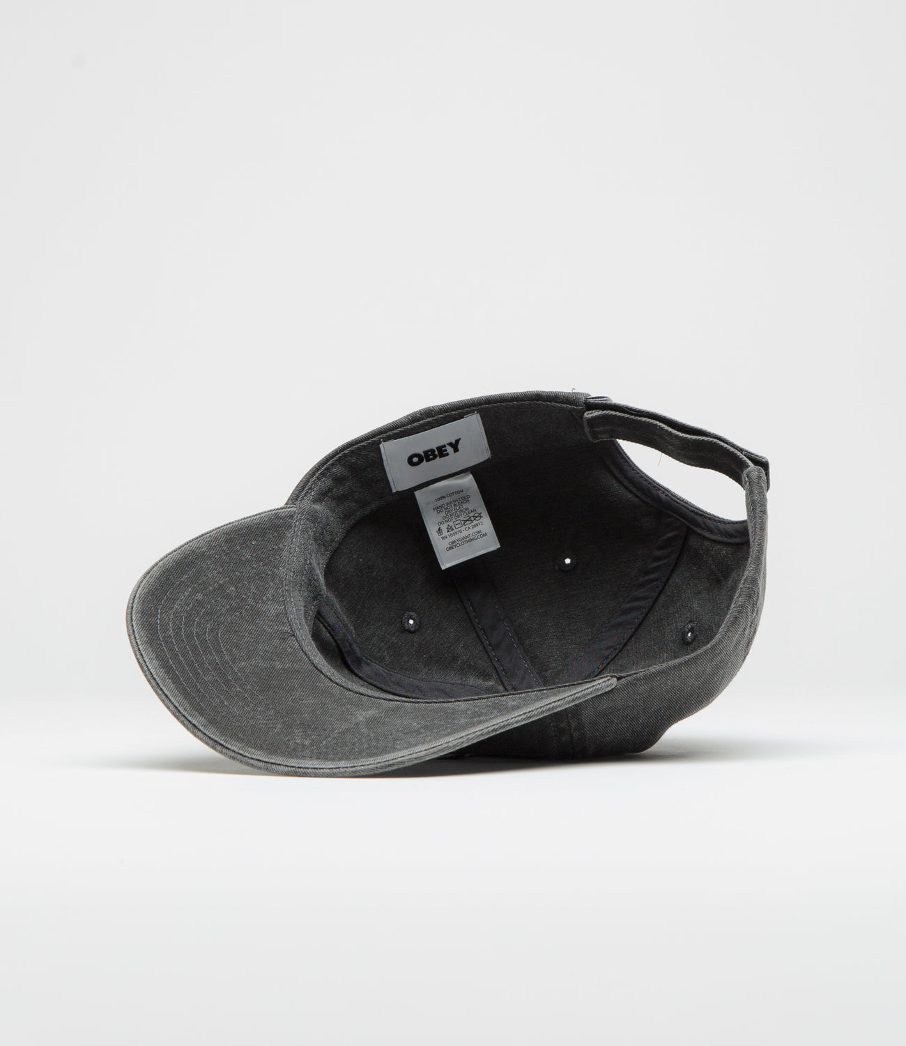 Obey Penn Pigment Cap in Pigment Black. Single sized and pigment dyed, this six panel Obey cap is made from 100% cotton. Featuring a curved peak and embroidered eyelets, this black Obey cap is finished with an adjustable rear fastening and embroidered detailing.