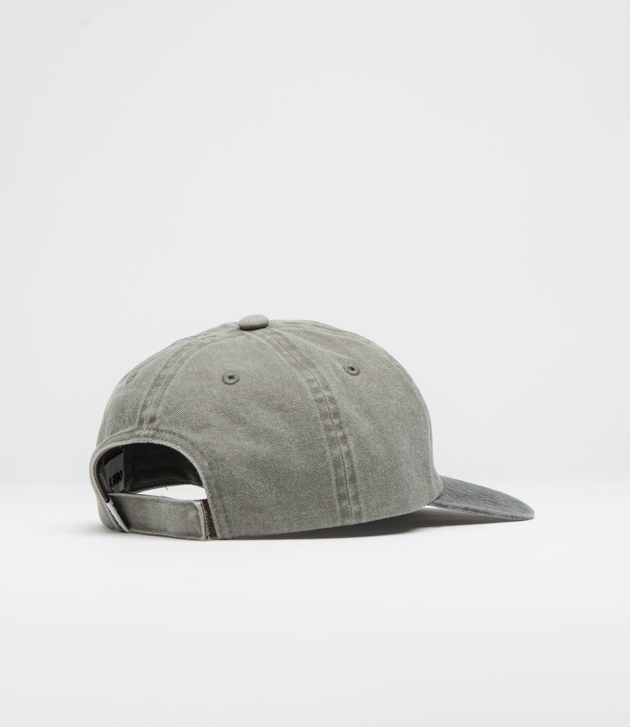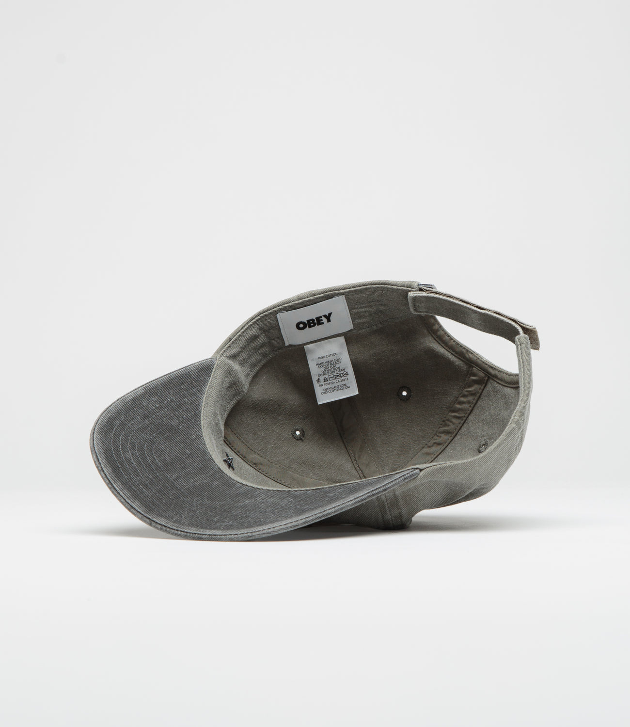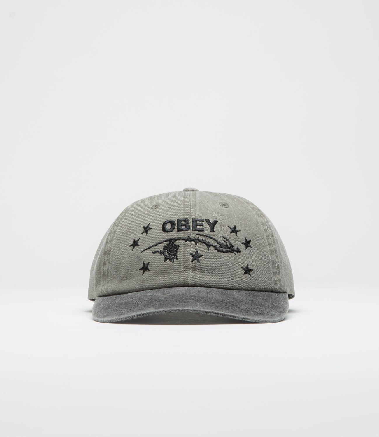 Obey Penn Pigment Cap in Pigment Olive Multi. Pigment dyed and single sized, this Obey cap is made from 100% cotton. Featuring a six panel profile, embroidered eyelets and an adjustable rear fastening, this olive khaki Obey cap is finished with an embroidered graphic.