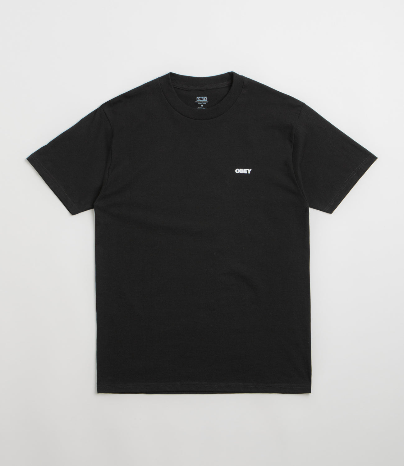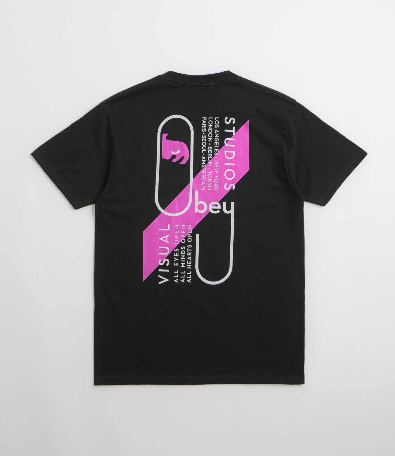Obey Visual Studios T-Shirt in Black. Made from 100% cotton, this colour block Obey t-shirt is designed with a classic crew collar. Finished in black with a straight hem and printed front and rear graphics.