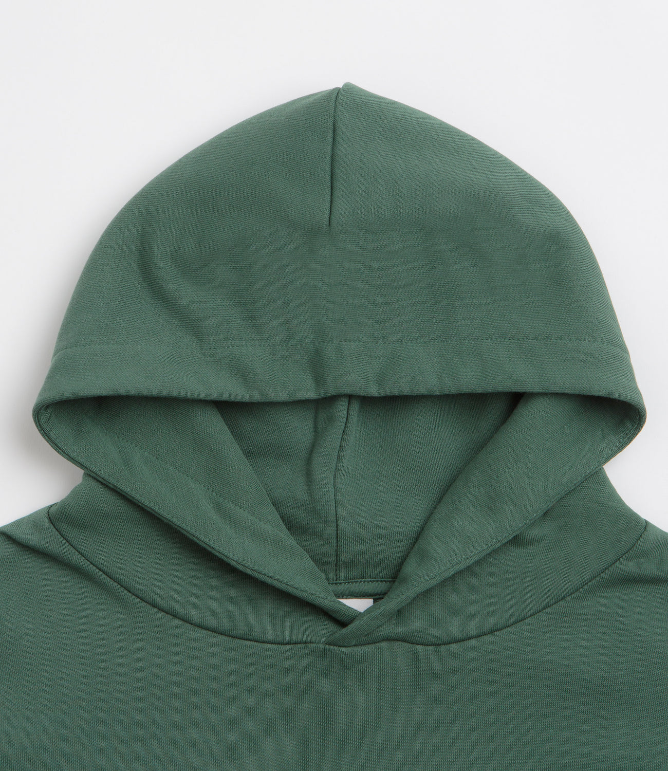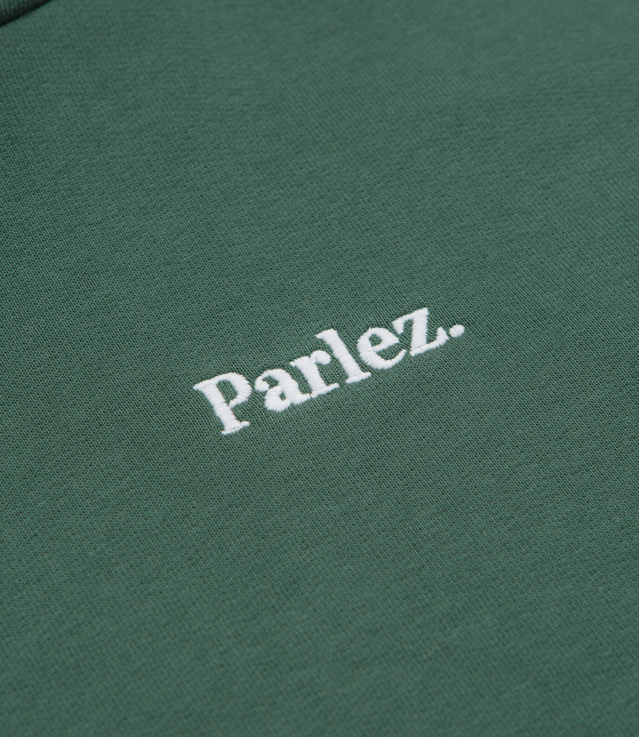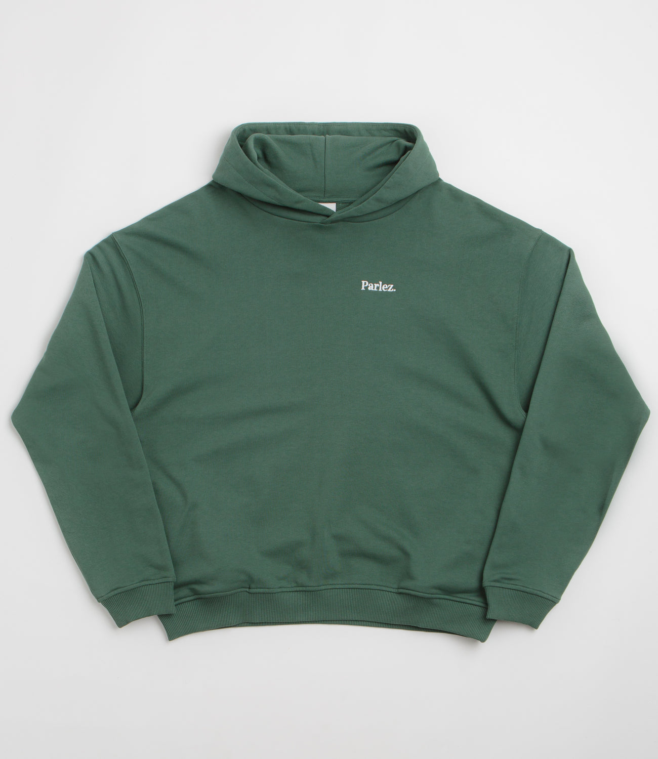 Parlez Amos Hoodie in Kelp Green. Oversized and made from 100% organic cotton, this block tone Parlez hoodie is designed with a split panel hood and ribbed cuffs. Finished in green with tonal stitched seams and embroidered logo branding.