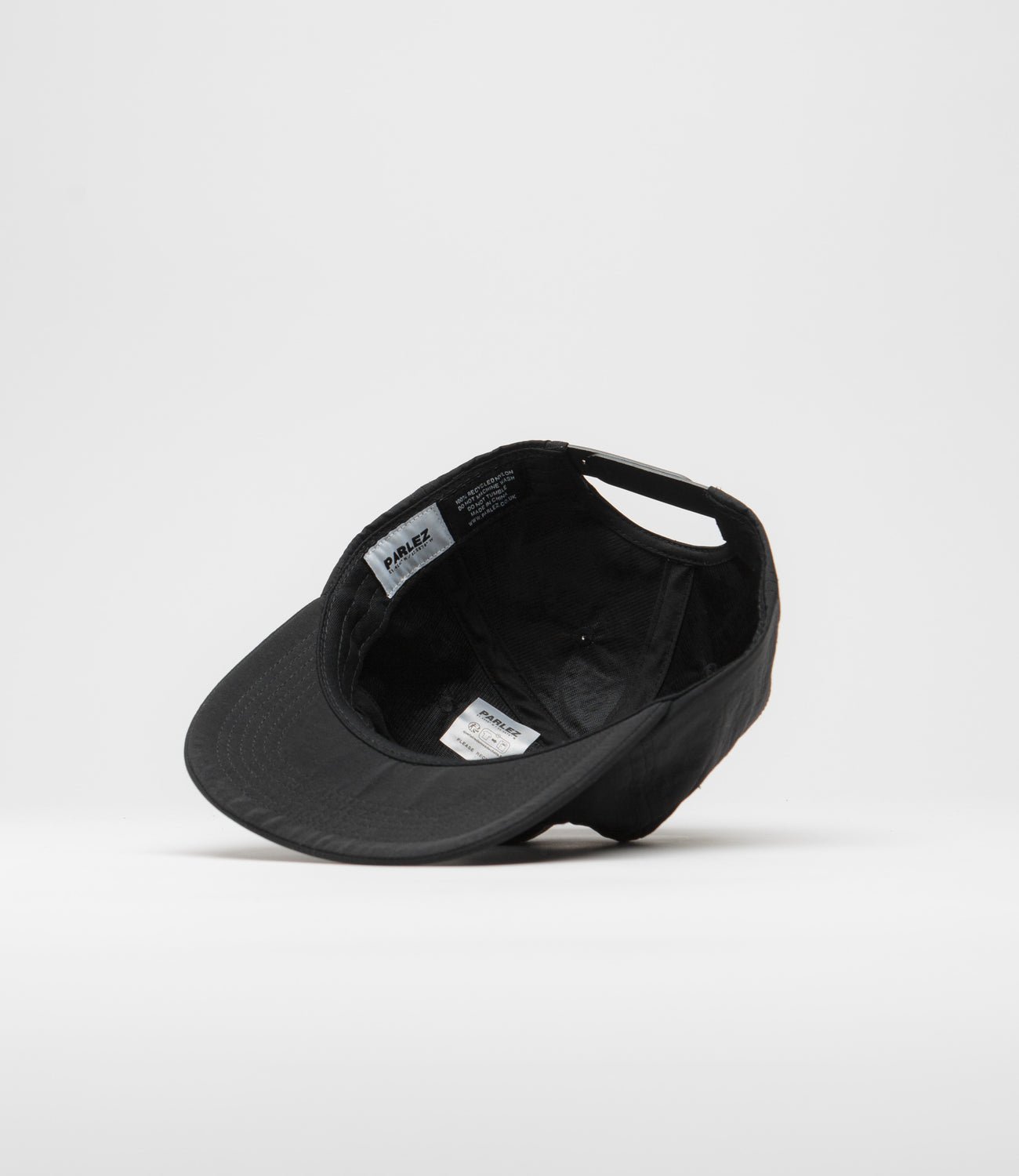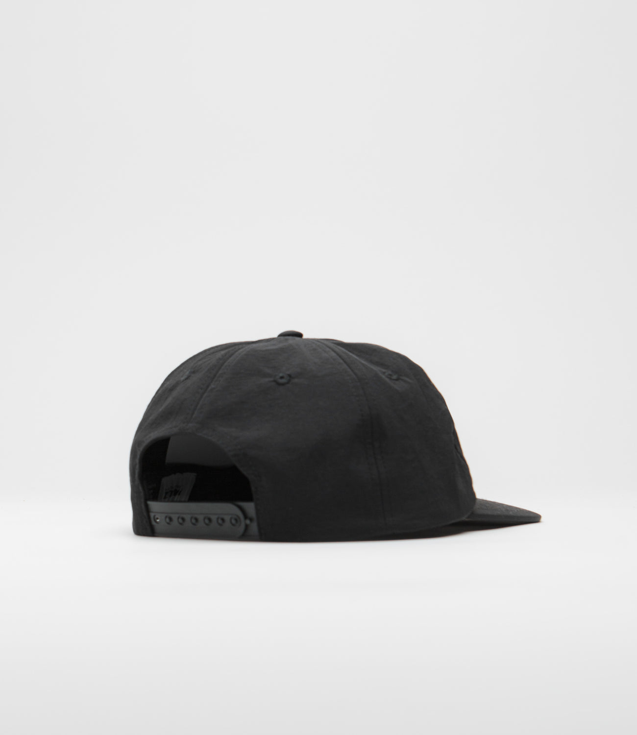 Parlez Areca Cap in Black. Made from 100% organic cotton and single sized, this six panel Parlez cap is designed with embroidered airflow eyelets. Featuring a slightly curved peak and an adjustable snapback rear fastening, this black Parlez cap is finished with an embroidered crown graphic.