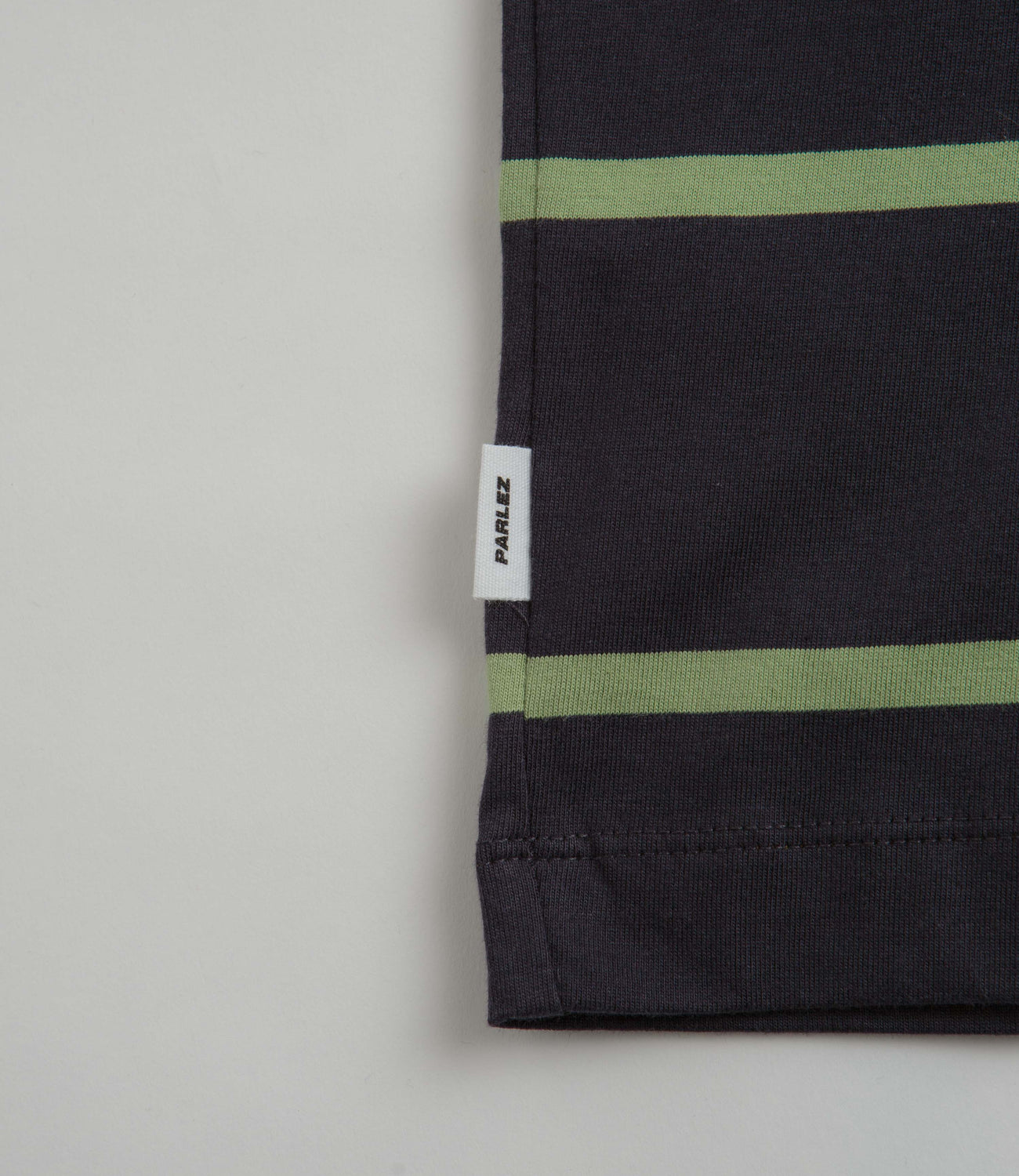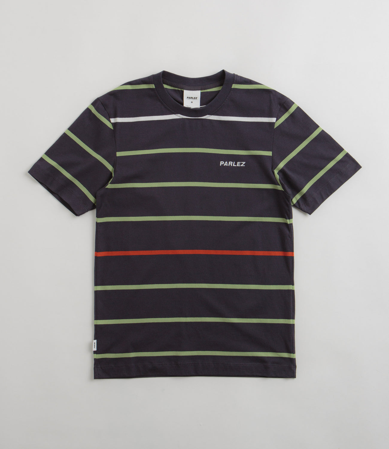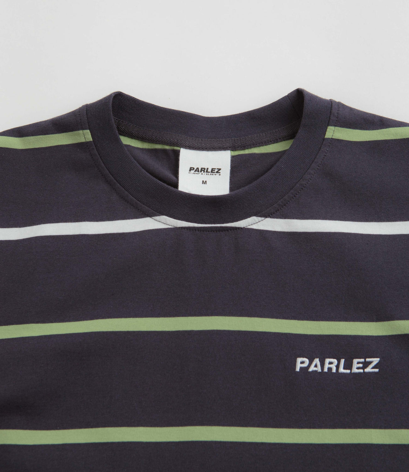 Parlez Element Stripe T-Shirt in Navy. Tailored to a regular fitting from 100% BCI cotton, this new season Parlez t-shirt is designed with a flexible crew collar and a reinforced hem. Finished in a shade of navy with all-over stripes and embroidered left chest branding.