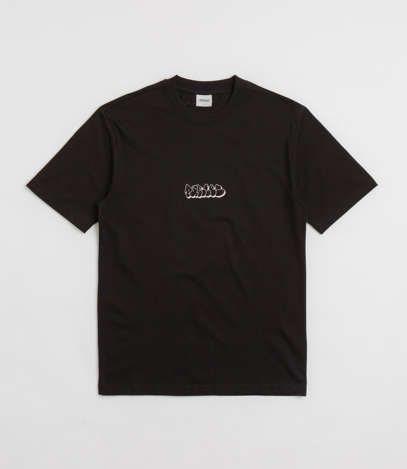 Parlez Lynwood T-Shirt in Black. Made from 100% organic cotton, this block tone Parlez t-shirt is designed with a classic crew collar and a reinforced hem. Finished in a shade of black with screen printed graphics and with a woven side seam label.