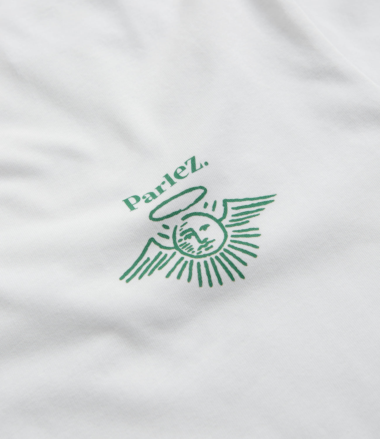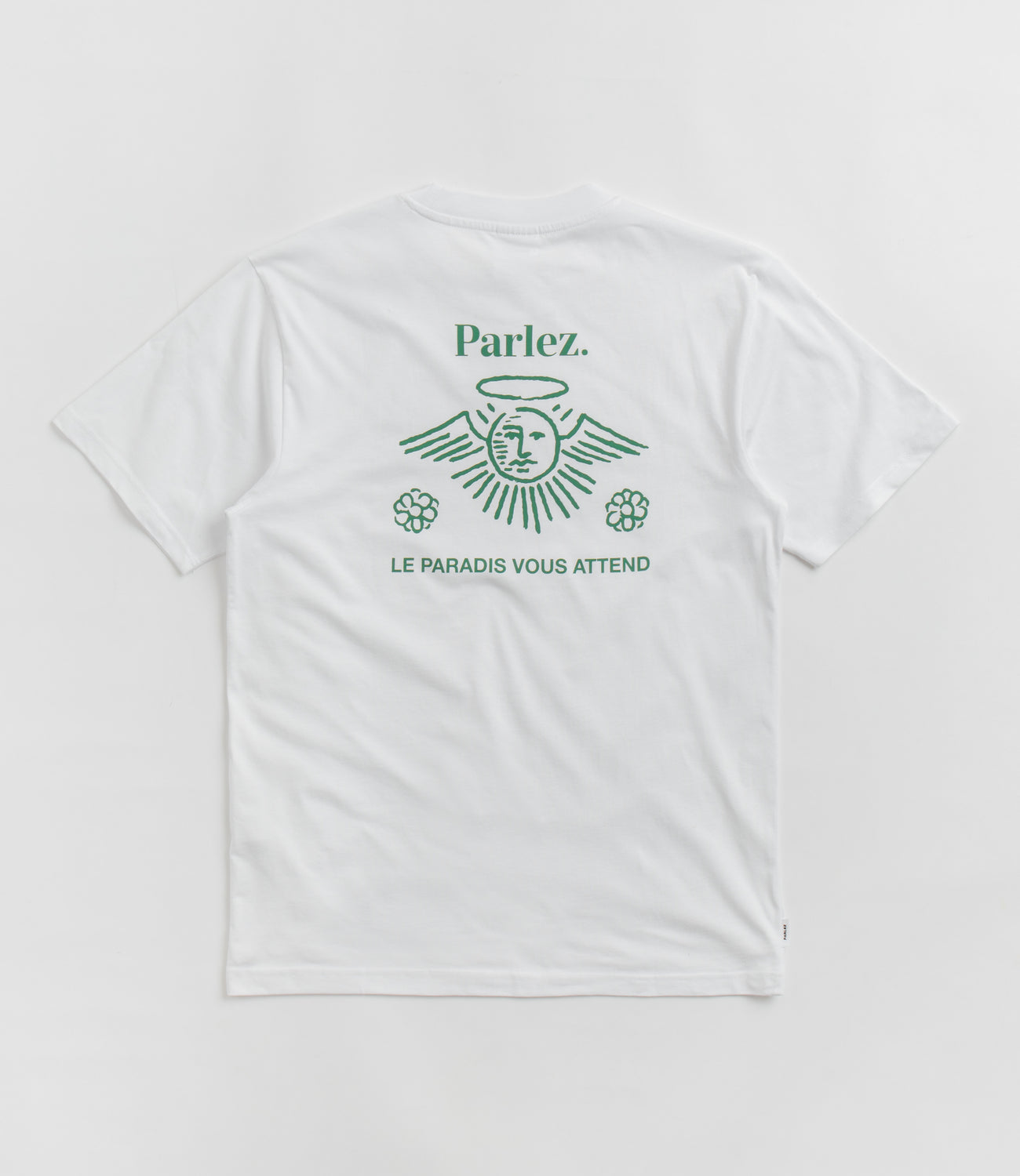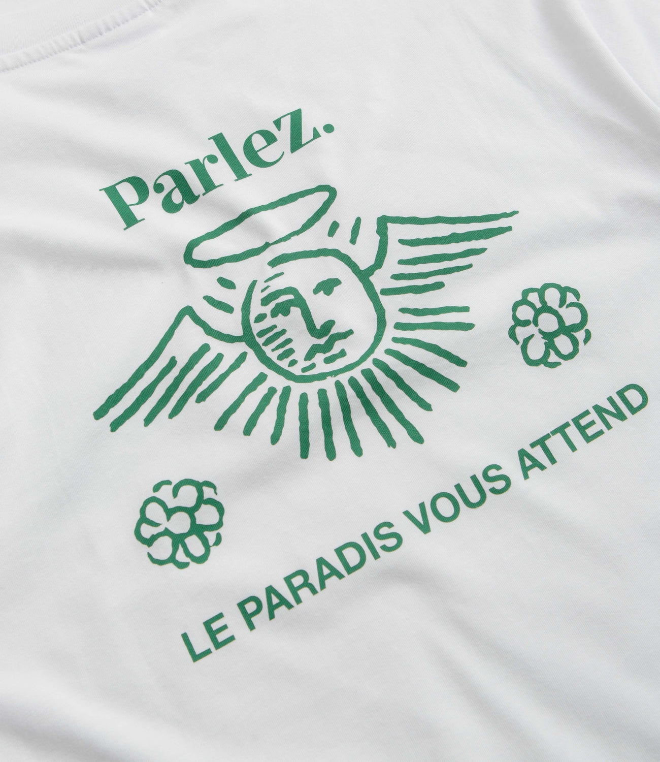 Parlez Paradis T-Shirt in White. Part of the brand’s latest release, this regular fitting Parlez t-shirt is made from 100% organic cotton. GOTS certified with a flexible rib knit collar and a reinforced hem, this white Parlez t-shirt is finished with printed front and rear graphics.