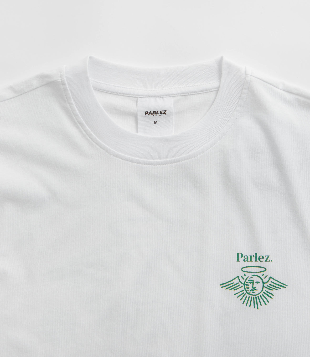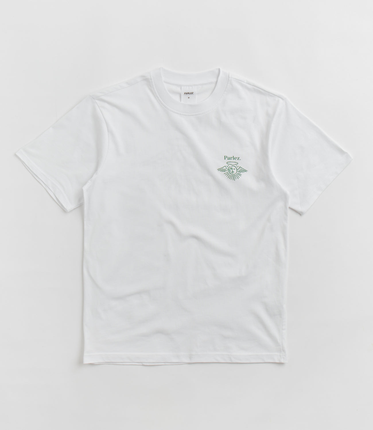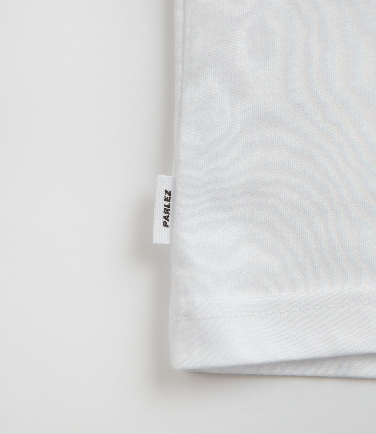 Parlez Paradis T-Shirt in White. Part of the brand’s latest release, this regular fitting Parlez t-shirt is made from 100% organic cotton. GOTS certified with a flexible rib knit collar and a reinforced hem, this white Parlez t-shirt is finished with printed front and rear graphics.