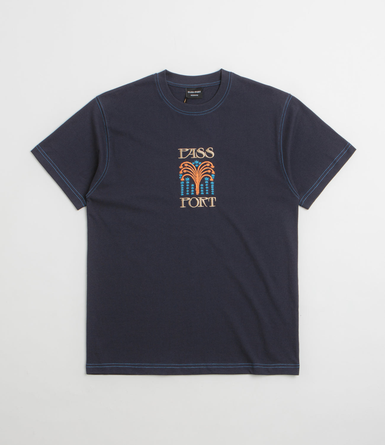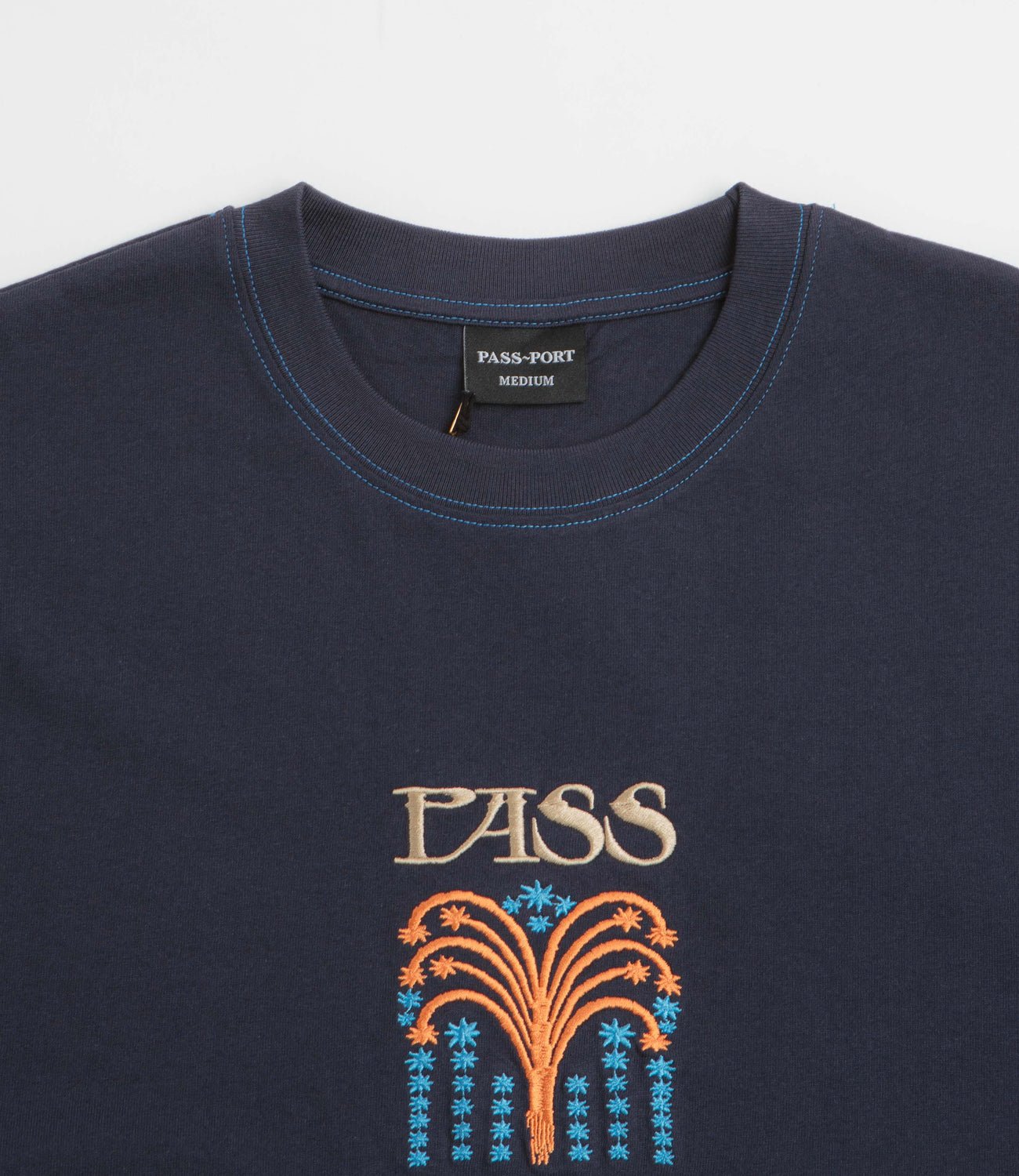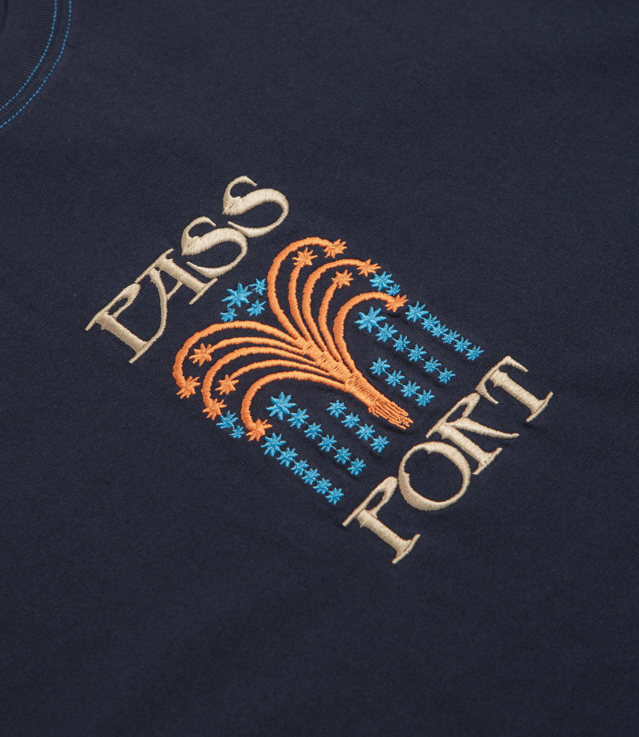 Pass Port Roman Candle T-Shirt in Navy. Regular fitting and made from 100% cotton, this block tone Pass Port t-shirt is designed with a classic crew collar and contrast stitching. Finished in navy with an embroidered centre chest graphic.
