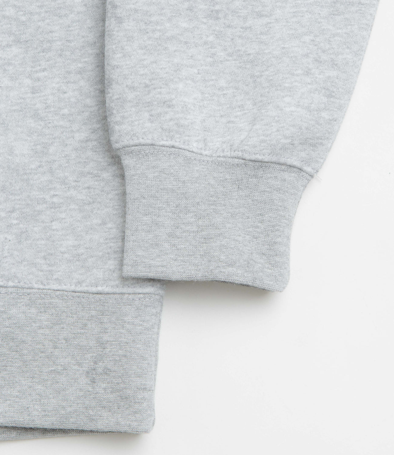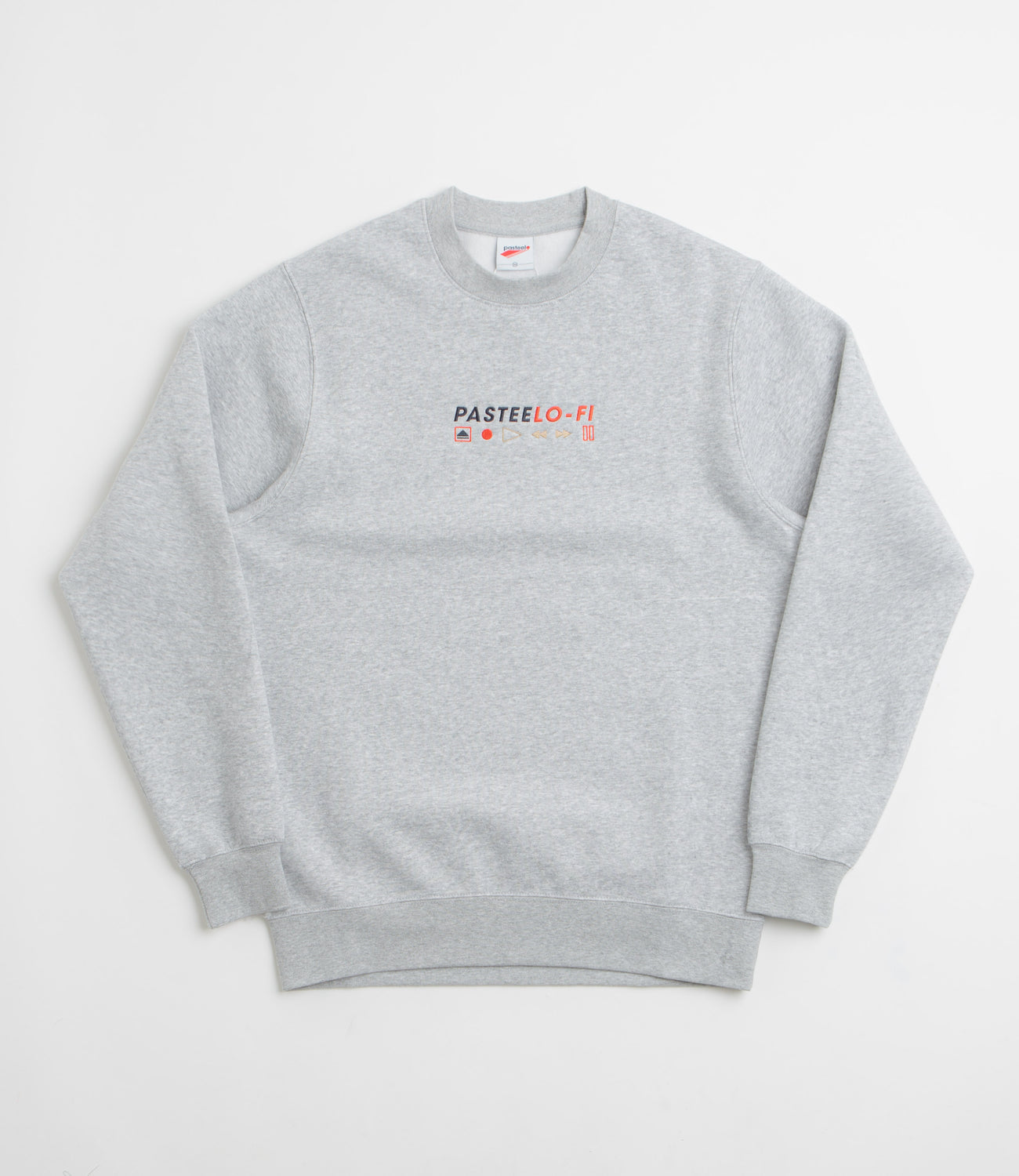 Pasteelo Lo-Fi Crewneck Sweatshirt in Heather Grey. Made from a cotton-polyester blend, this block tone Pasteelo sweatshirt is designed with a classic crew collar and ribbed cuffs. Finished in grey with a woven elastic hem and an embroidered chest graphic.