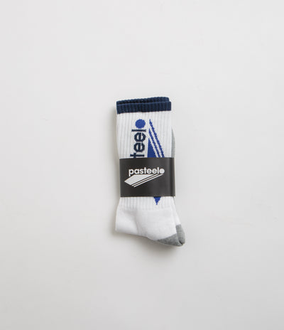 Pasteelo O.G. ATL Socks in White, Royal and Grey. Crew length and made from a cotton-polyester blend, these Pasteelo socks are designed with ribbed cuffs and contrasting underfoot panels. Finished in a shade of white with jacquard knit Pasteelo branding.